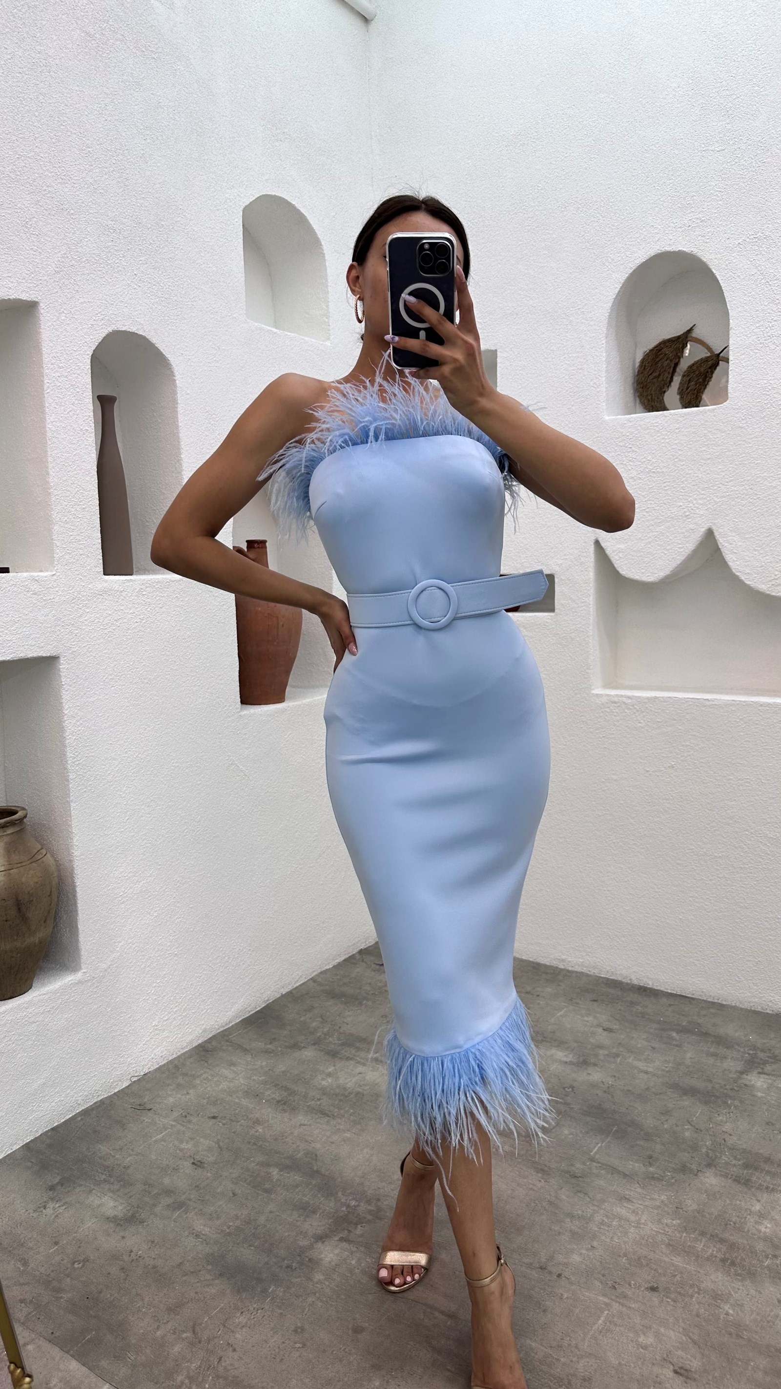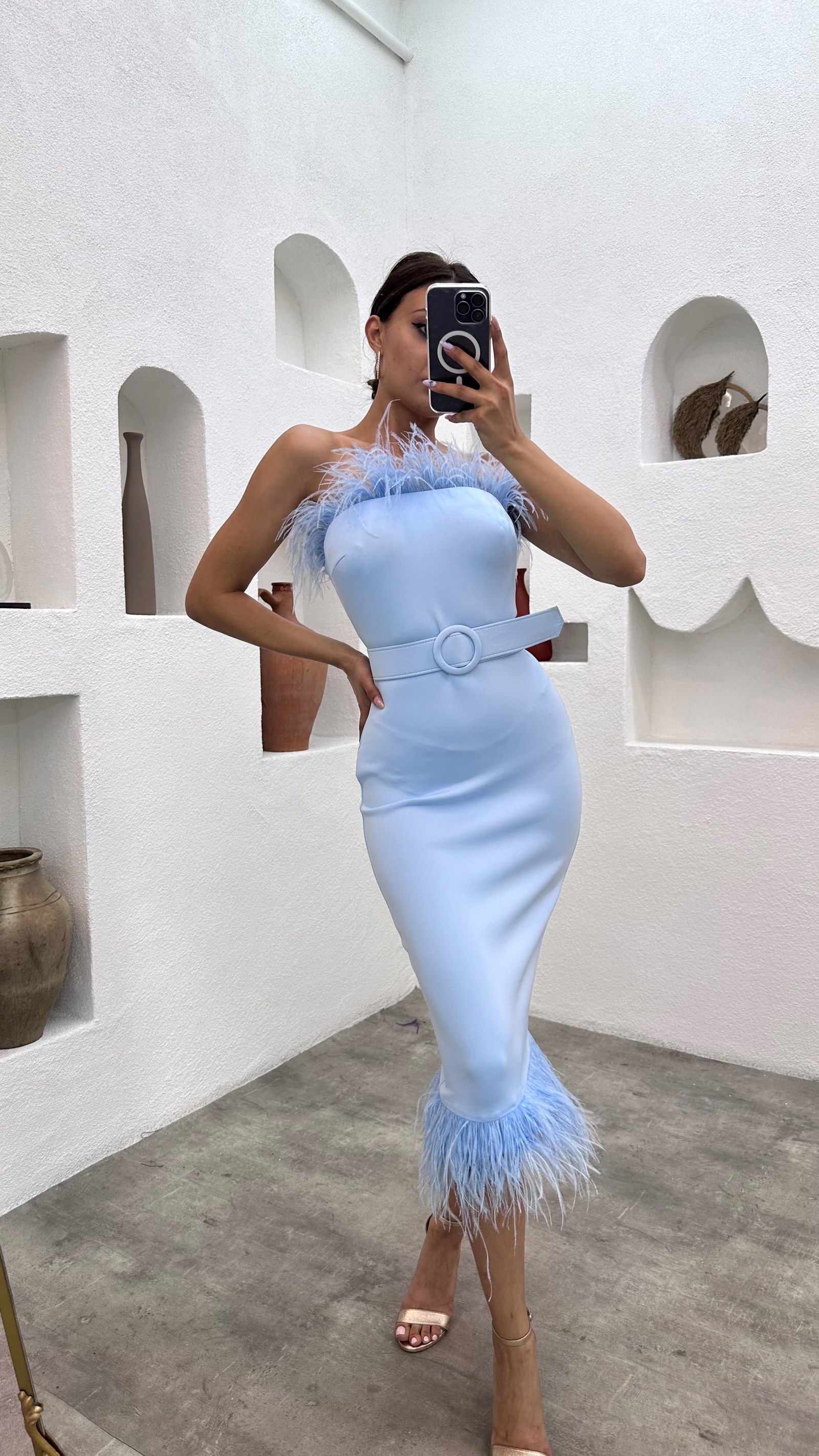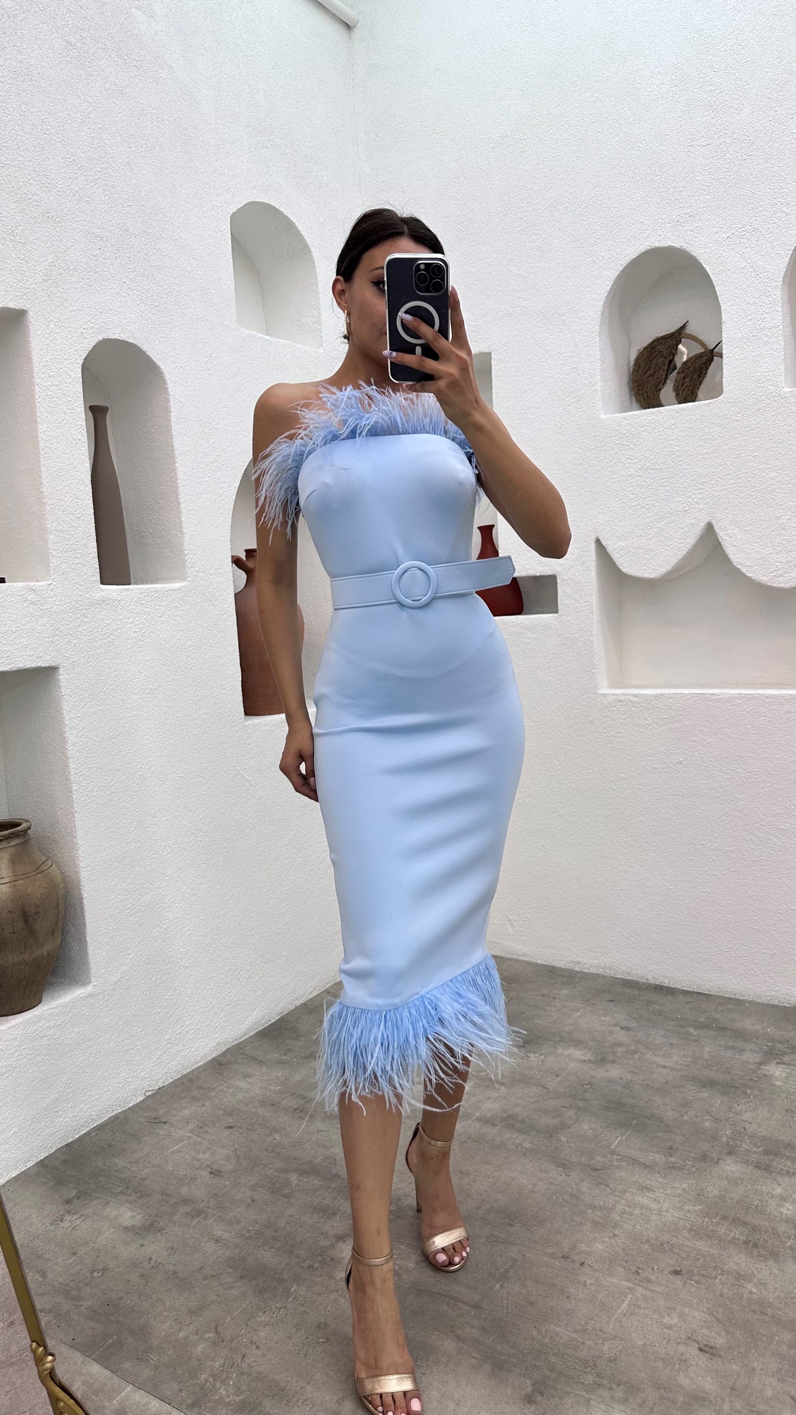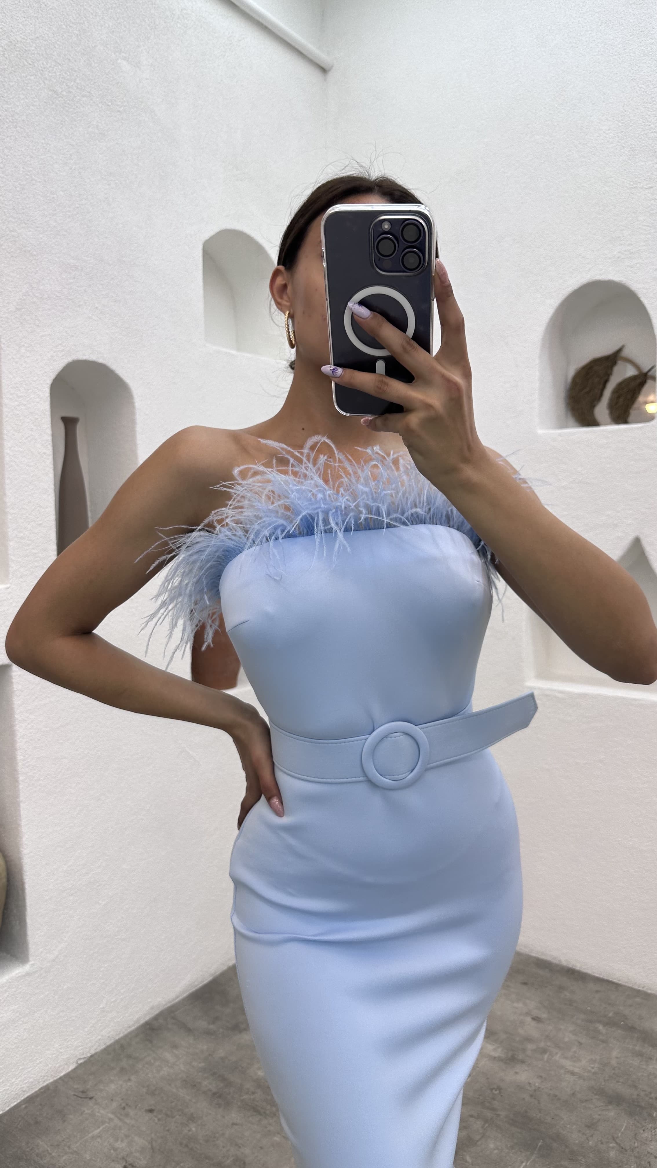 • Mavi Straplez Tüy Detay Kemerli Elbise