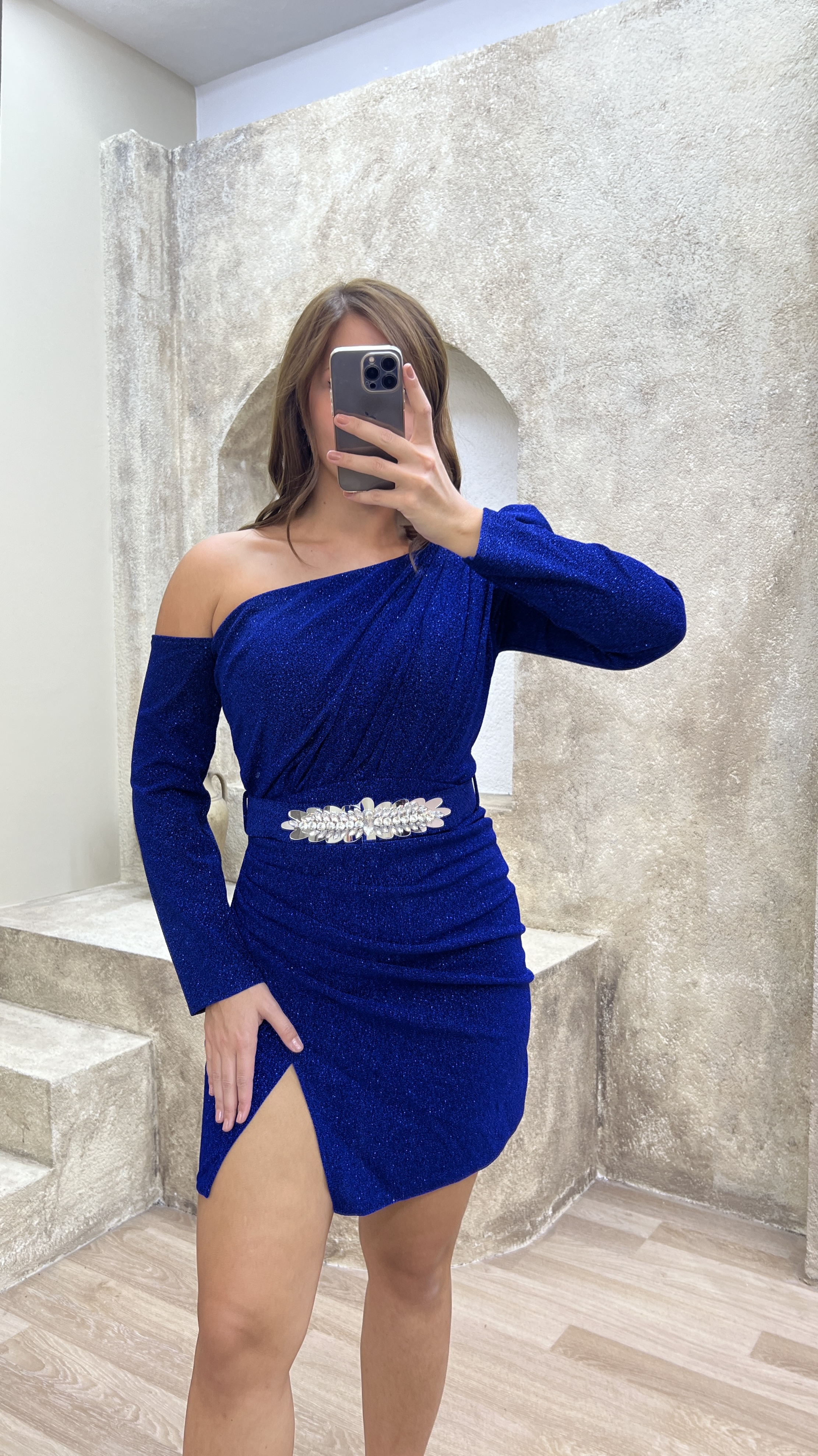• Saks Omuz Detay Simli Büyük Beden Abiye