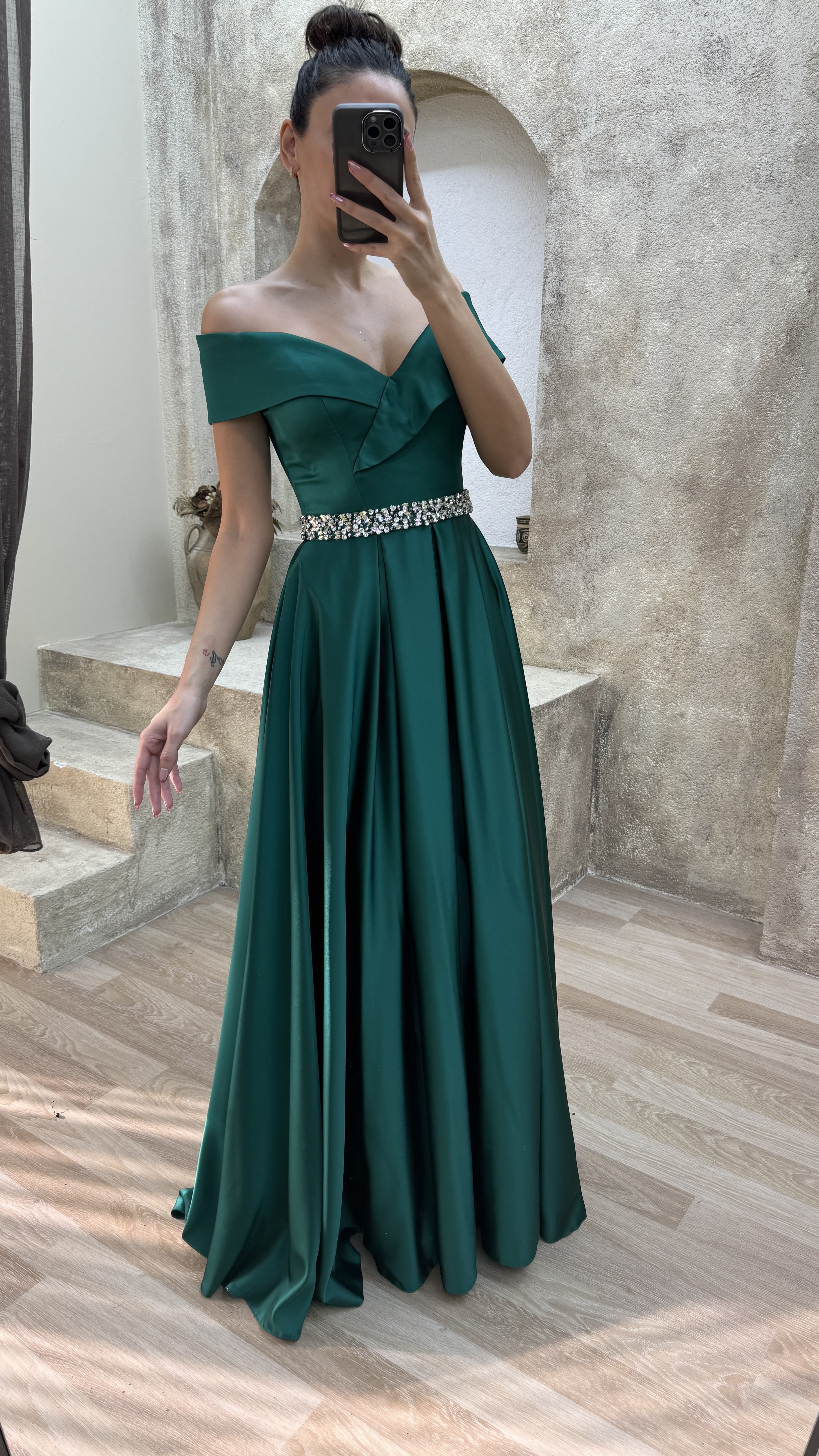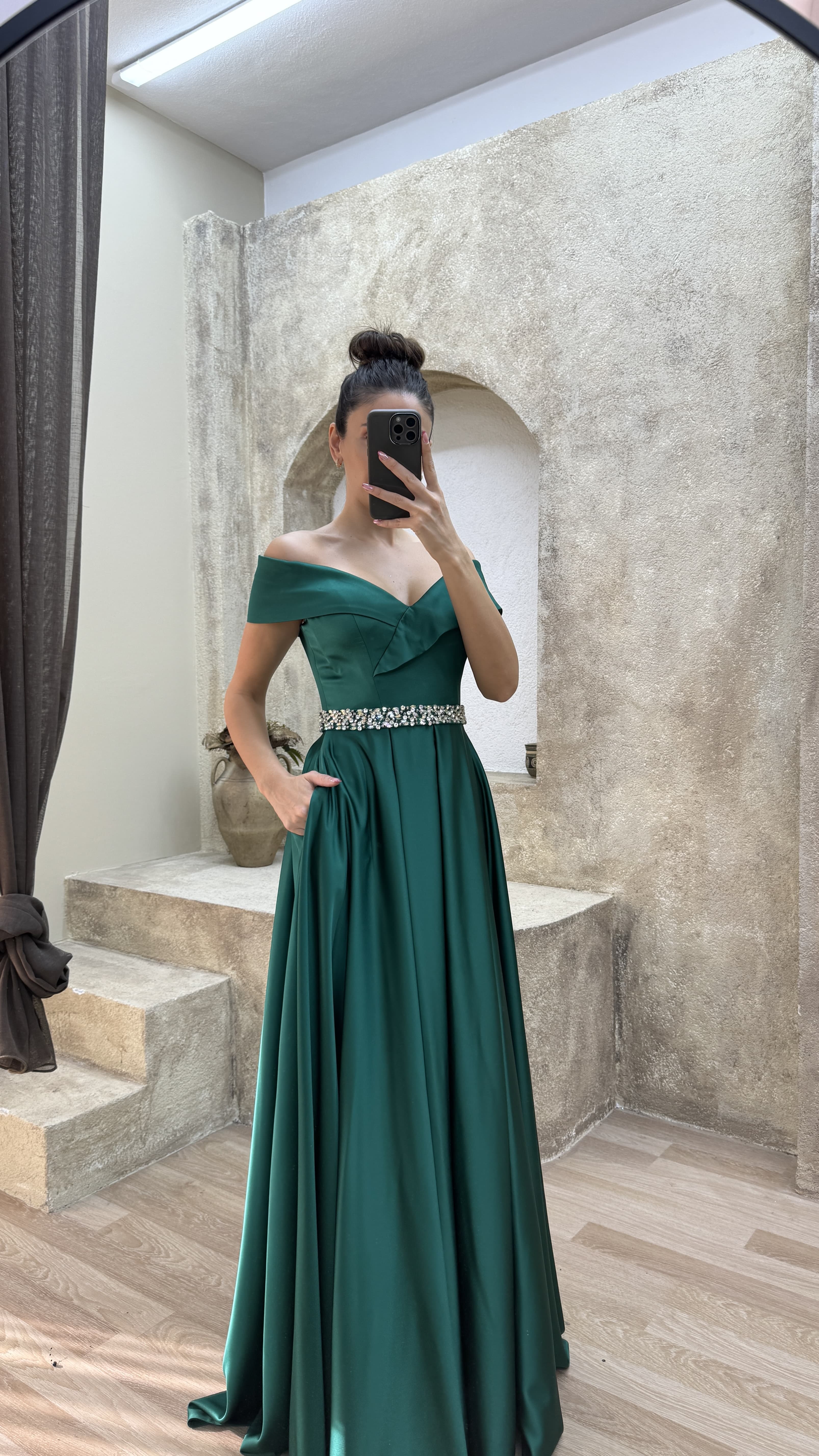 • Yeşil Kayık Yaka Tasarım Saten Abiye Elbise