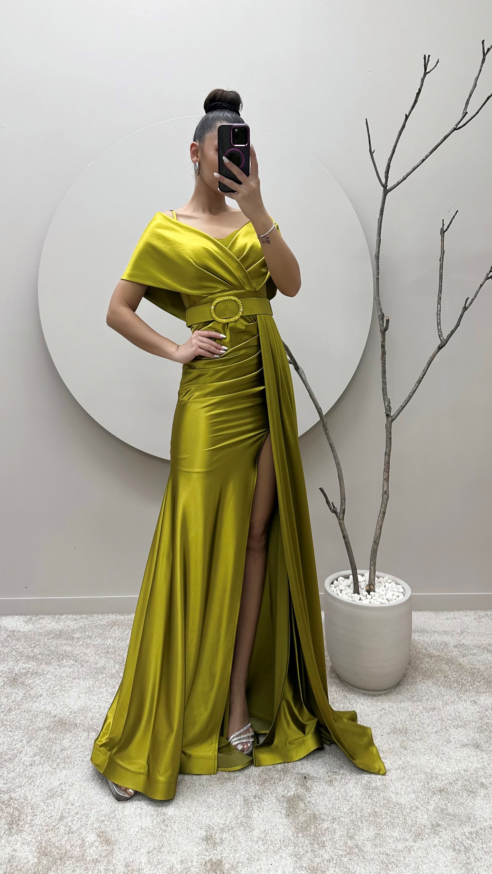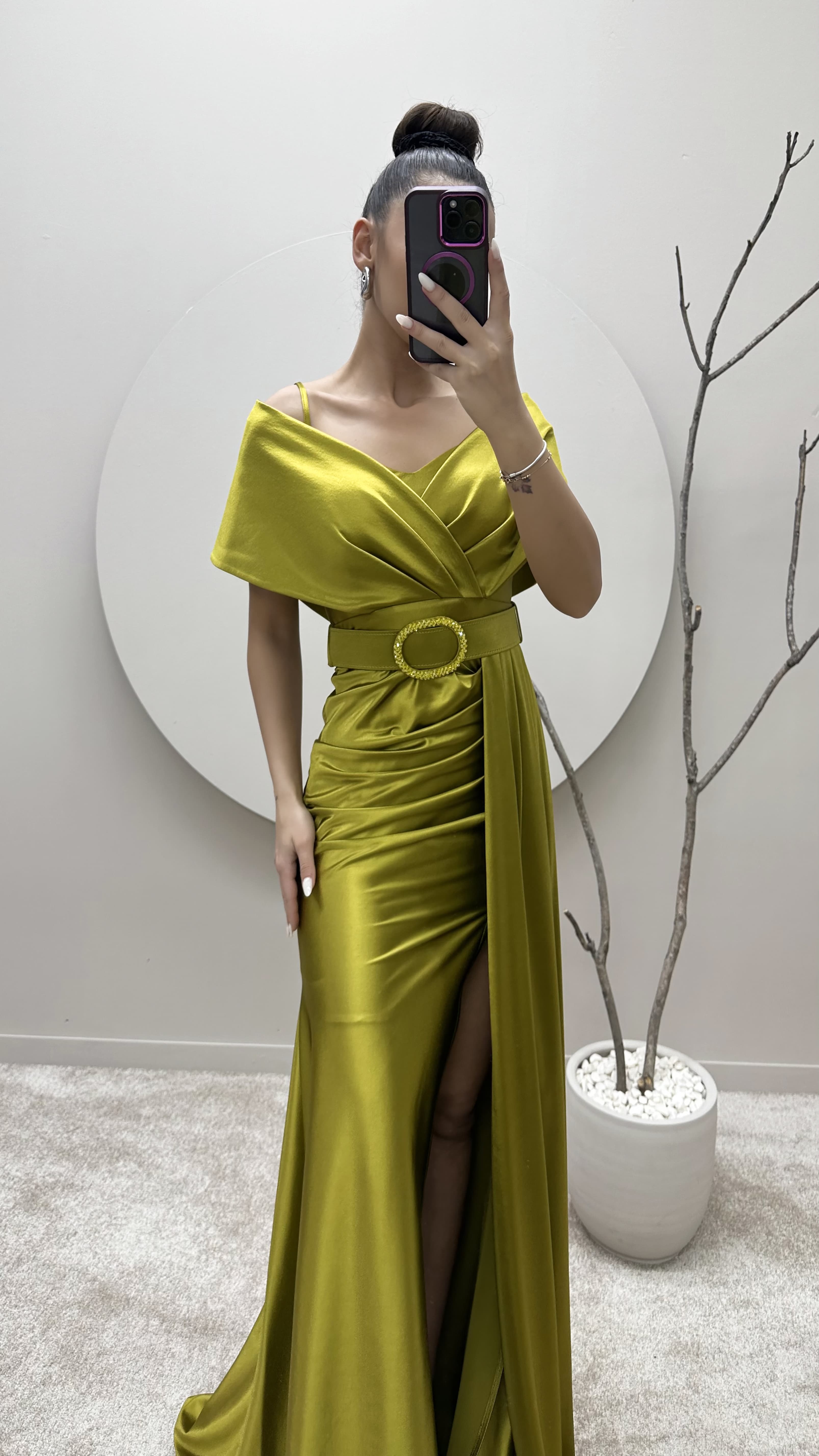 • Yeşil Kayık Yaka Kemerli Abiye Elbise