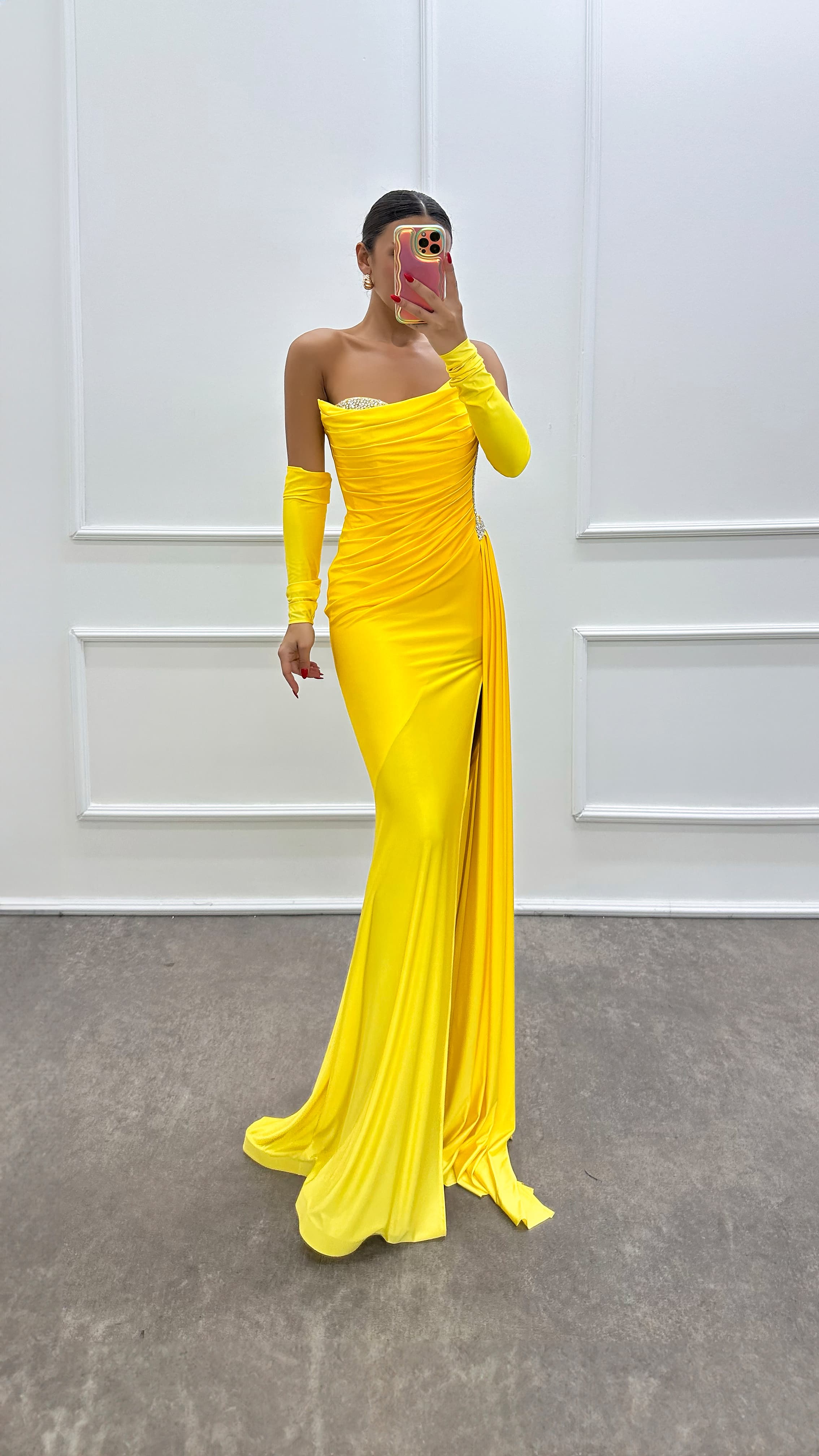 • Zümrüt Yeşili Straplez Taş Detay Abiye Elbise
