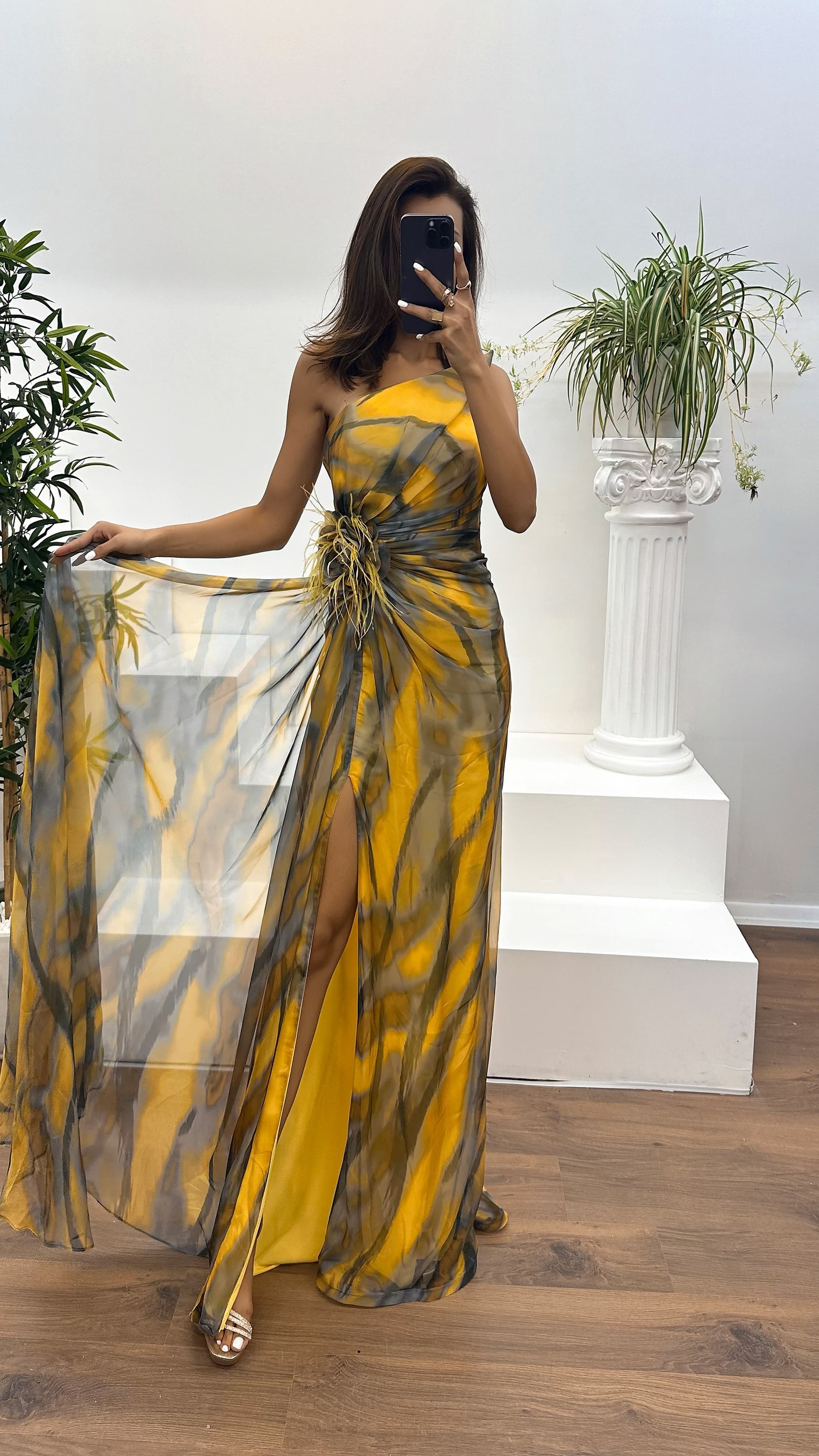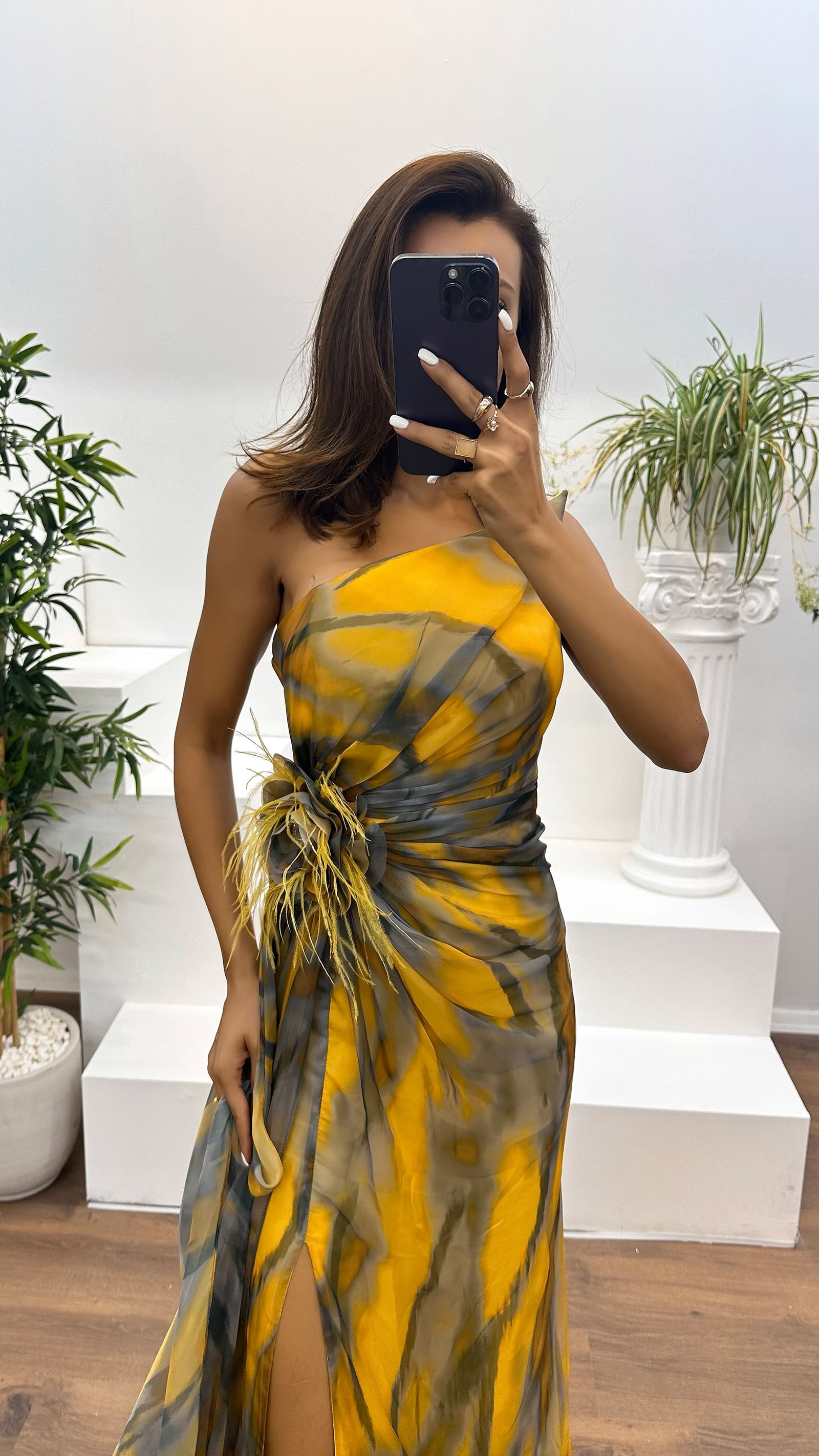 • Sarı Tek Omuz Beli Tüylü Gül Desenli Tasarım Elbise