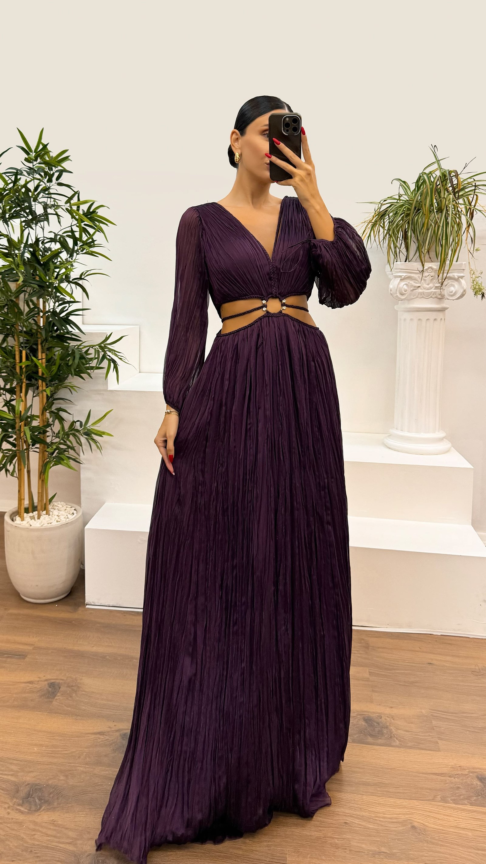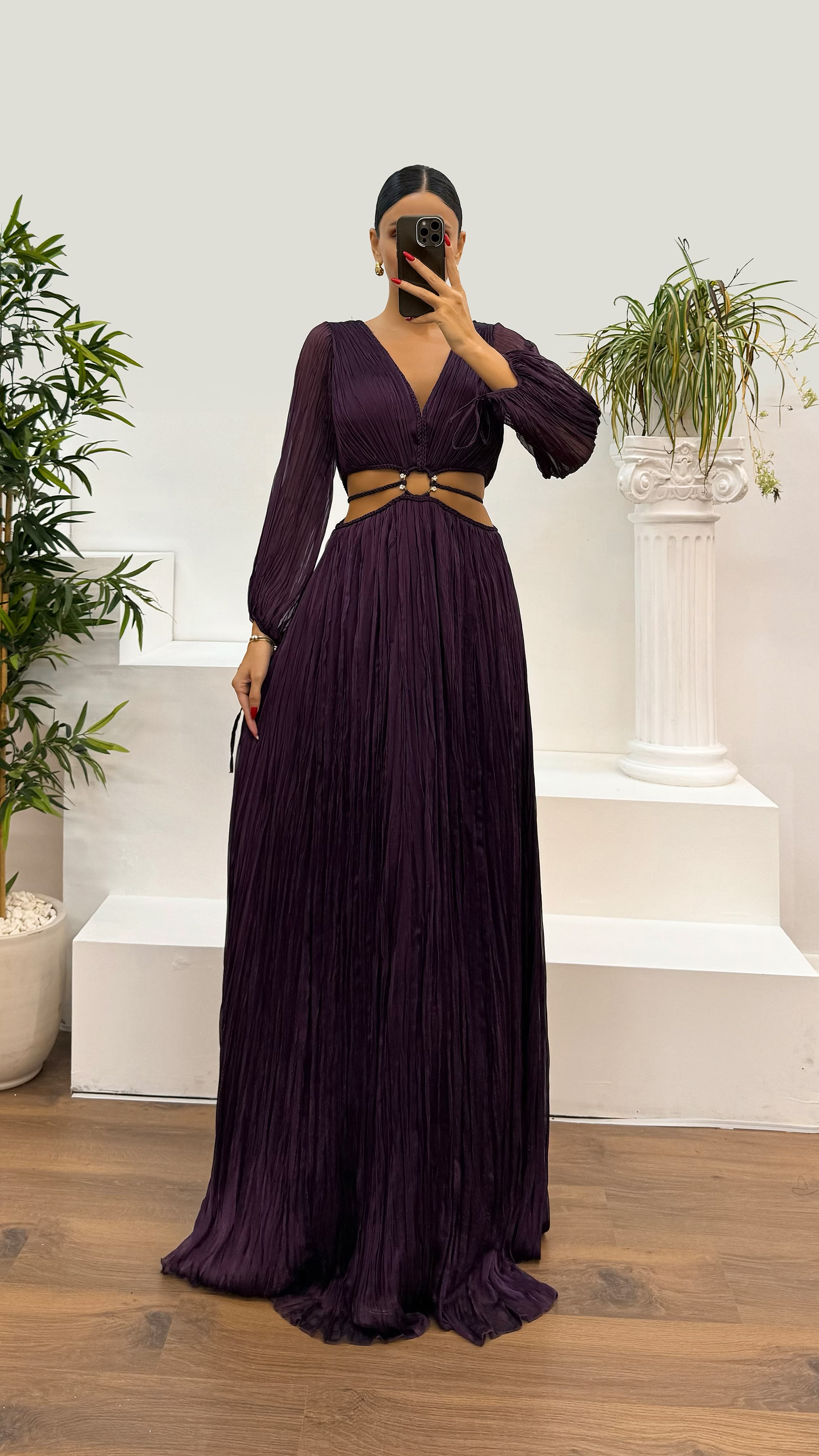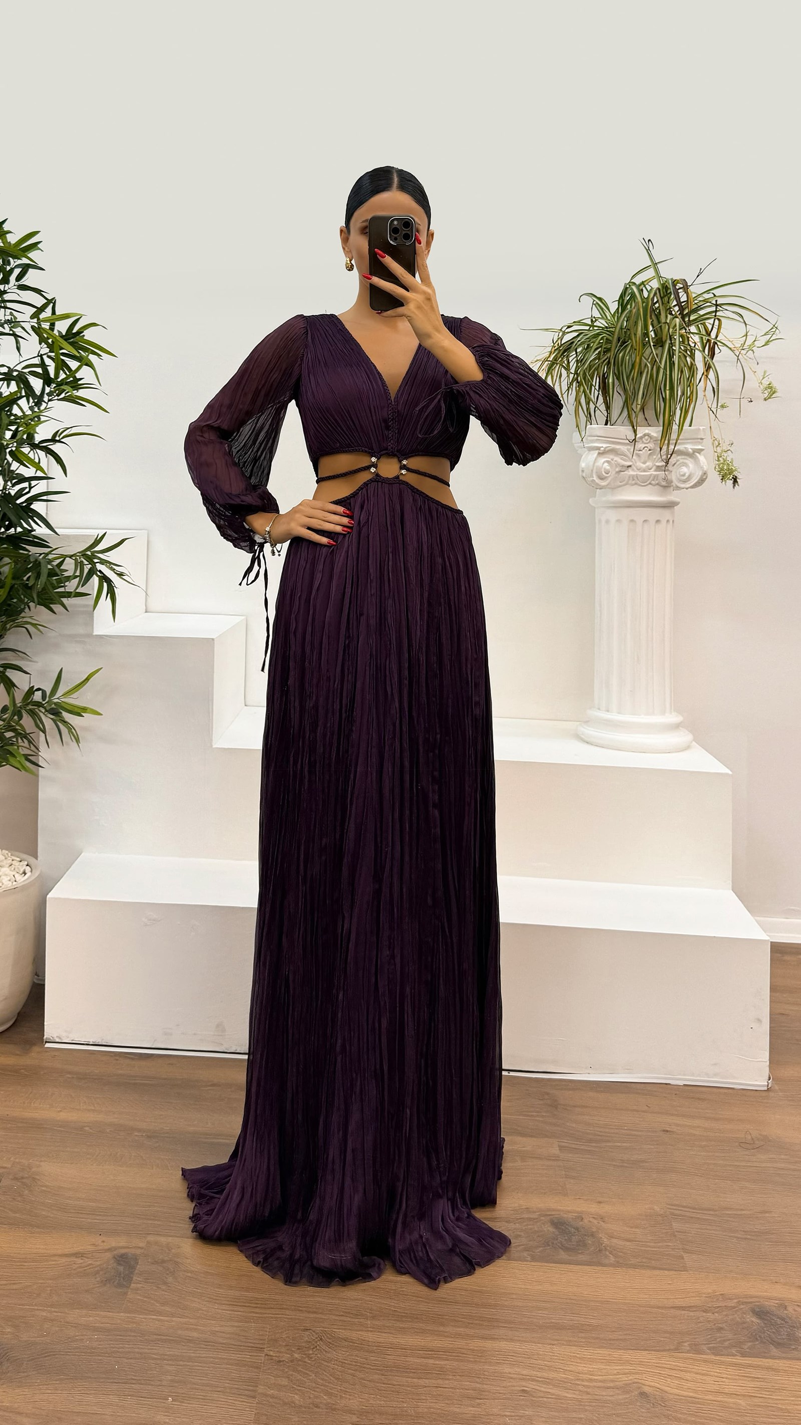 • Mavi Bel Detay Pliseli Abiye Elbise