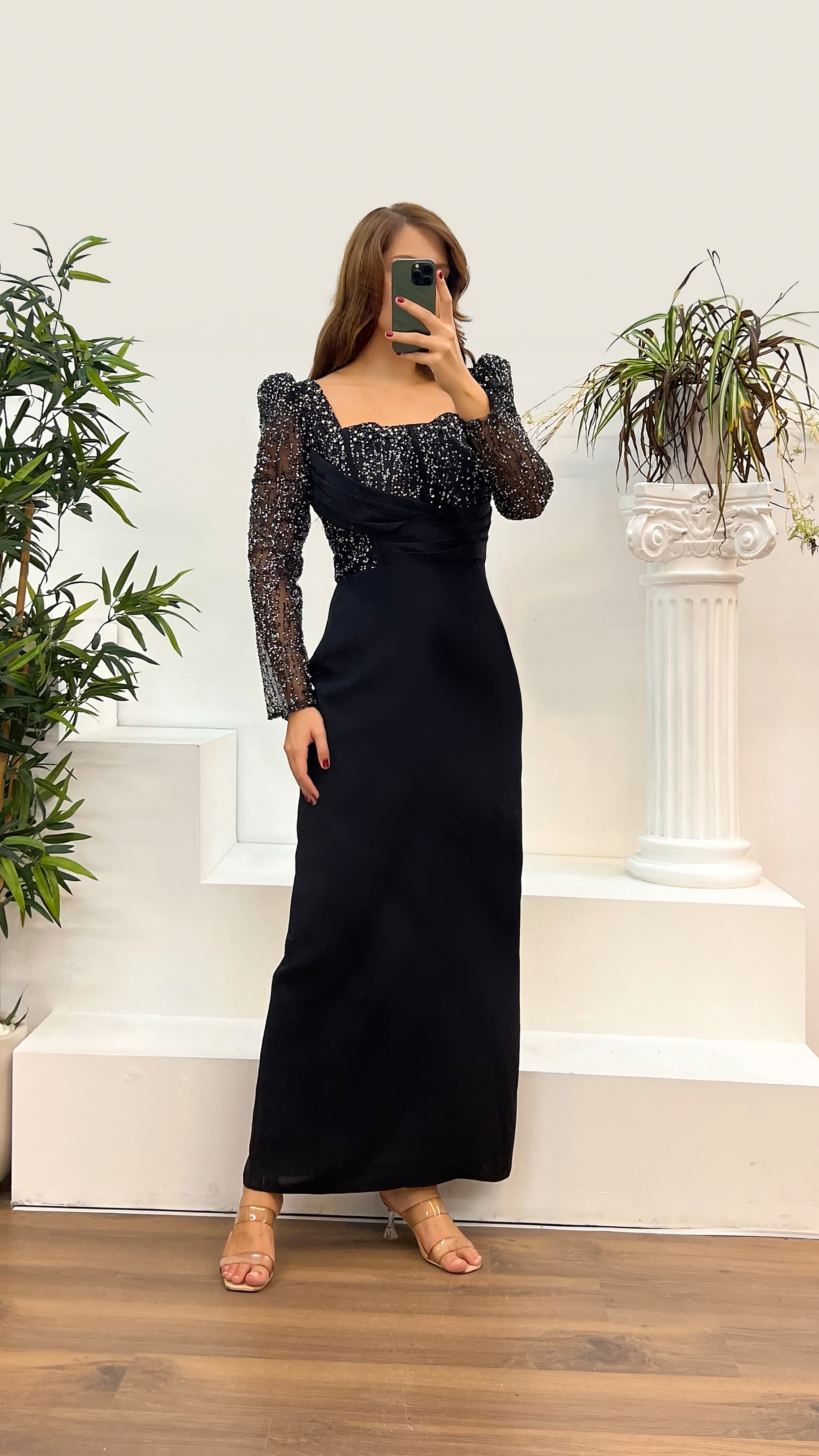 • Siyah İşleme Detay Büyük Beden Saten Abiye Elbise