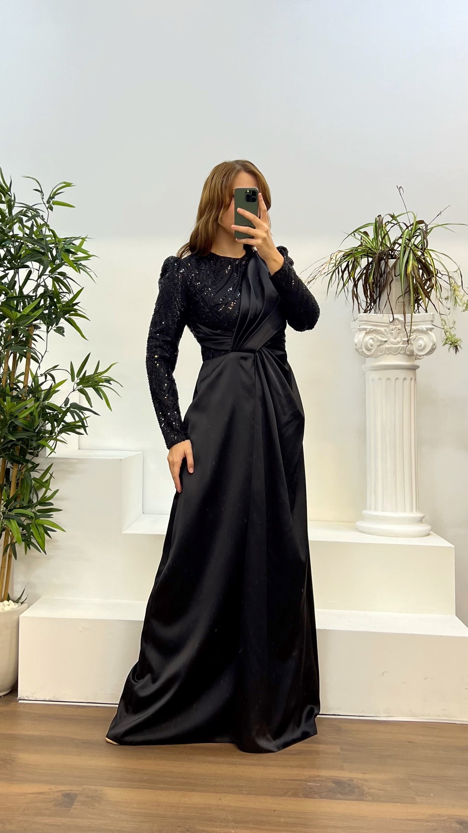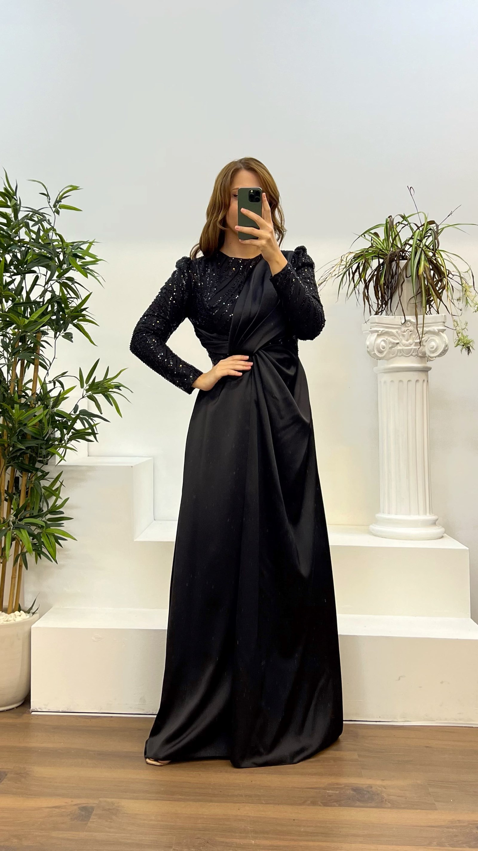 • Siyah Yuvarlak Yaka İşlemeli Saten Büyük Beden Abiye Elbise