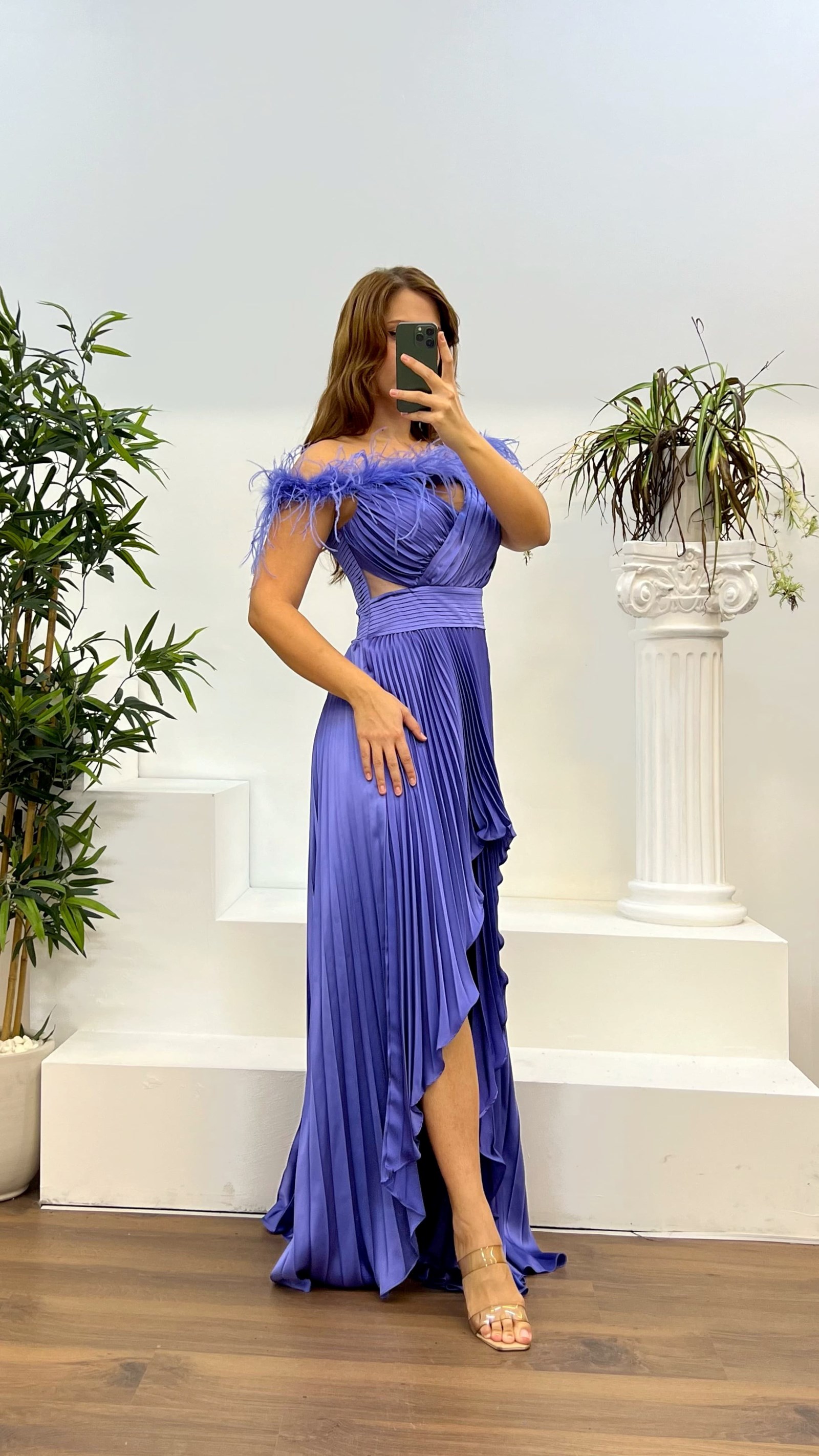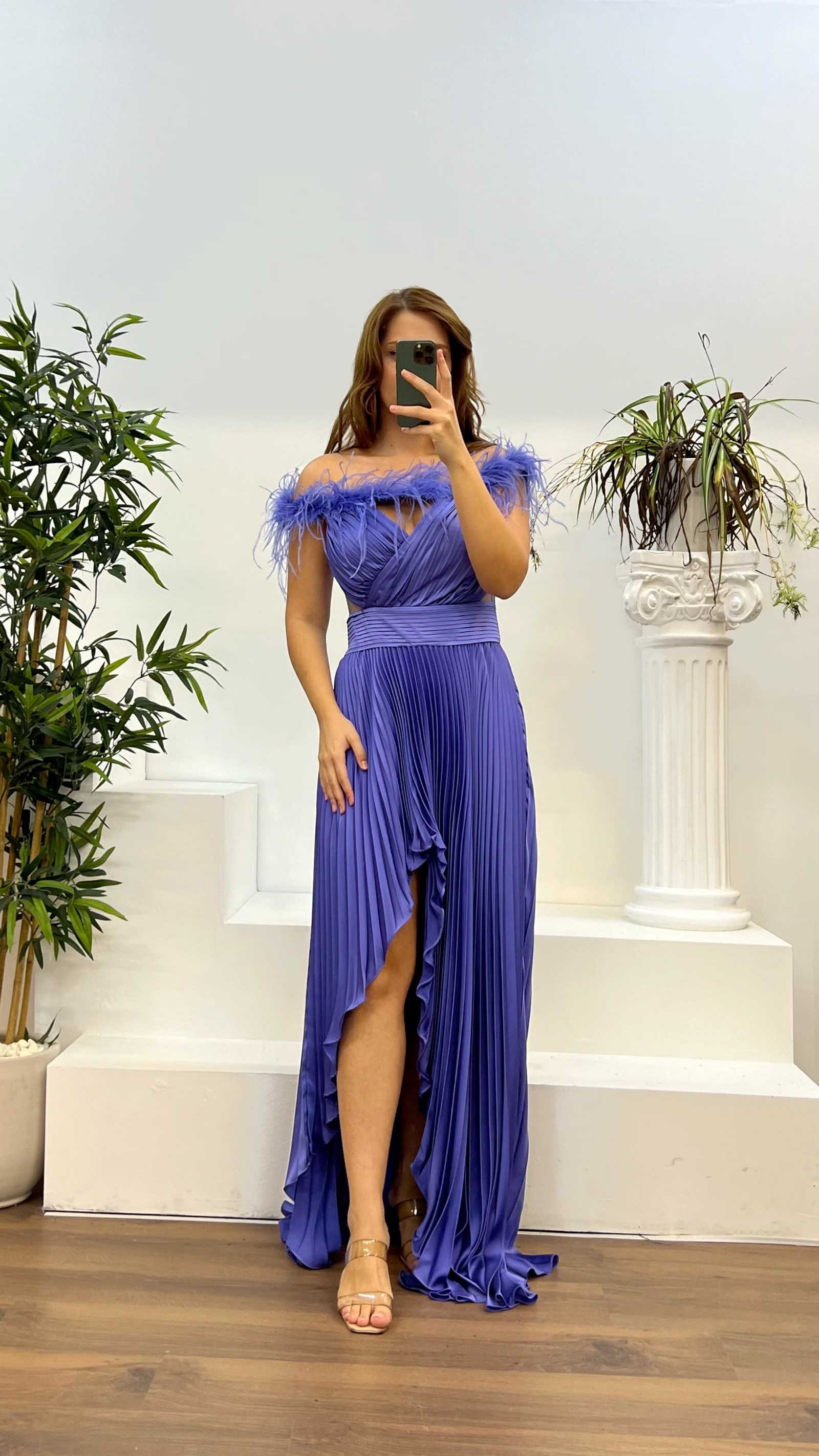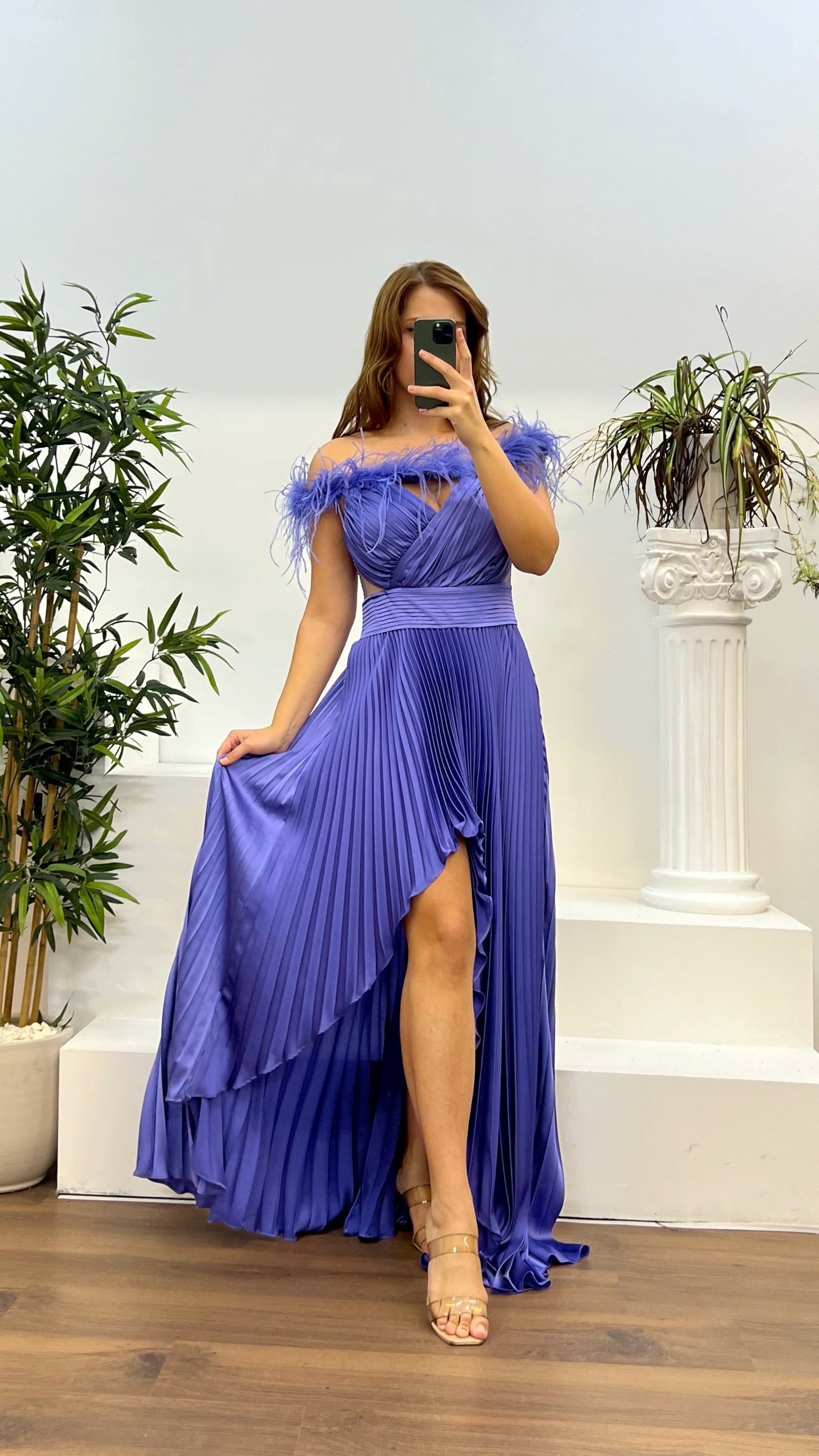 Mor Yaka Tüylü Piliseli Büyük Beden Abiye Elbise