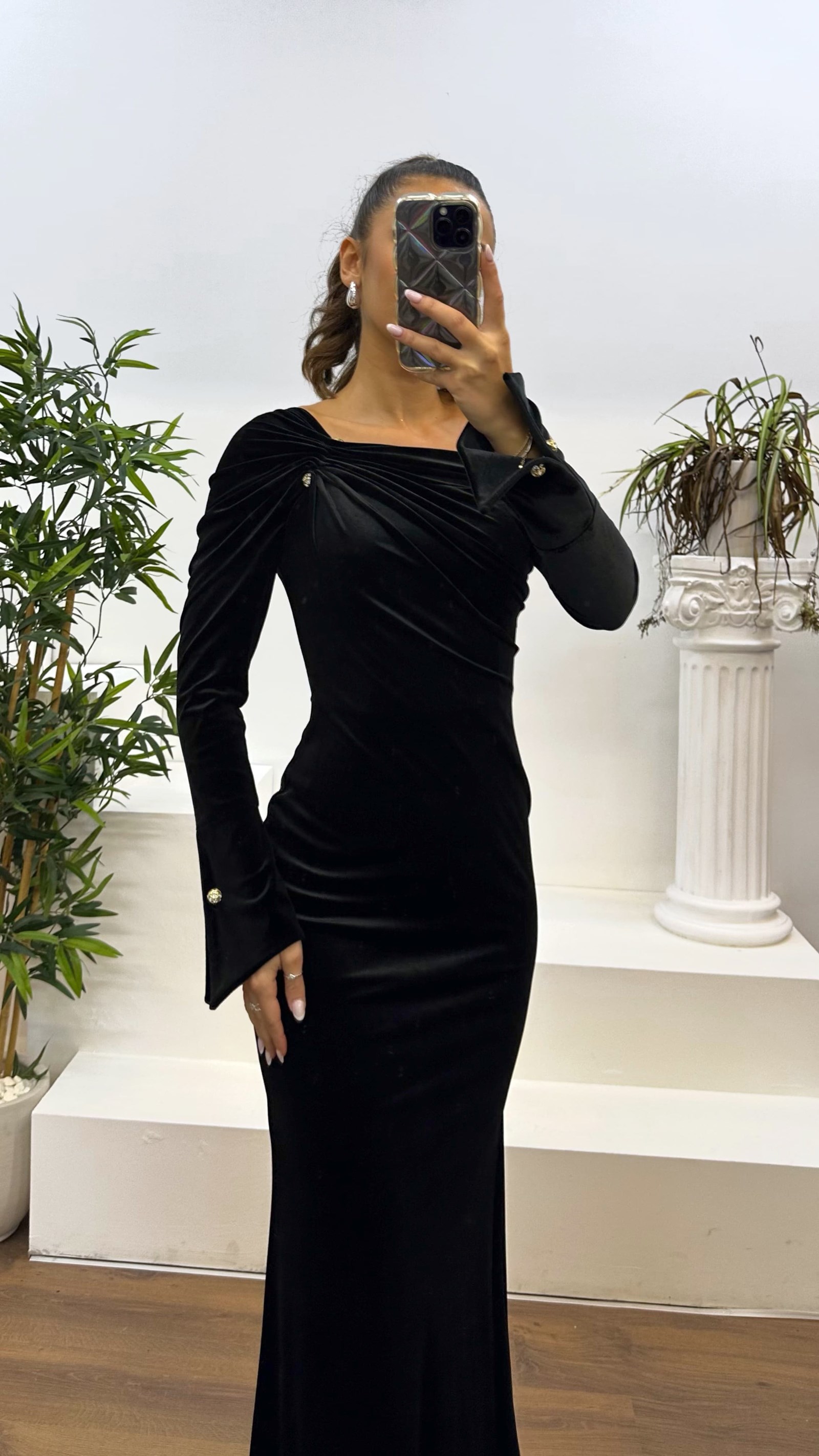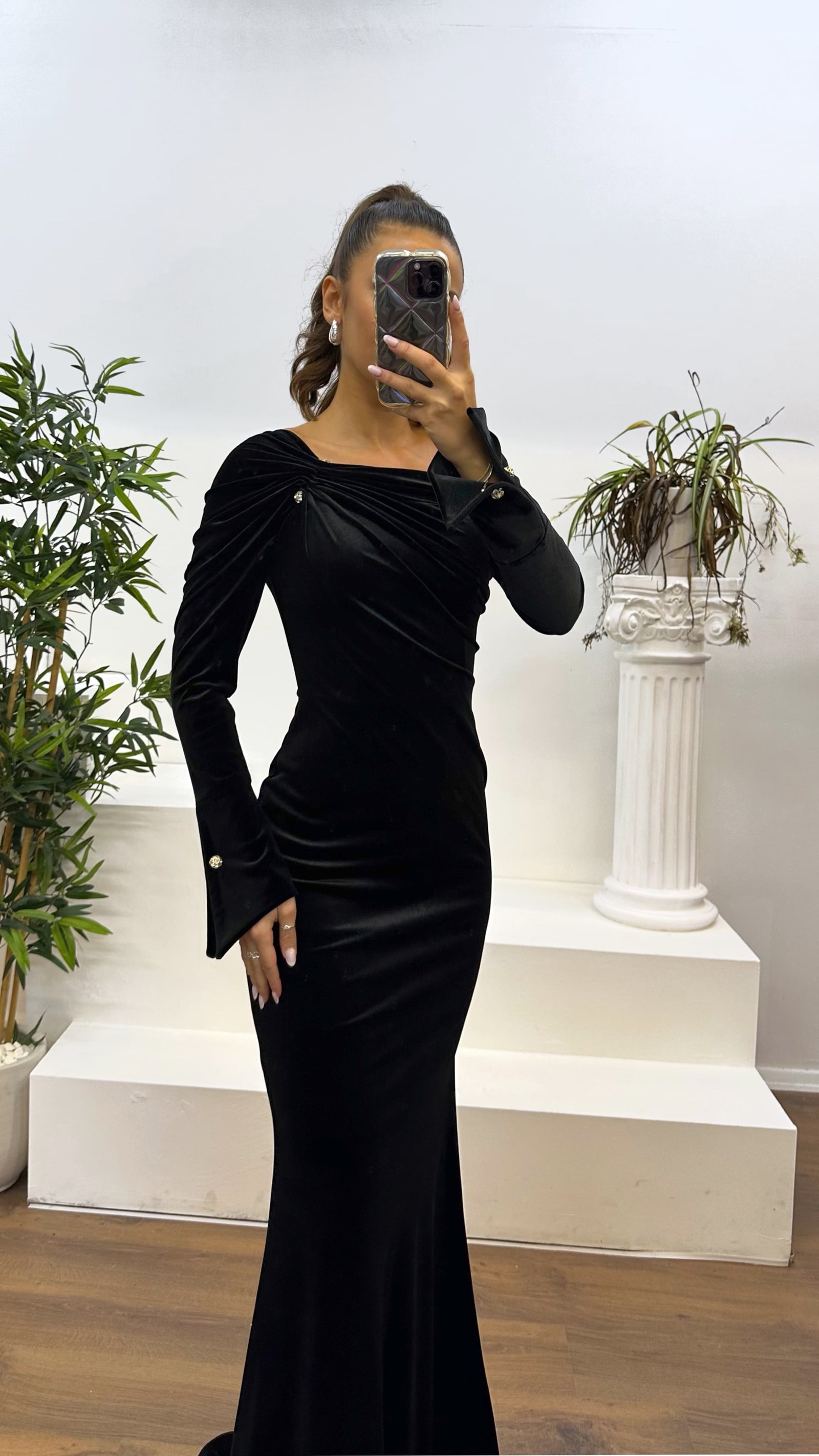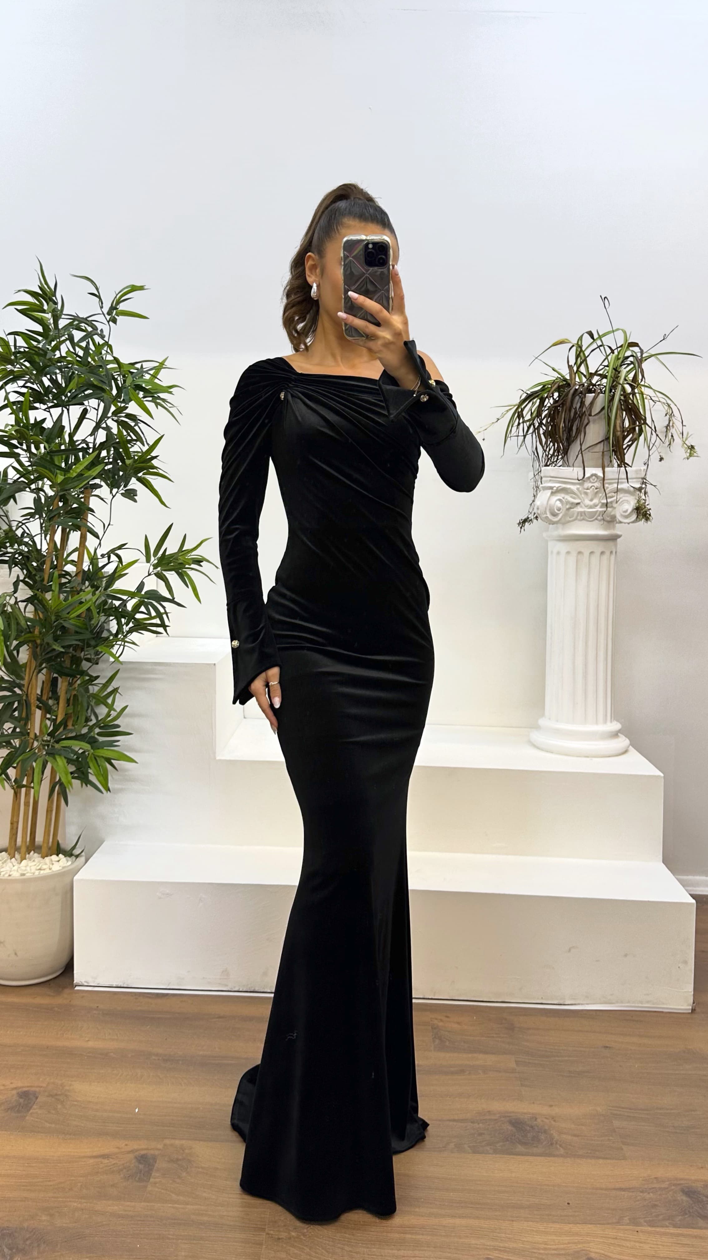 • Siyah Kayık Yaka Kadife Abiye Elbise