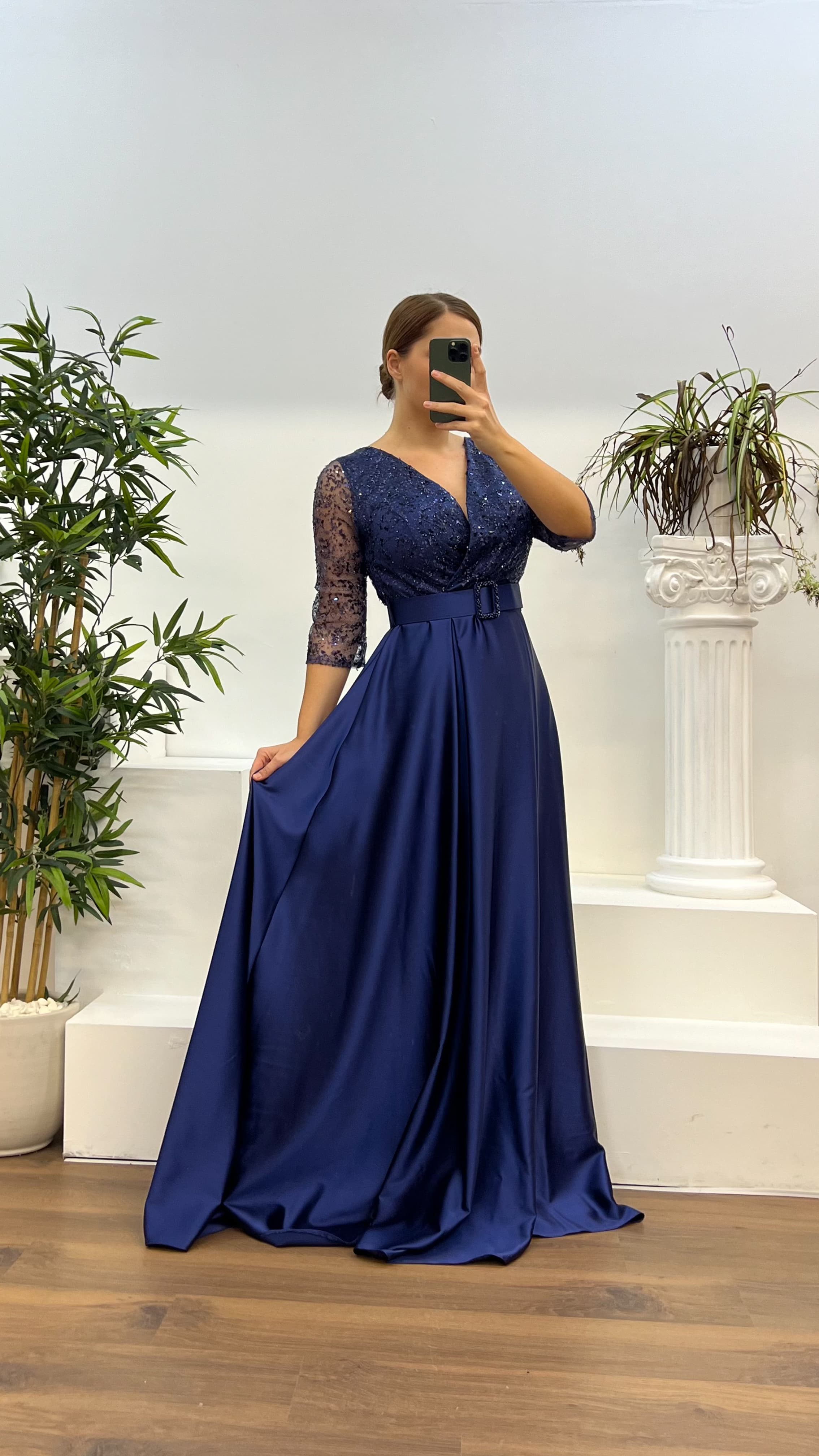 • Lacivert V Yaka İşlemeli Saten Büyük Beden Elbise