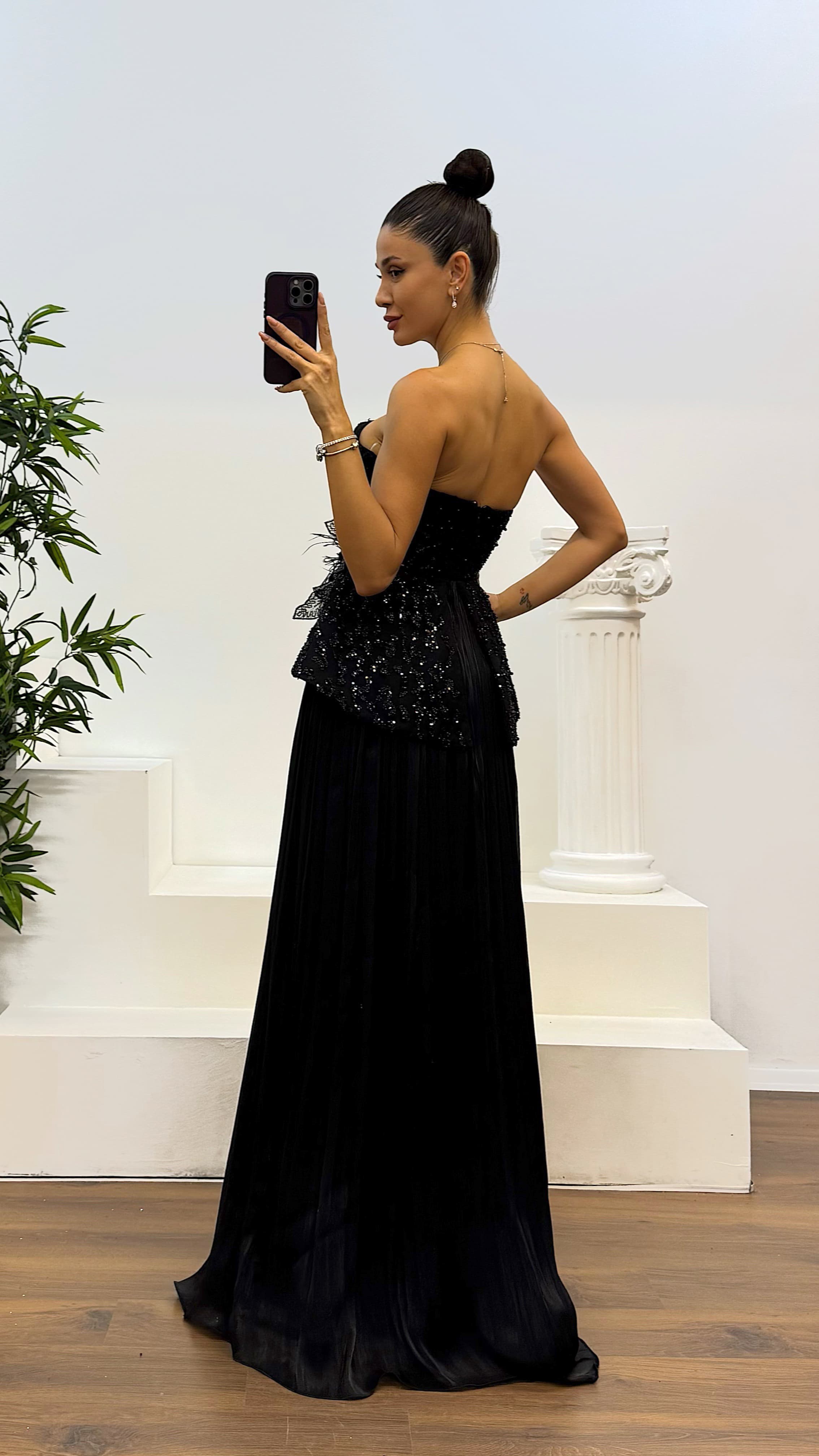 Strapless pleated embroidered evening dress The product is suitable for sizes 36-42, with breast pads, lined, back zipper closure, embroidered, and pleated. The length of the product is 160 cm. Fabric type: chiffon 66% viscose, 34% polyester.
