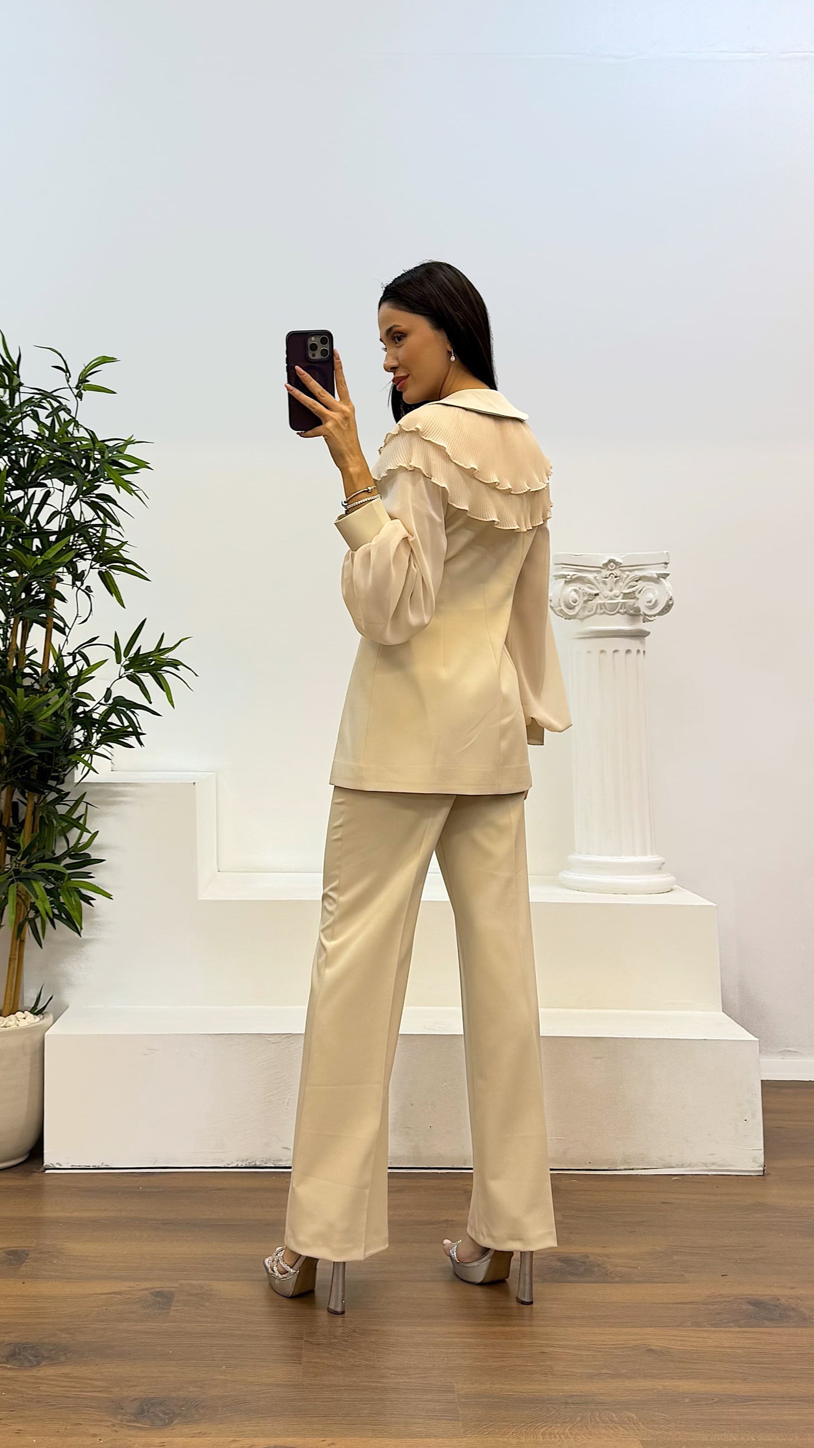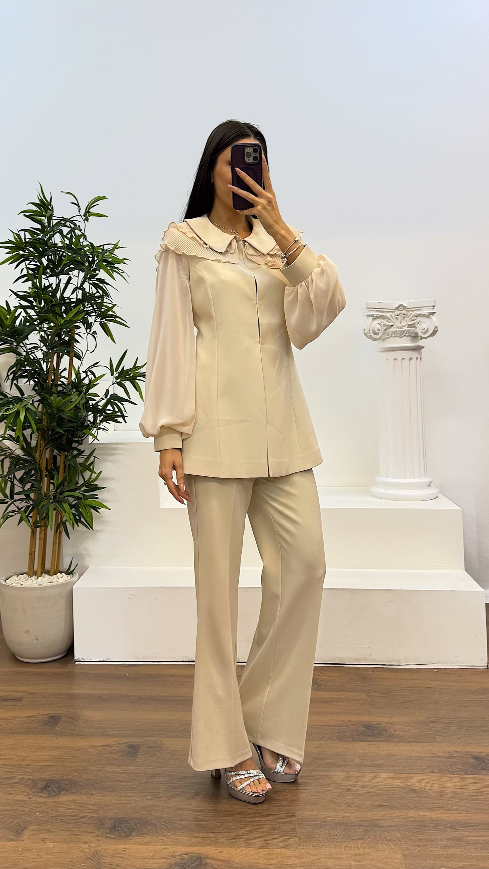 The product is suitable for sizes 36-46, lined, with a zipper, hook-and-eye closure on the jacket, and designed as a baby collar suit. The product length is 100 cm. The product sleeve length is 60 cm. Fabric type: Atlas 100% polyester - Chiffon 66% viscose, 34% polyester.