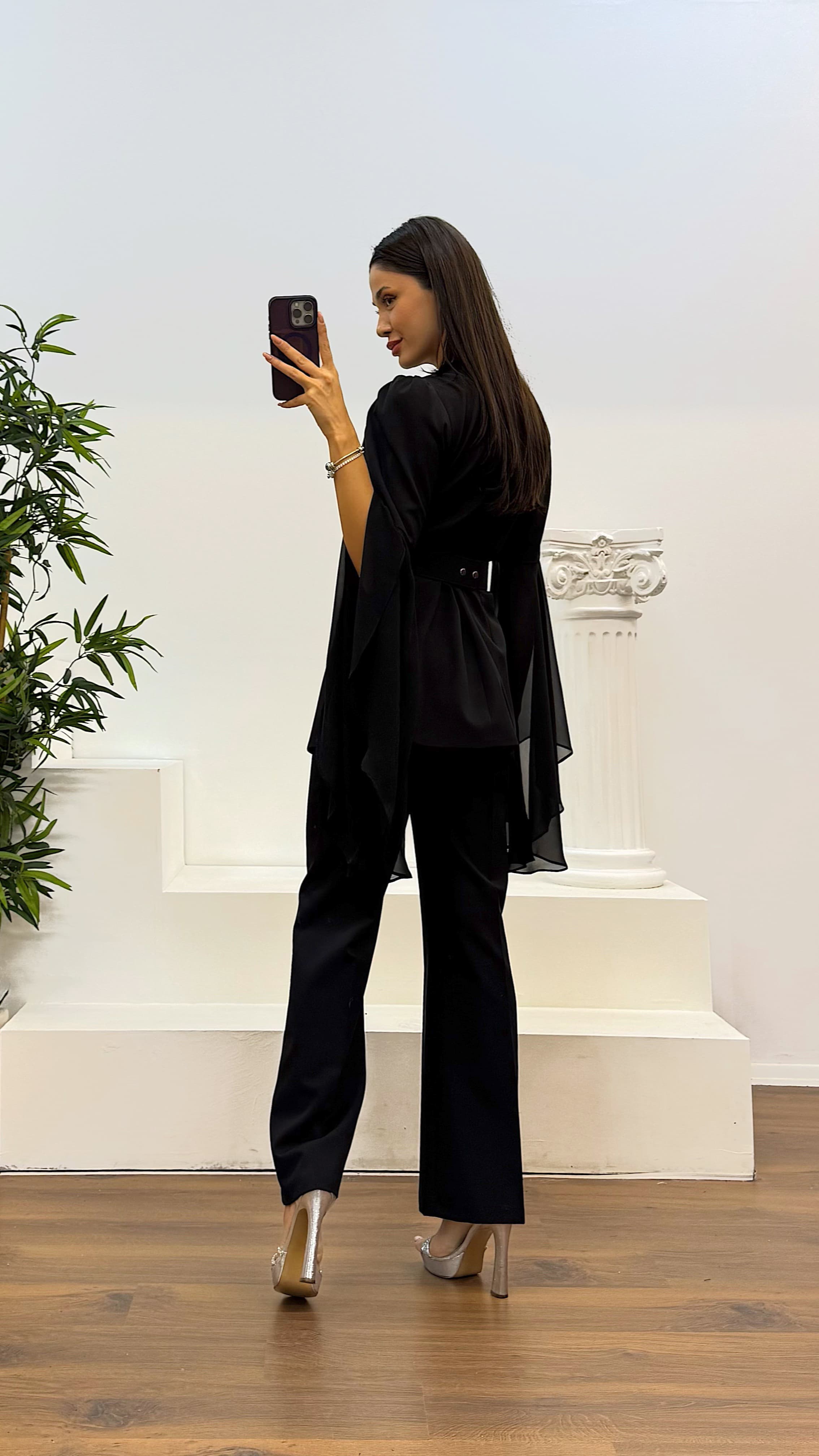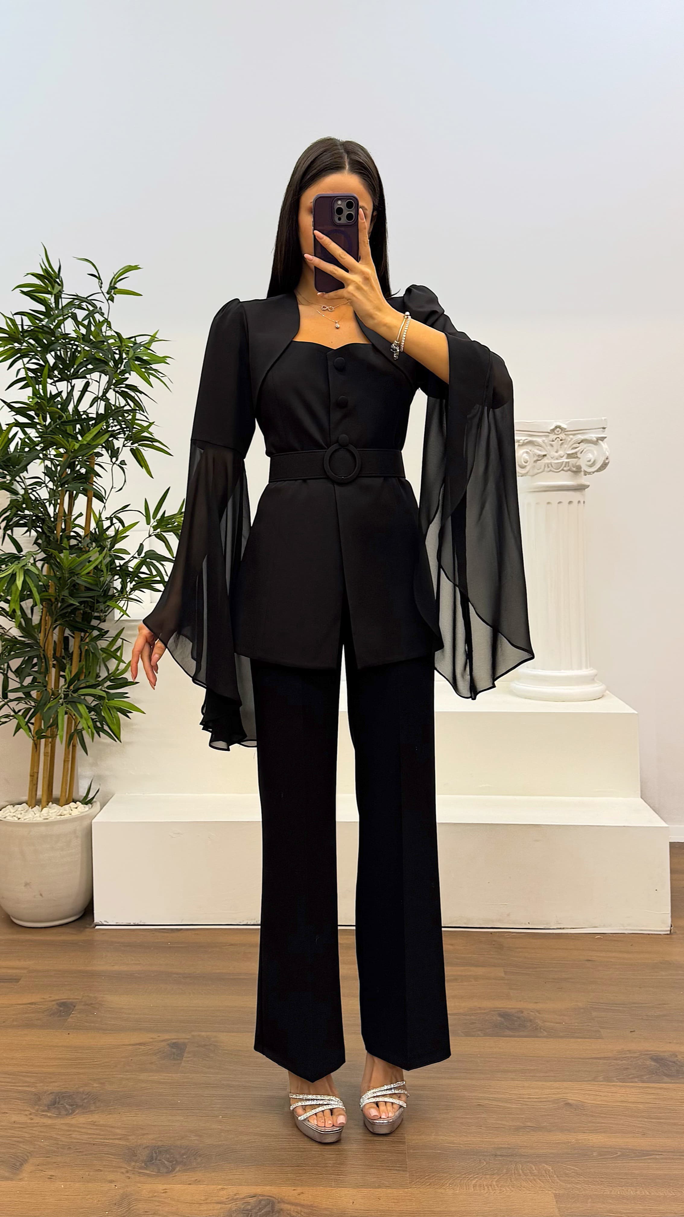 Evening Dress Set with Chiffon Details The product is compatible with sizes 36-46, featuring padded cups, lined, with a zipper, removable belt, jacket with button closure, designed as an evening dress set with chiffon details. Product length: 100 cm Product sleeve length: 60 cm Fabric type: 100% polyester - chiffon 66% viscose 34% polyester