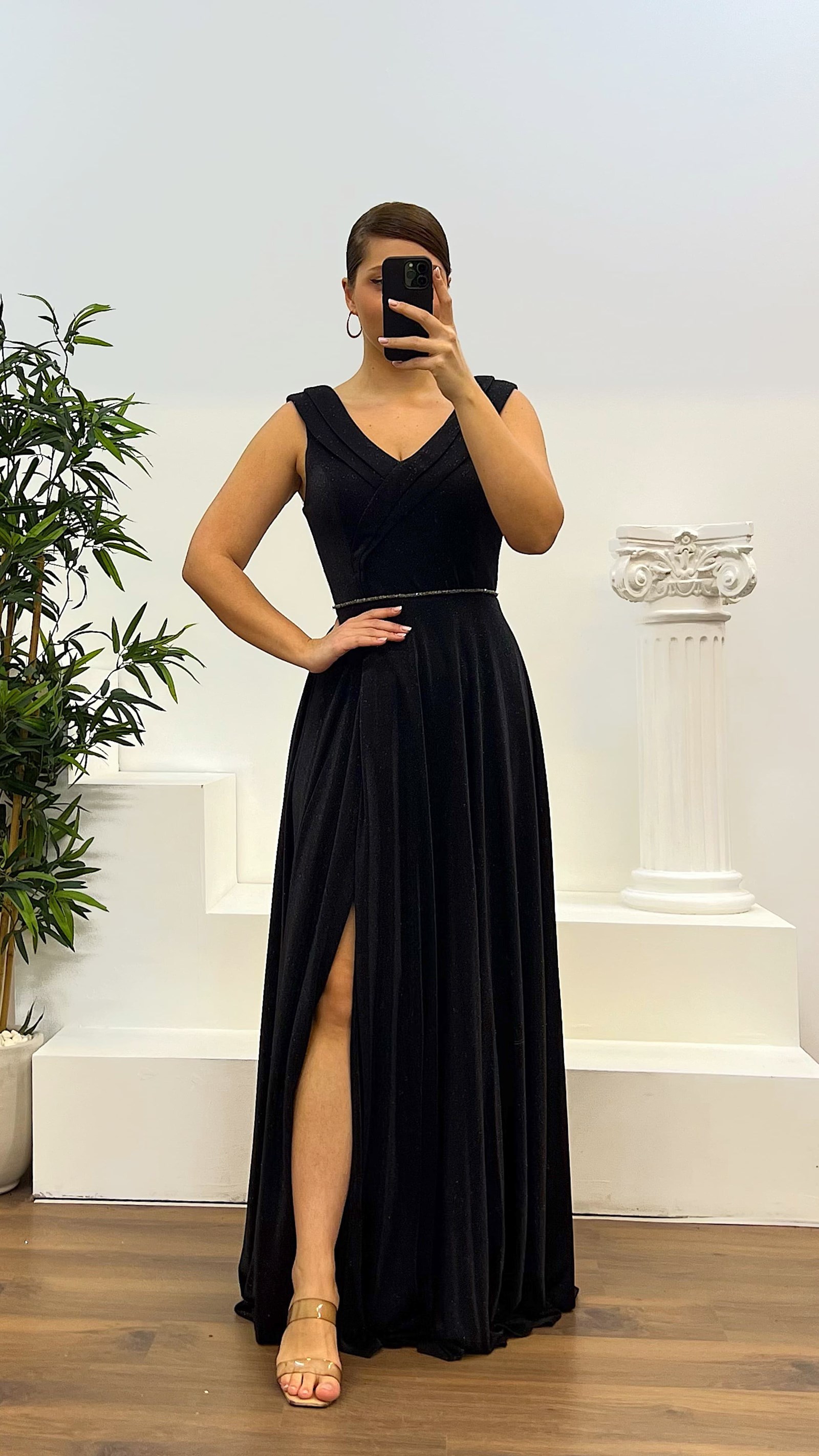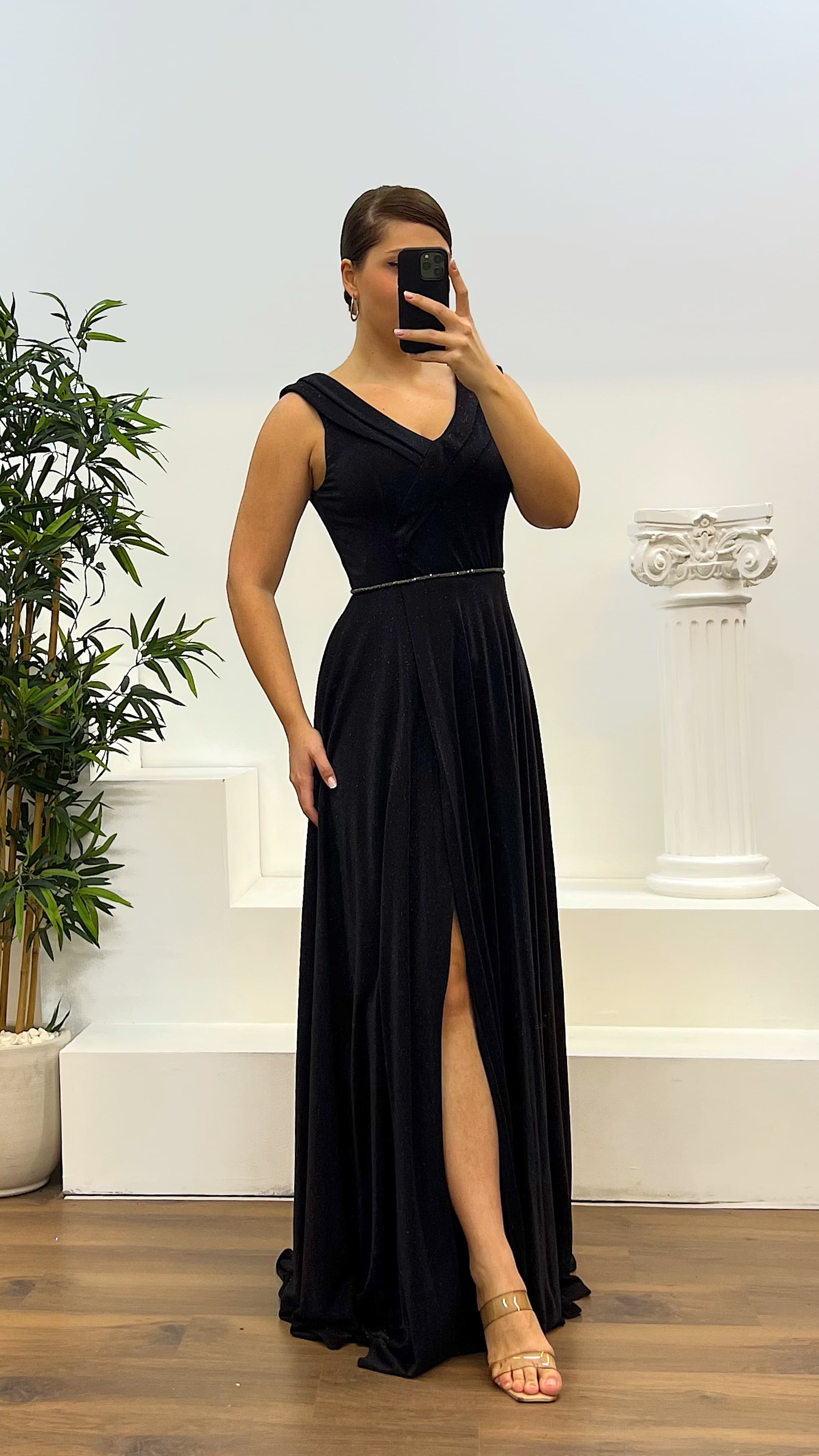 V-neck waist detail evening dress The product is compatible with sizes 44-48, features padded cups, is lined, has a back zipper closure, a slit, and is designed as an evening dress with waist details. Product length: May vary between 165-170 cm. Fabric type: Glittery atlas , 100% polyester