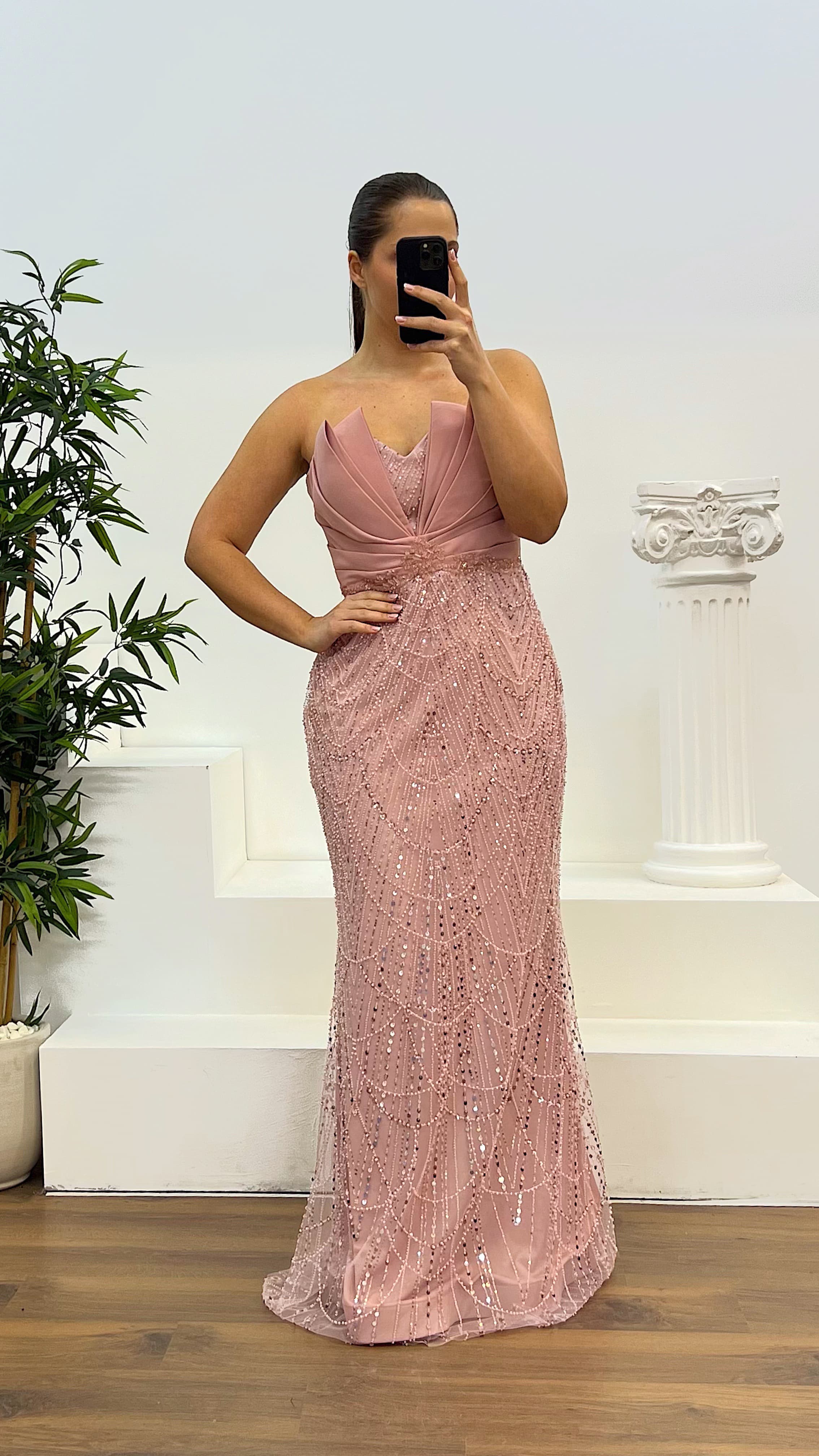 Strapless Embroidered Design Evening Dress The product is suitable for sizes 46-50, with a built-in bra, lined, featuring a back zipper closure, and designed as an embroidered evening dress. The length of the product is 160 cm. Fabric type: embroidered tulle, 3% lycra, 97% polyester.