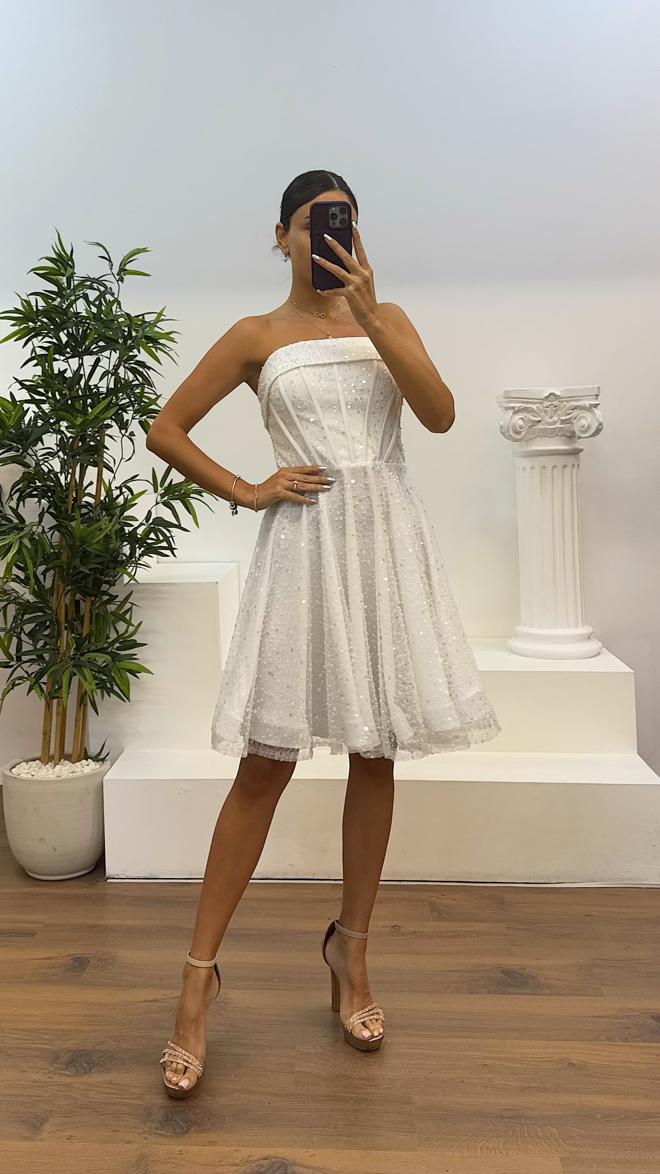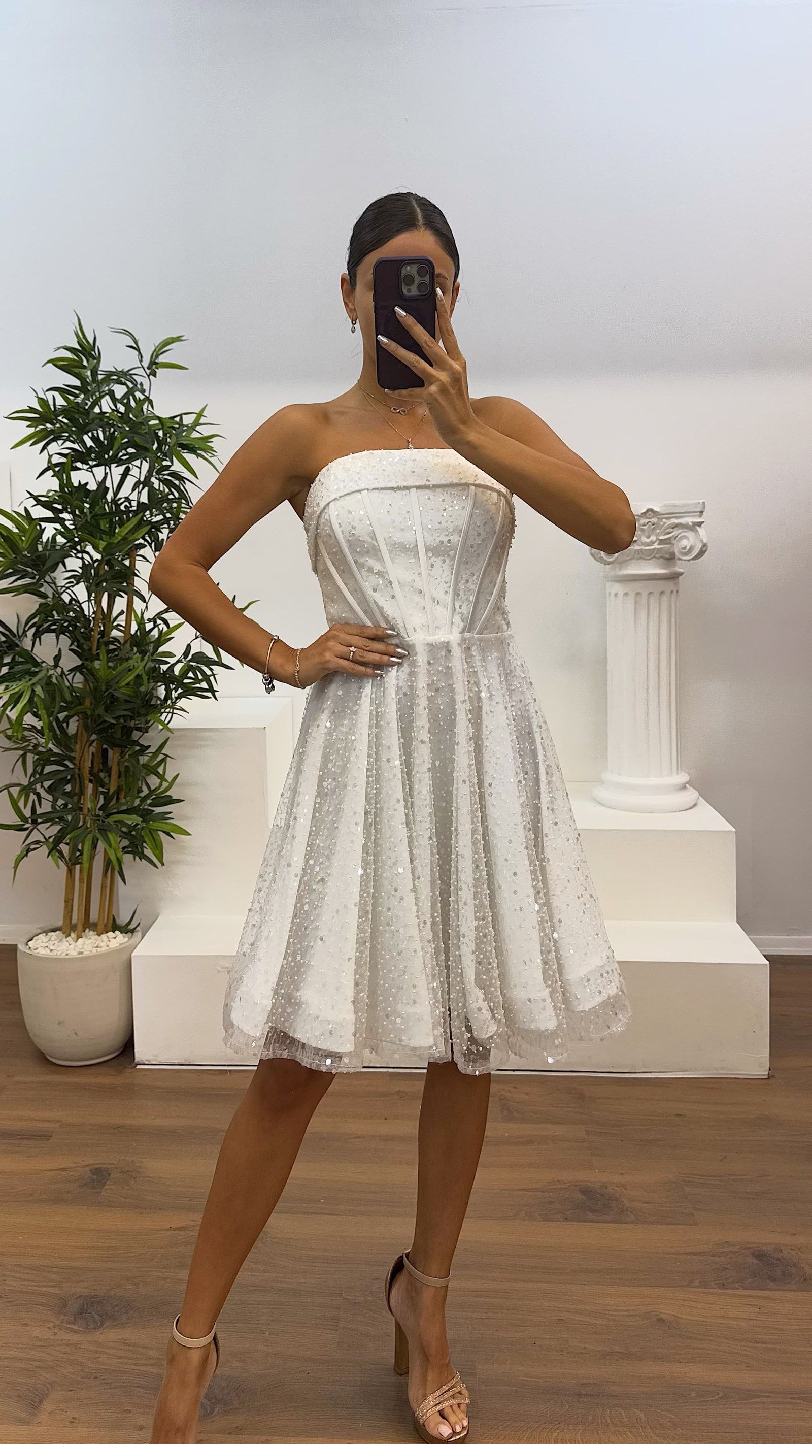 • Beyaz Straplez Boncuklu Mini Abiye Elbise