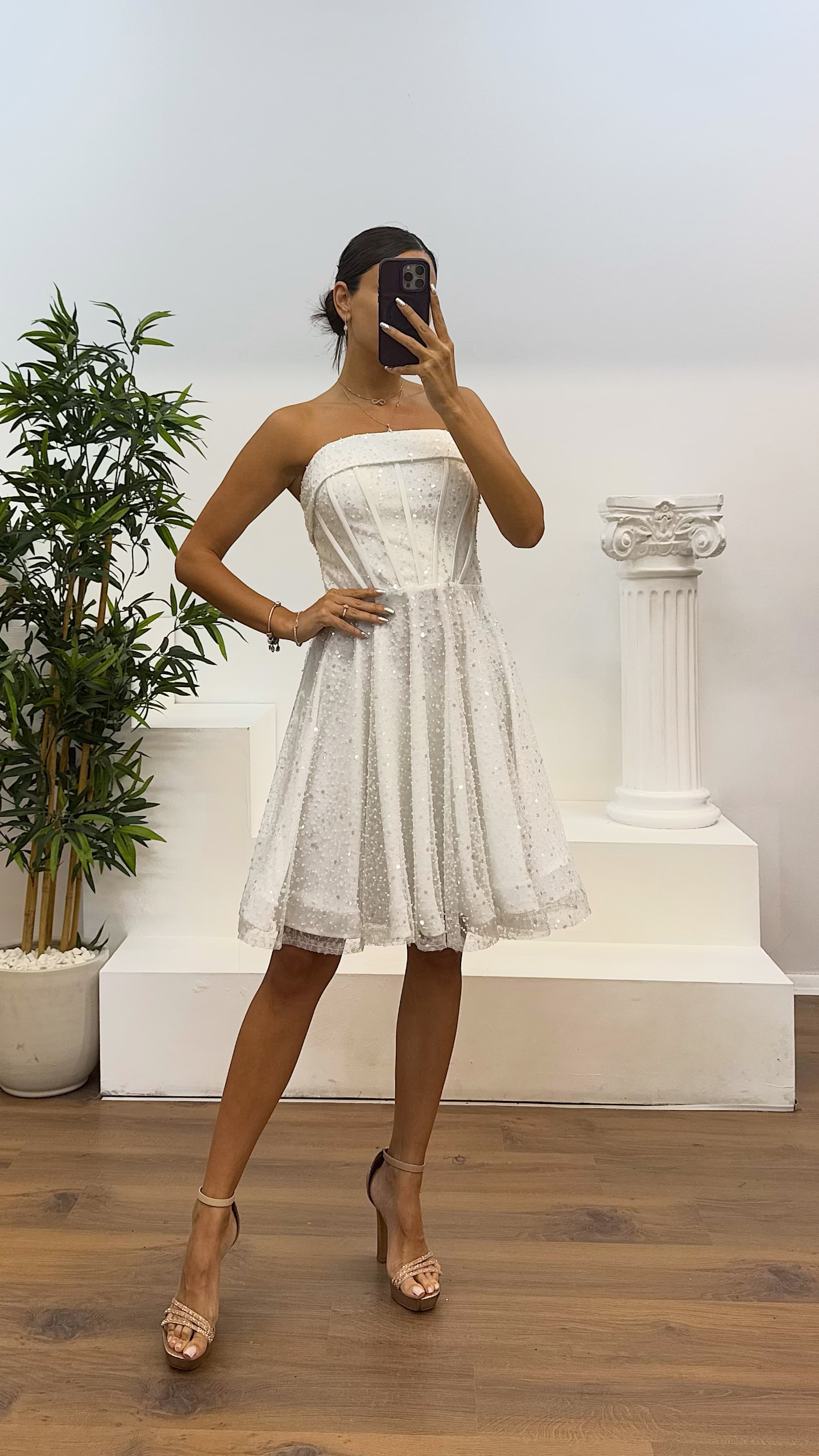 Beyaz Straplez Boncuklu Mini Abiye Elbise