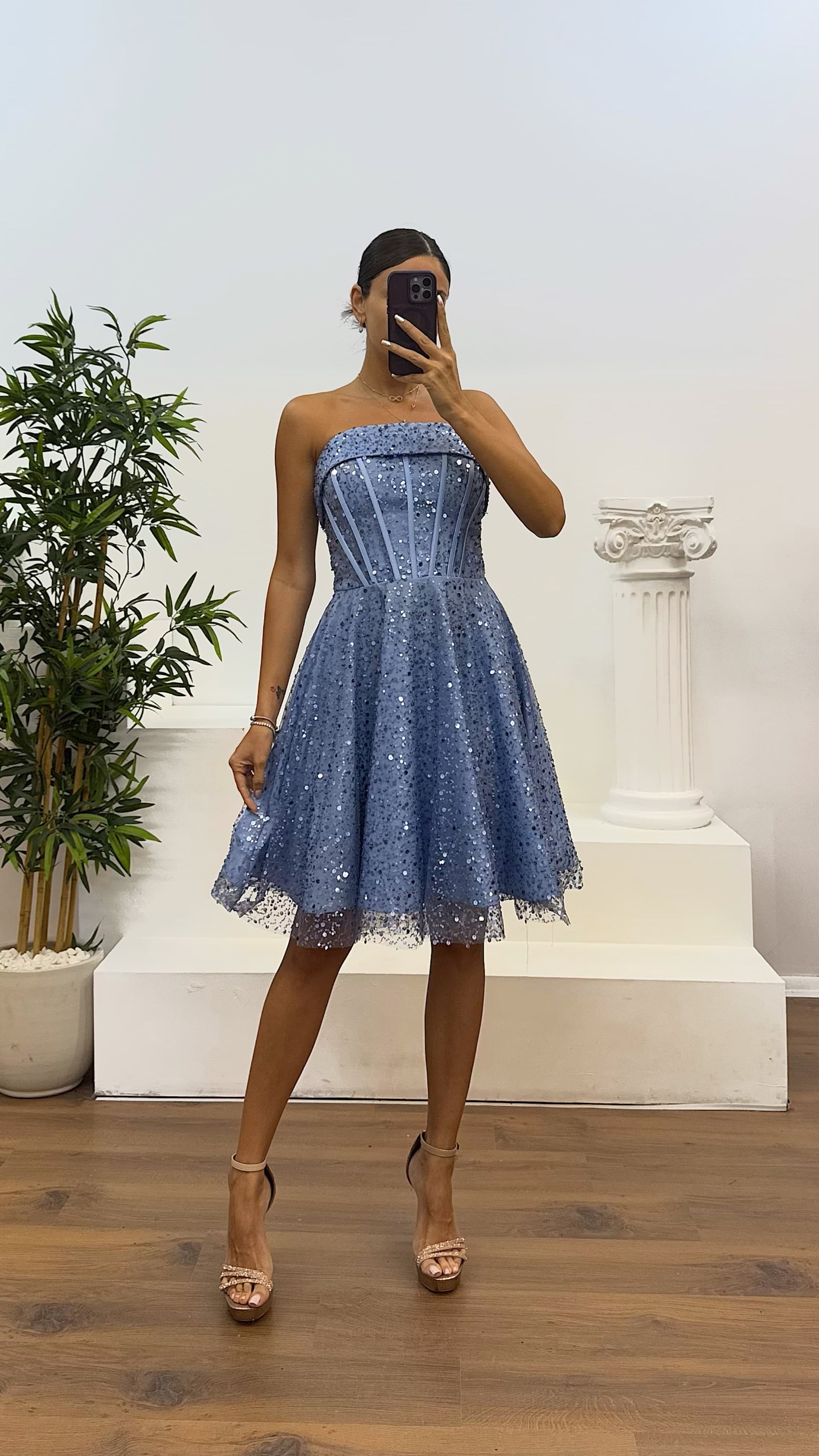 • Bebe Mavi Straplez Boncuklu Mini Abiye Elbise