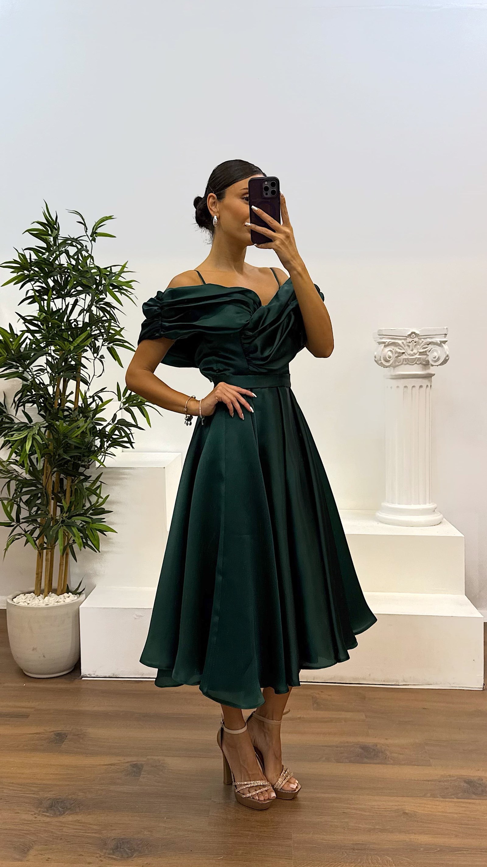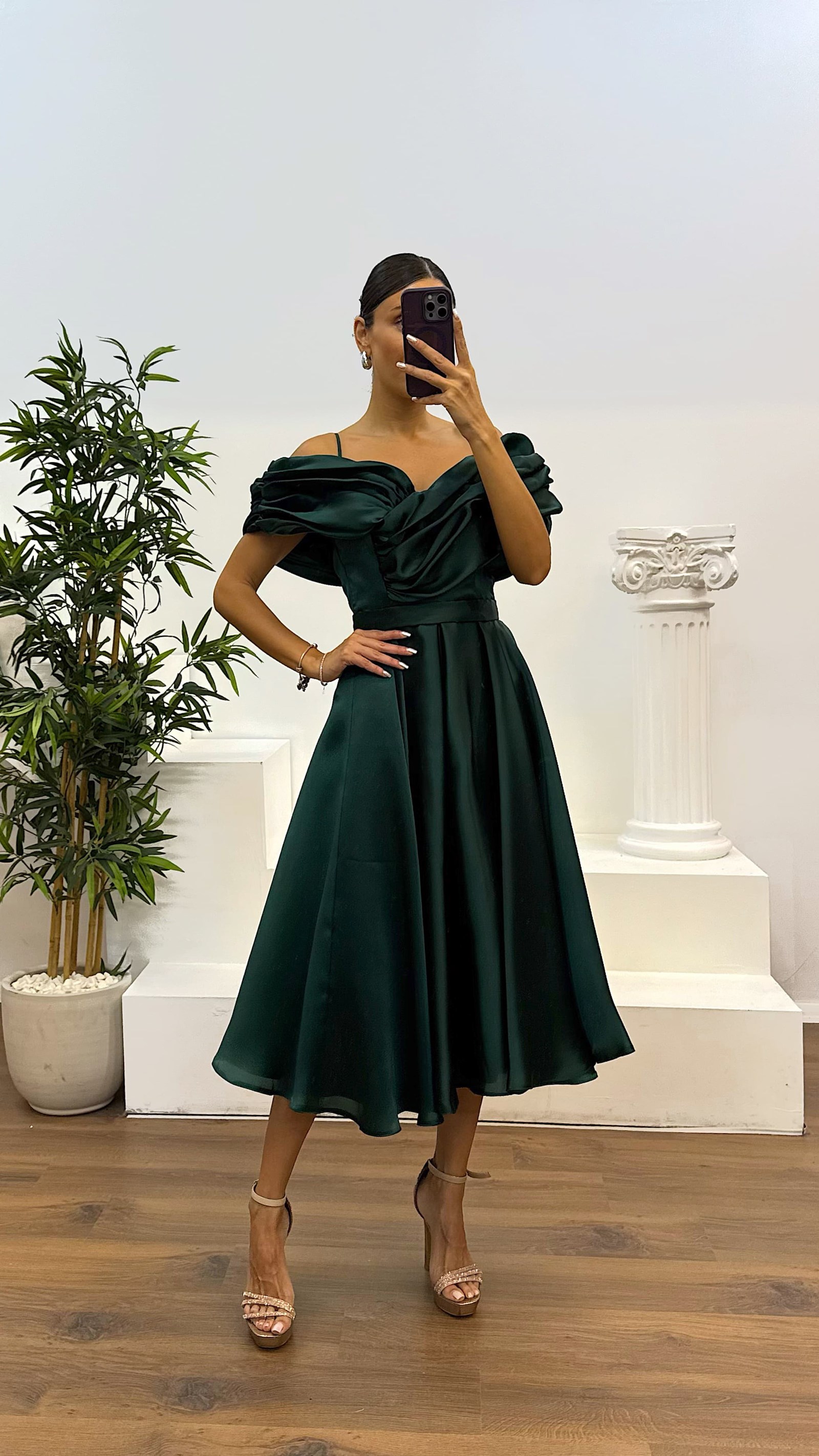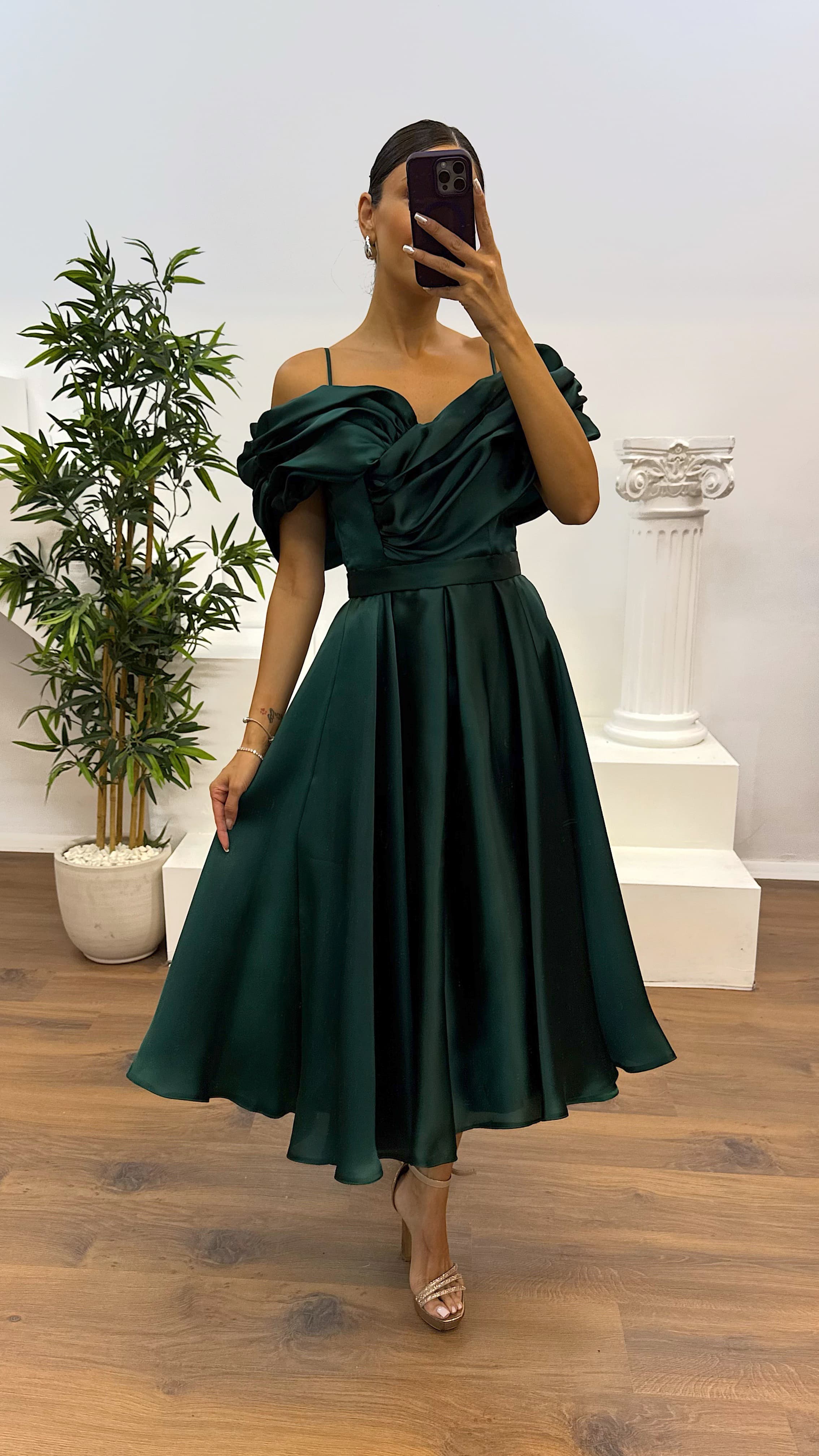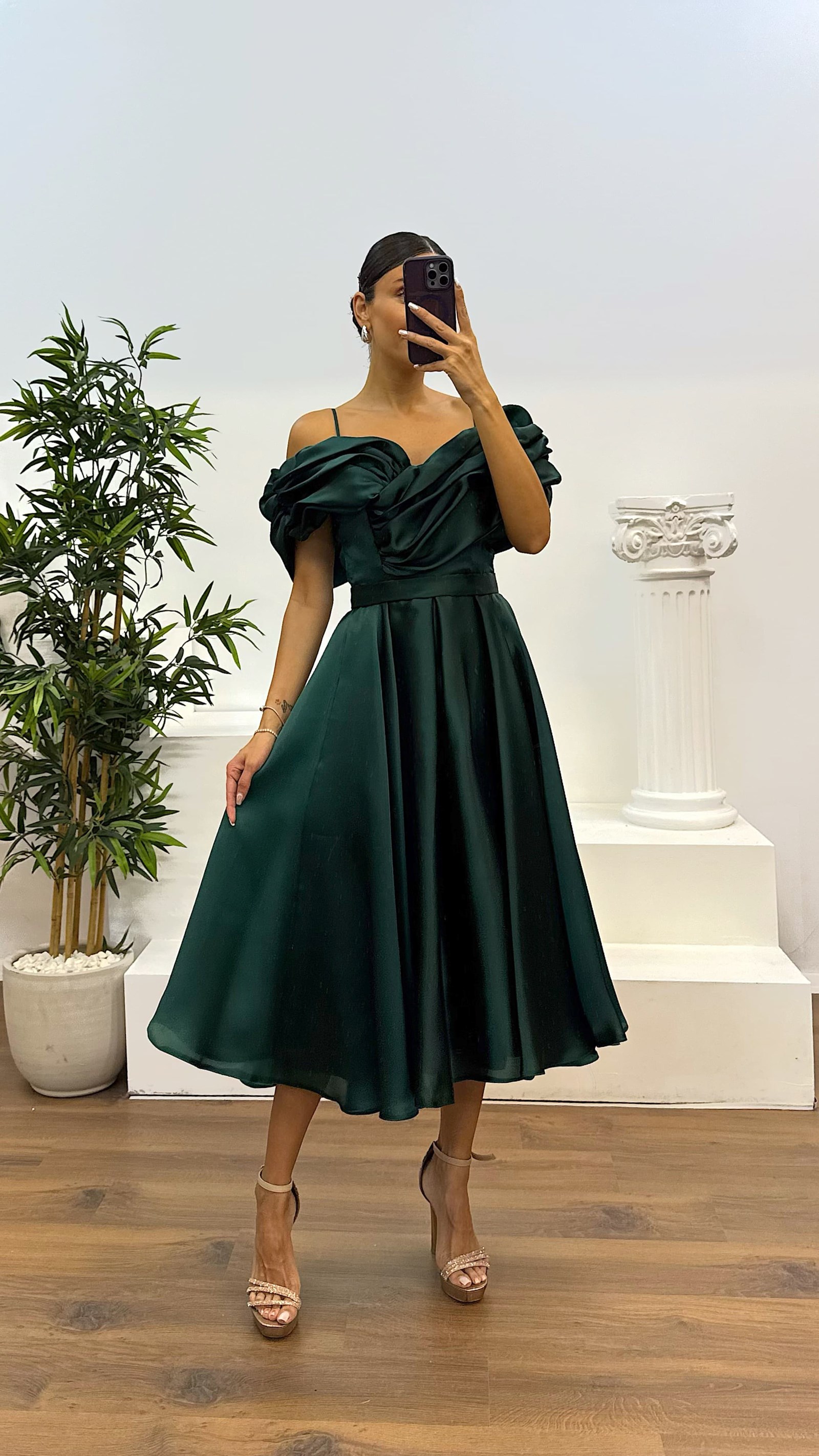 • Yeşil Sırt Detay Midi Abiye Elbise