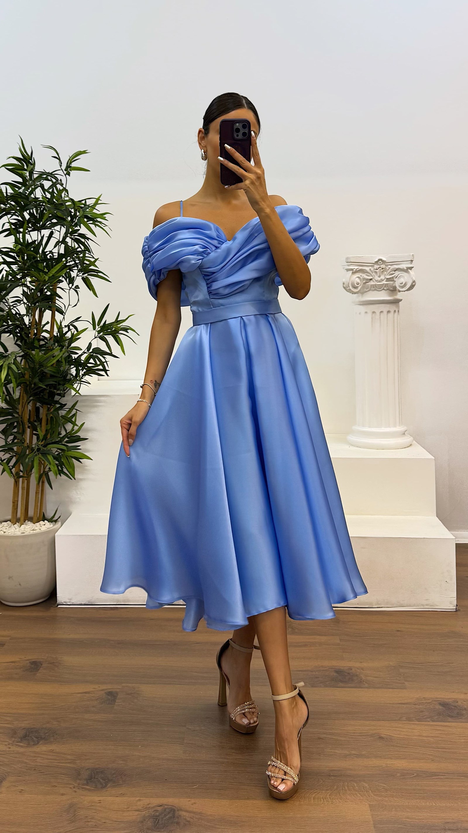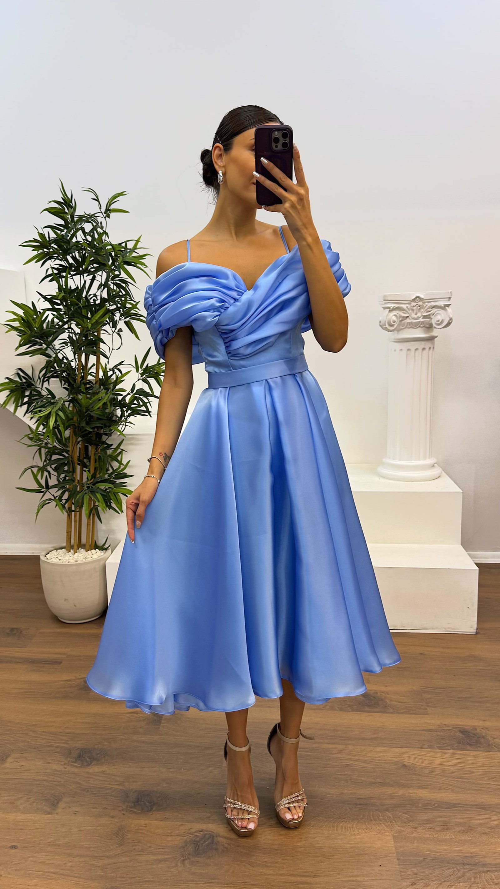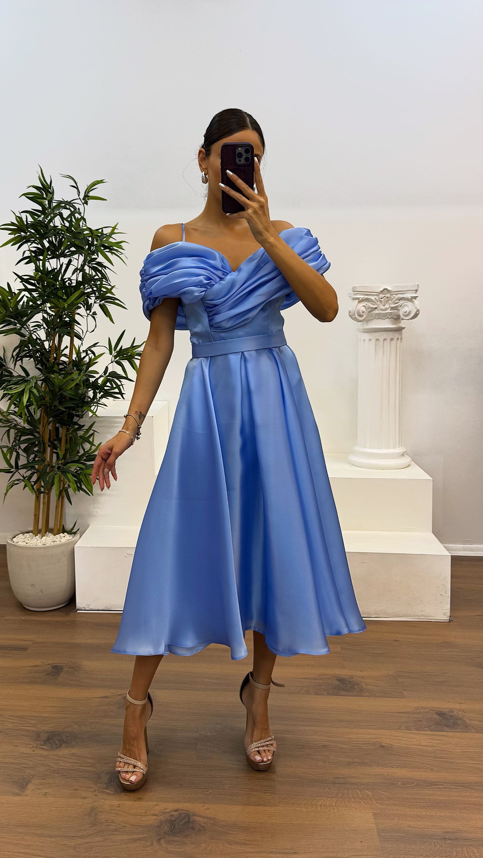 • Kemik Sırt Detay Midi Abiye Elbise