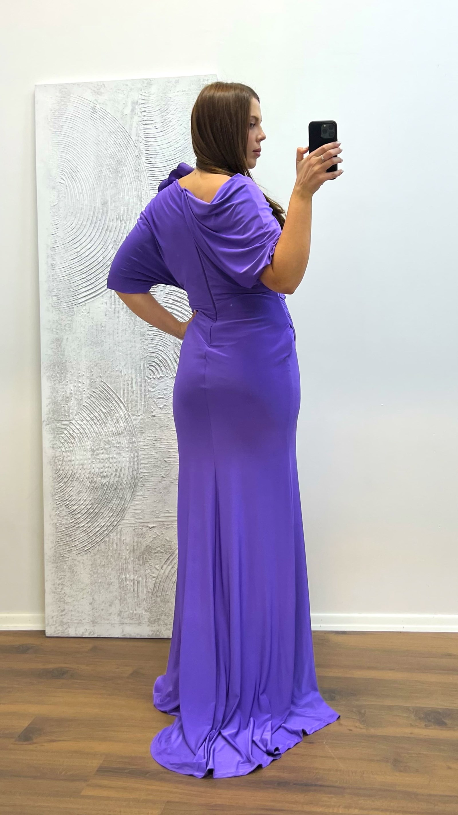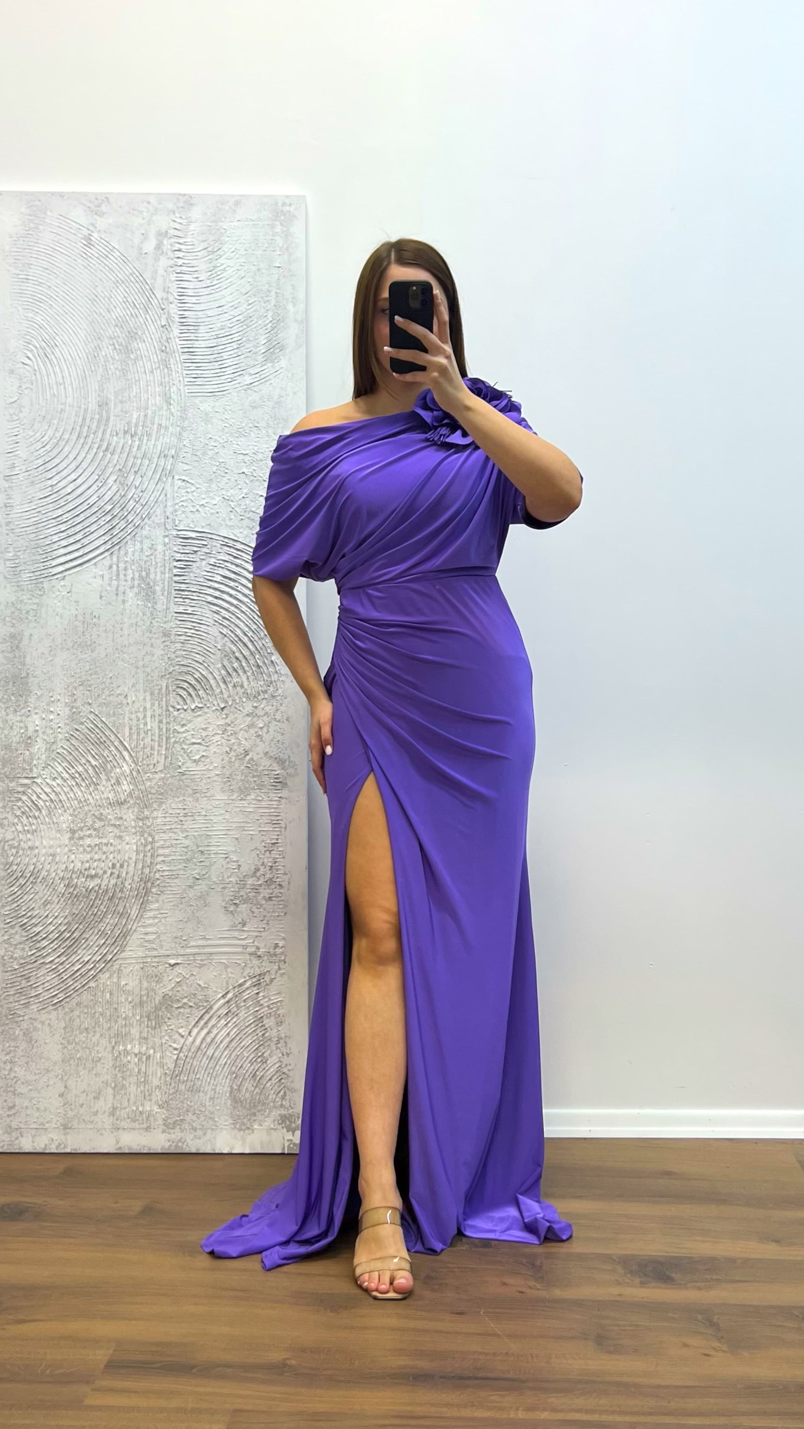 The product is designed as a flower-detailed evening dress, compatible with sizes 44-50, featuring built-in bust padding, lining, back zipper closure, and a slit. Product length may vary between 165-170 cm. Fabric type: Jersey Lycra, Polyester