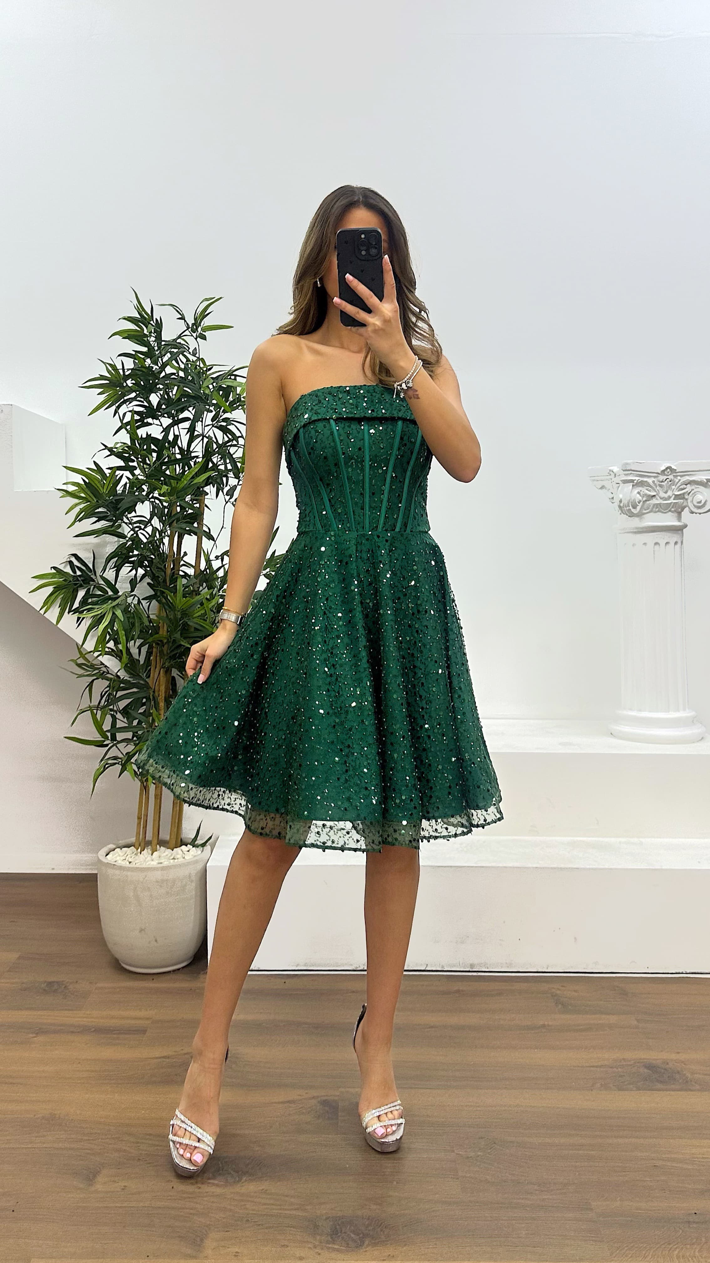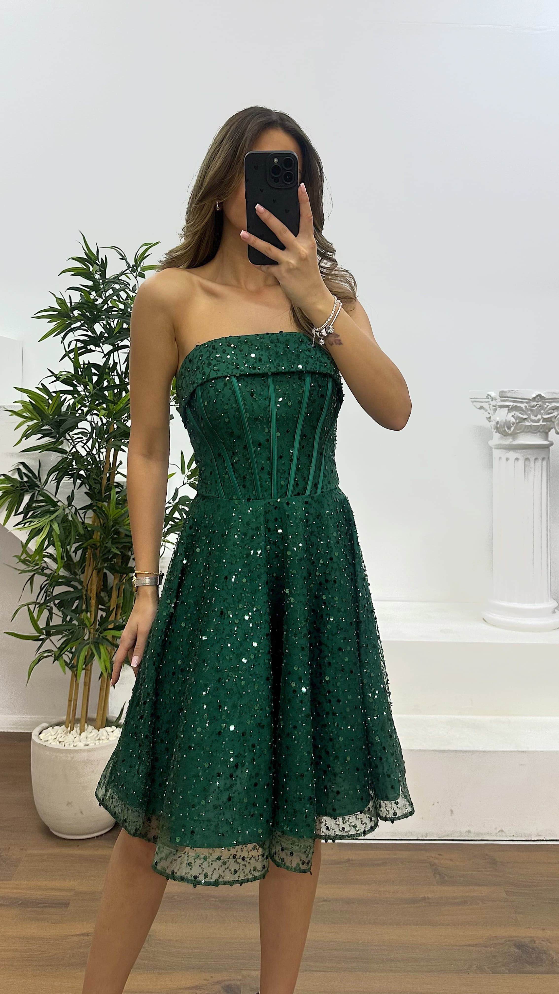 Yeşil Straplez Boncuklu Mini Abiye Elbise
