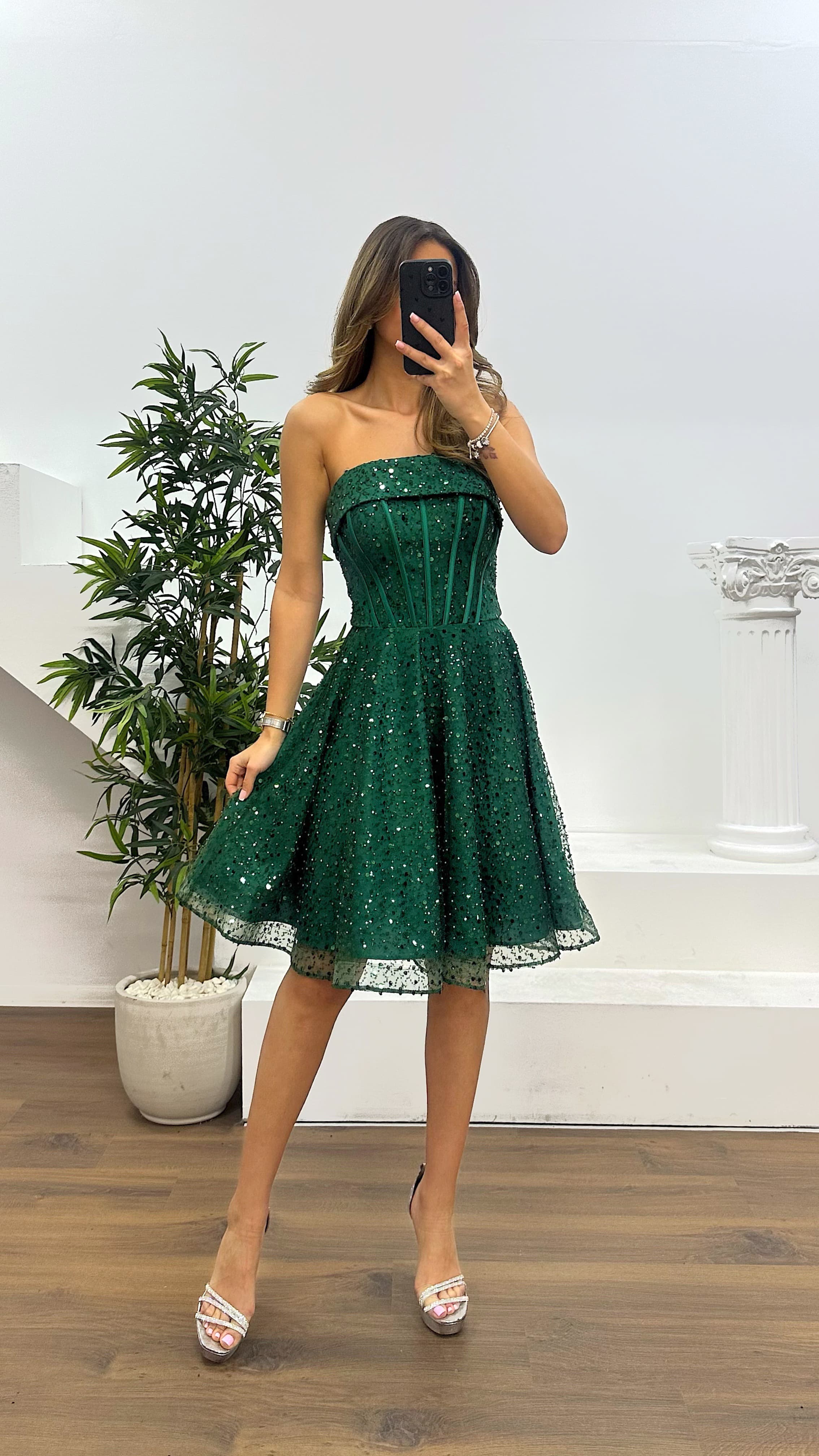 • Yeşil Straplez Boncuklu Mini Abiye Elbise