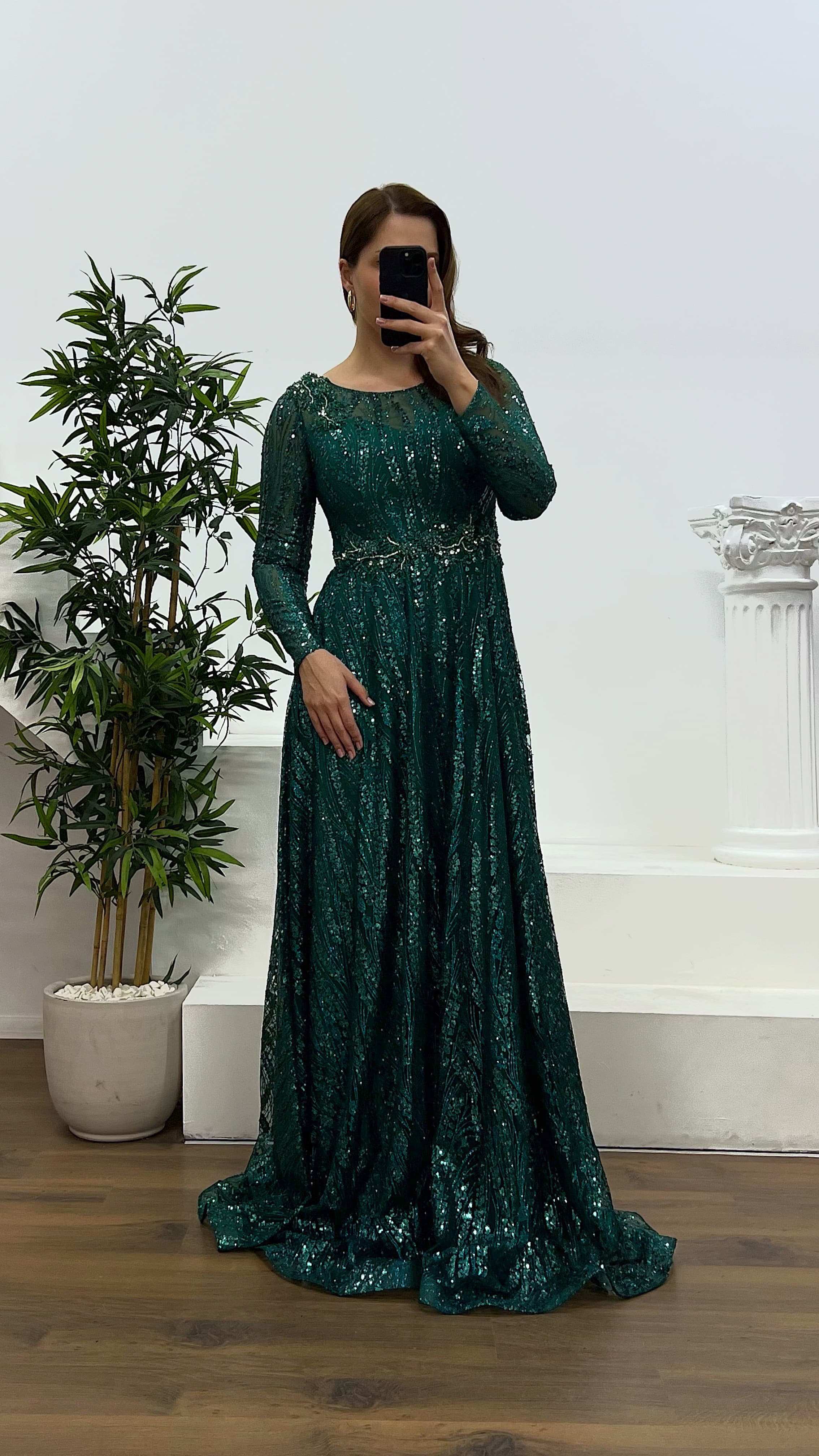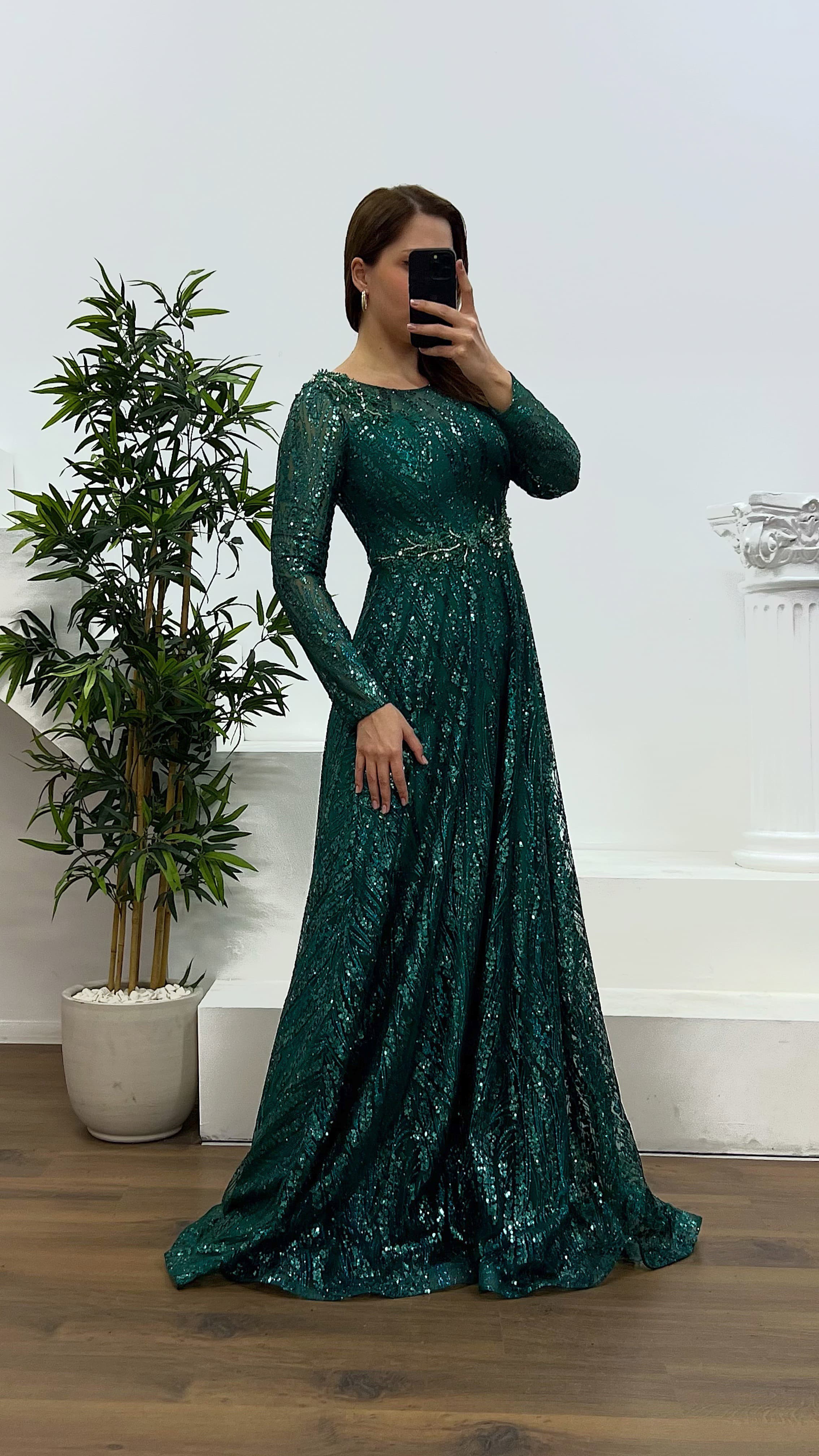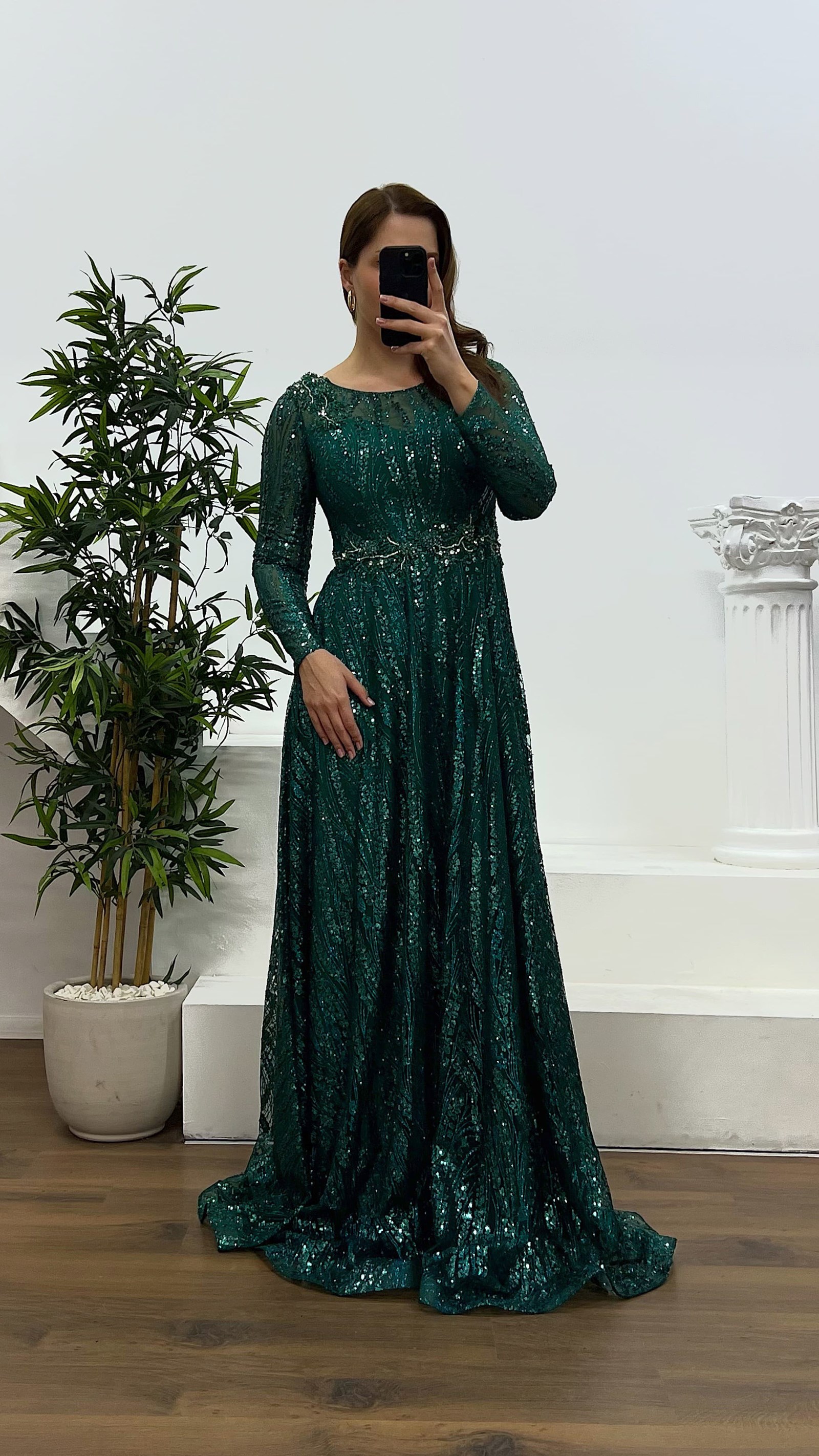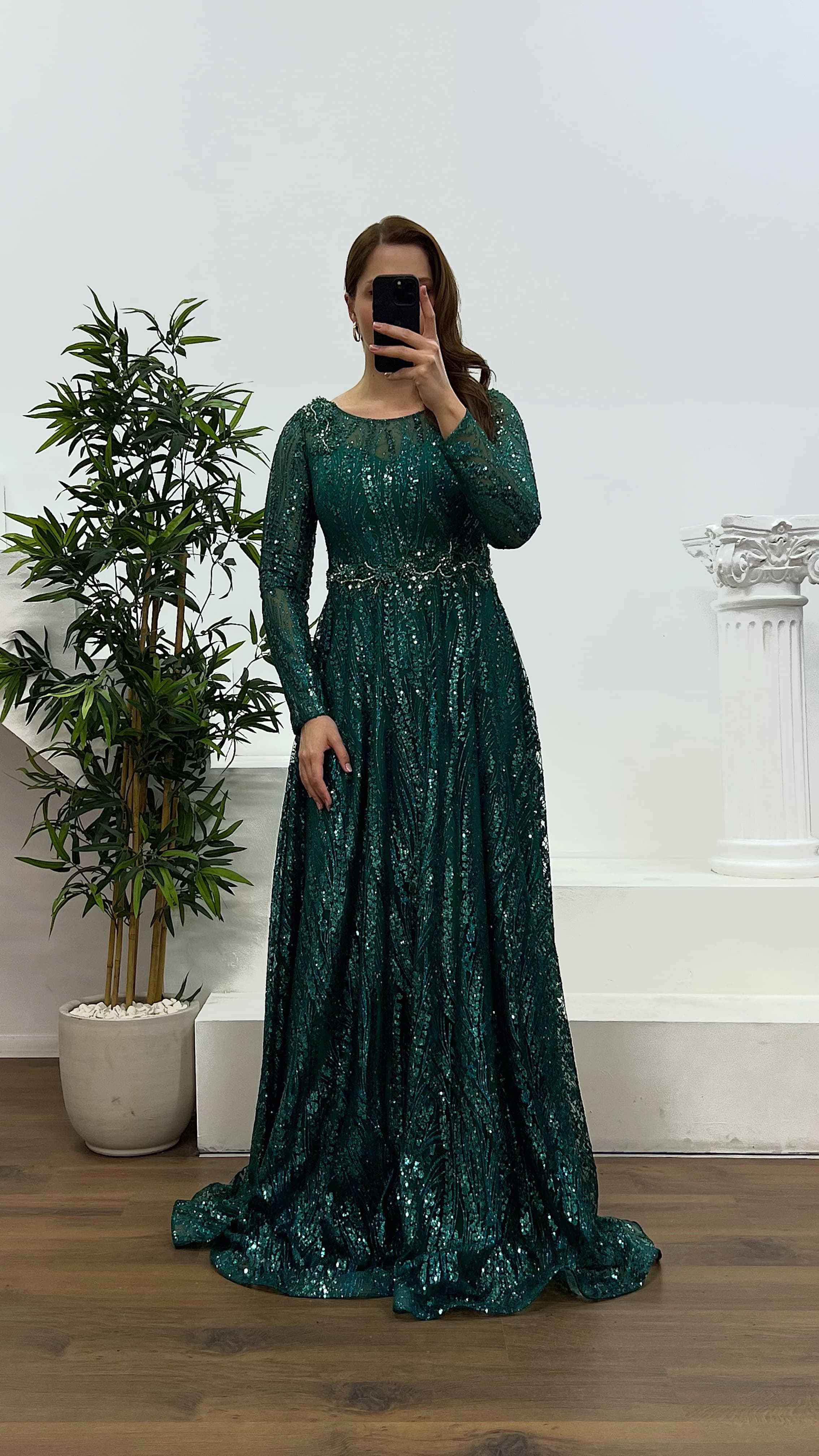Waist Detail Evening Dress The product is designed to fit sizes 44–48. It features padded cups, lining, a back zipper closure, and elegant waist detailing. Product length: May vary between 165–170 cm. Sleeve length: 65 cm. Fabric type: Sequin (100% polyester)