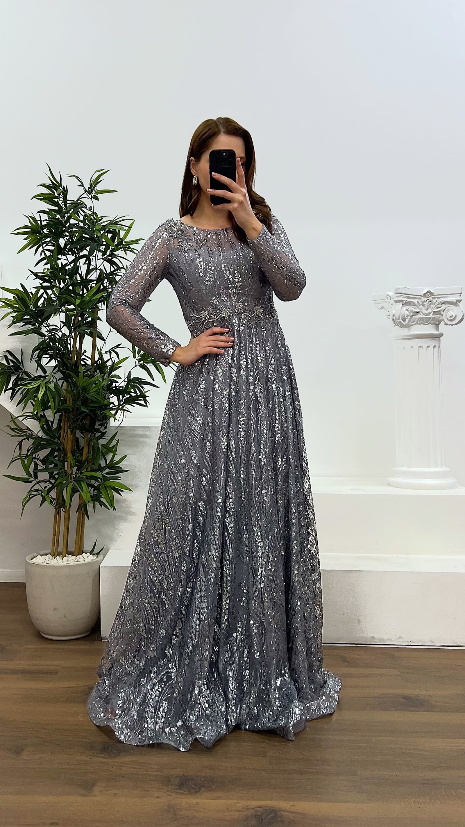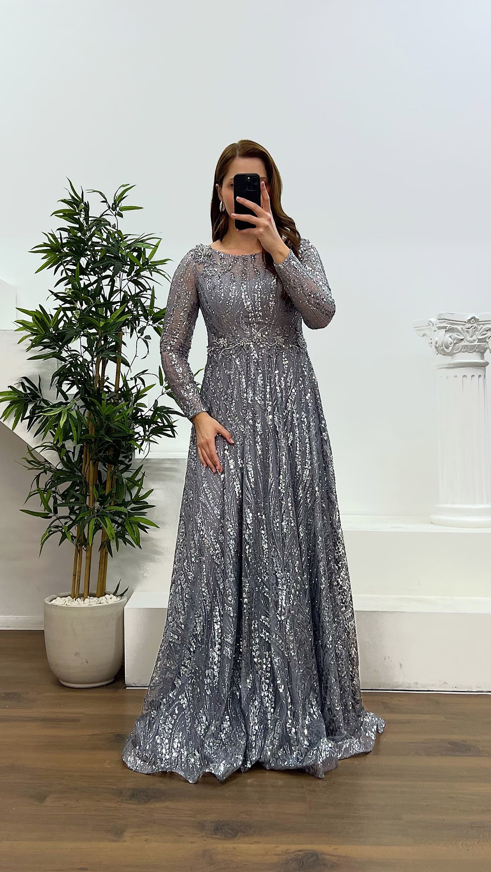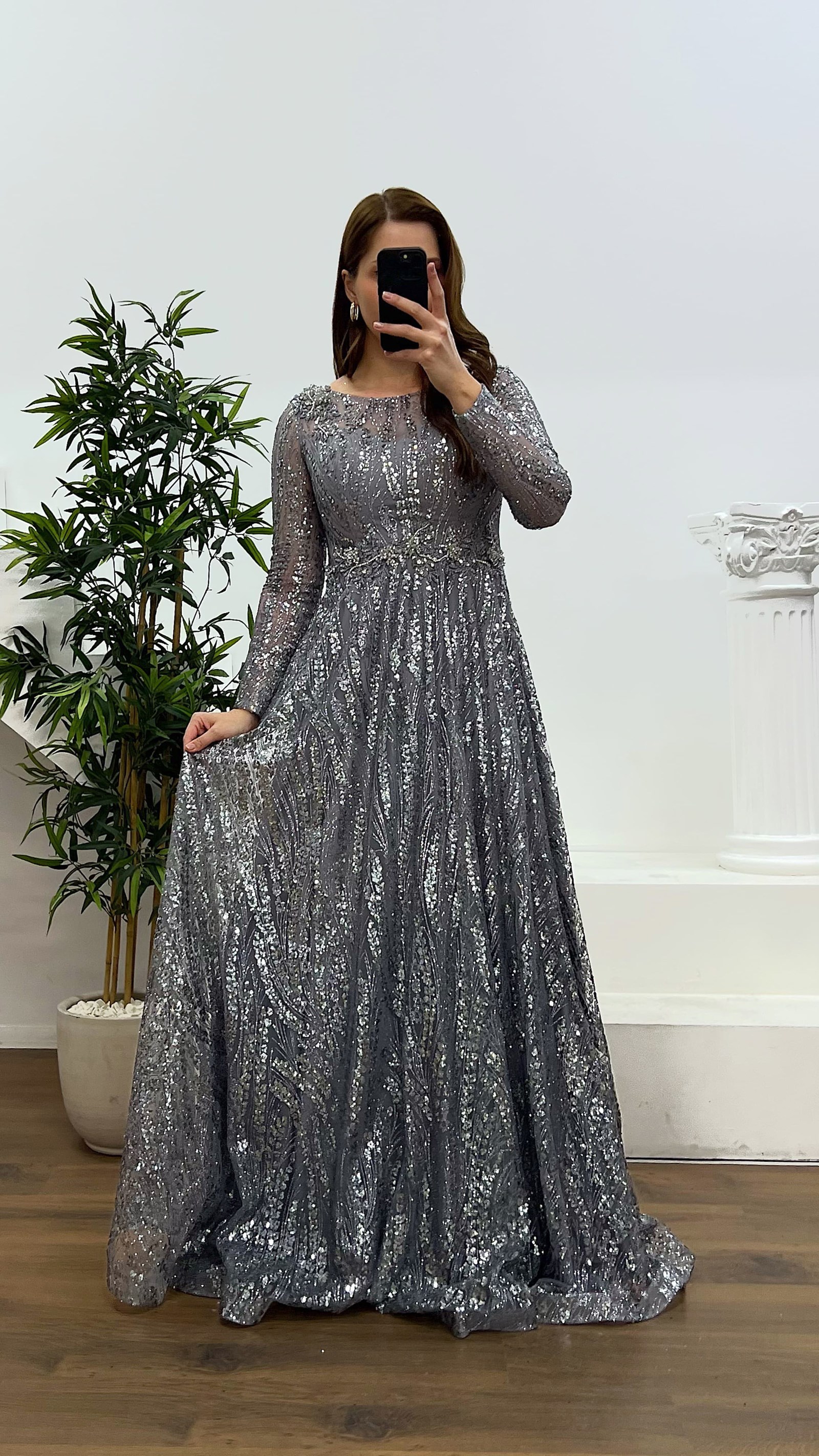 Waist Detail Evening Dress The product is designed to fit sizes 44–48. It features padded cups, lining, a back zipper closure, and elegant waist detailing. Product length: May vary between 165–170 cm. Sleeve length: 65 cm. Fabric type: Sequin (100% polyester)