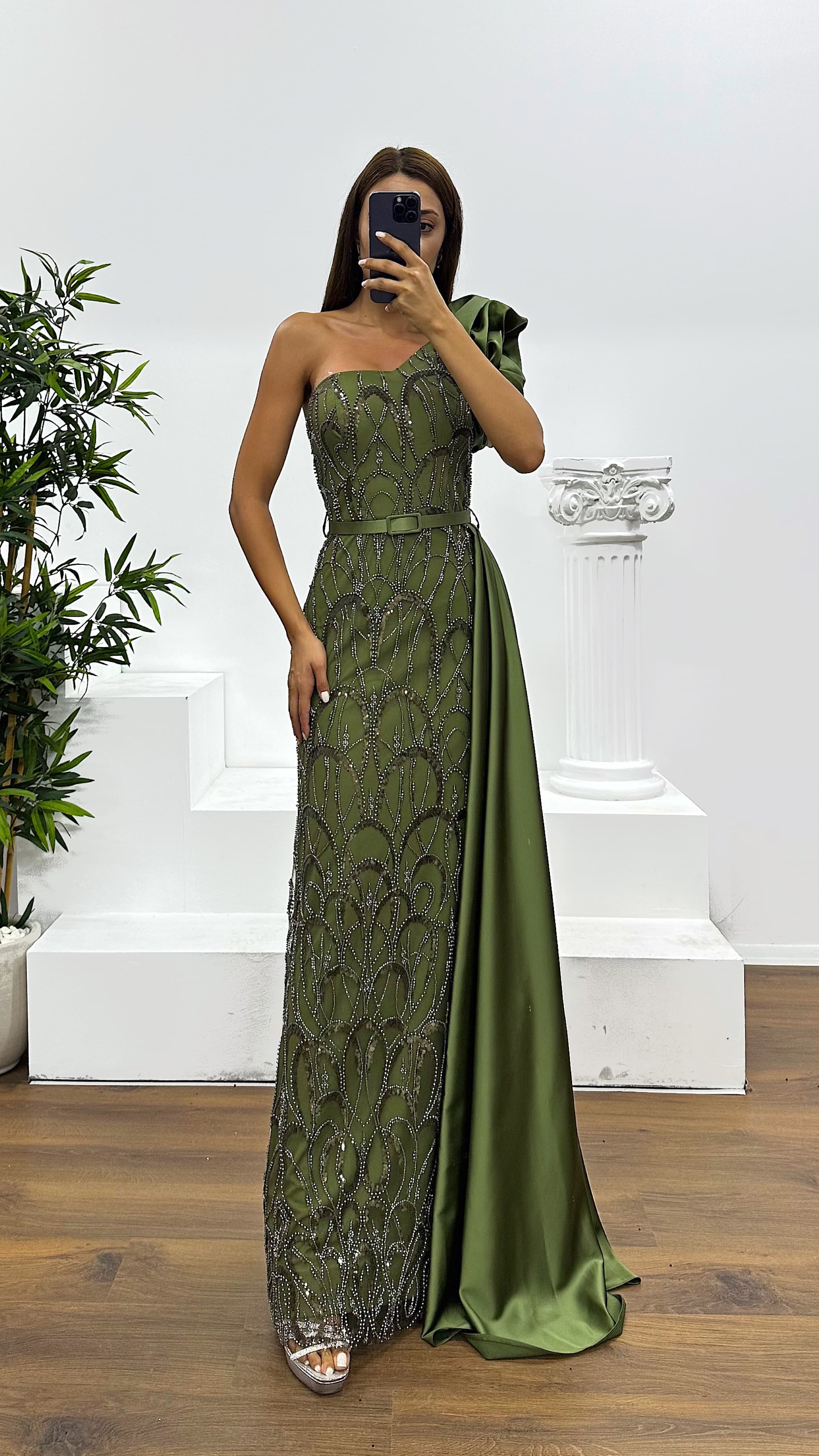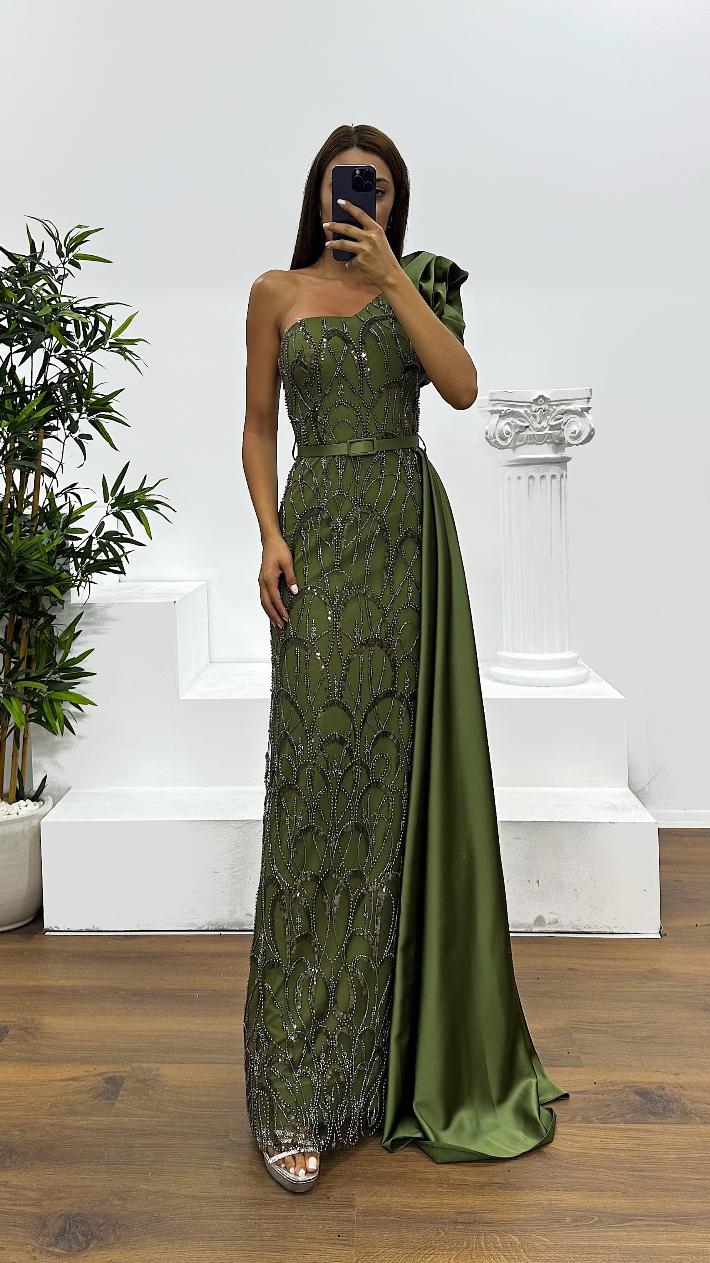 Embroidered Evening Dress The product is designed as an embroidered evening dress, suitable for sizes 36 to 42, with chest padding, lining, and a belt. Product length: May vary between 170–175 cm. Fabric type: Sequin (100% polyester), satin polyester, viscose.