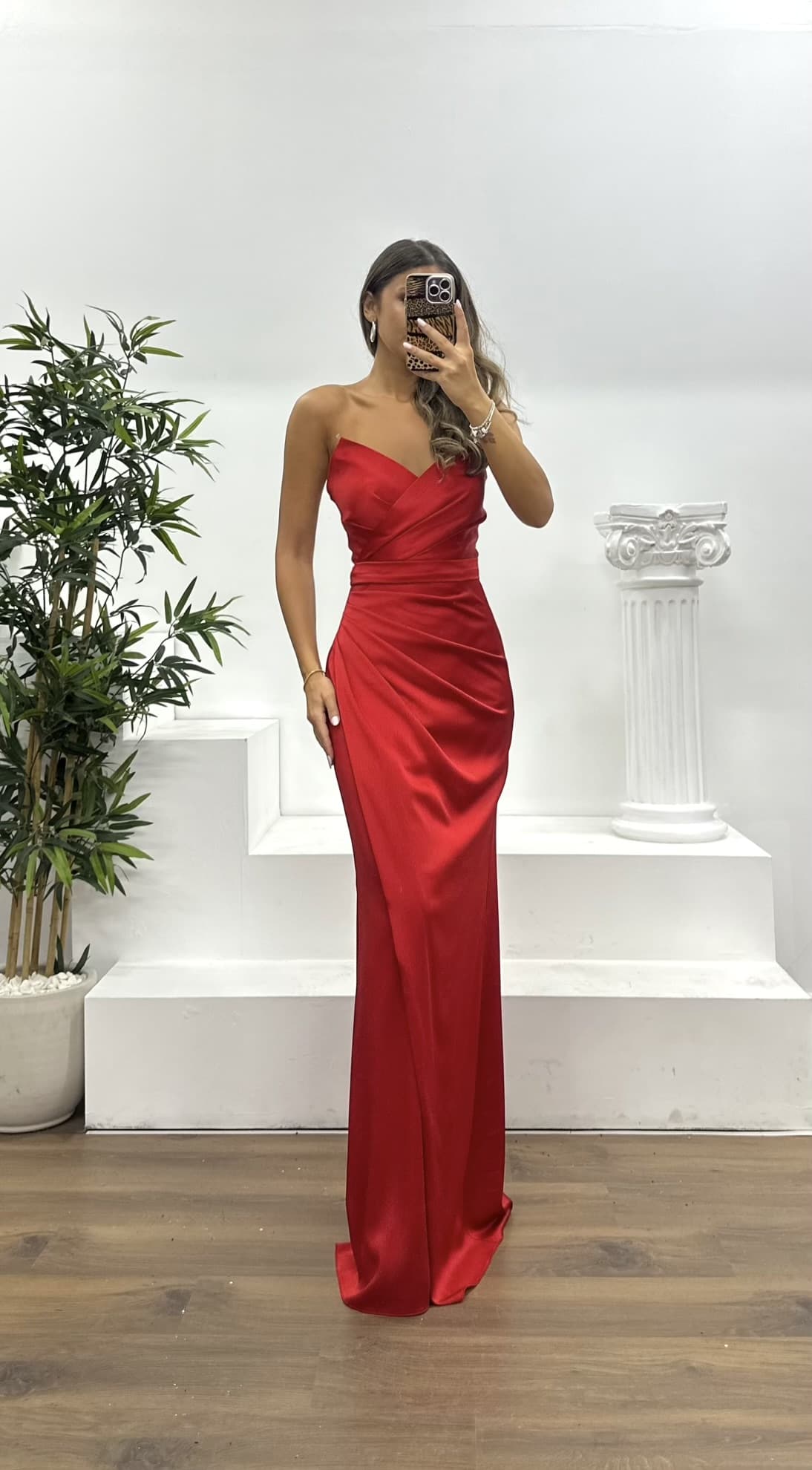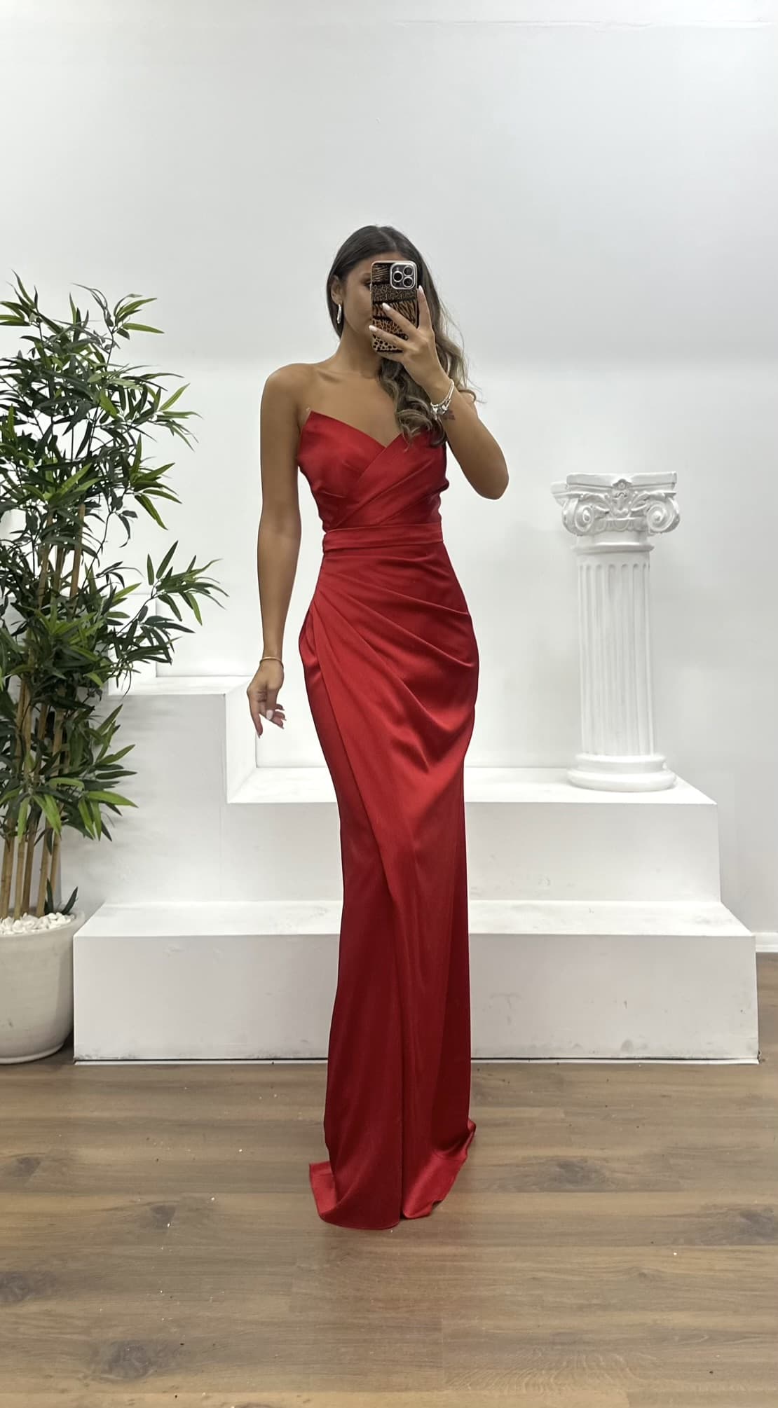 • Kırmızı Straplez Drapeli Abiye Elbise