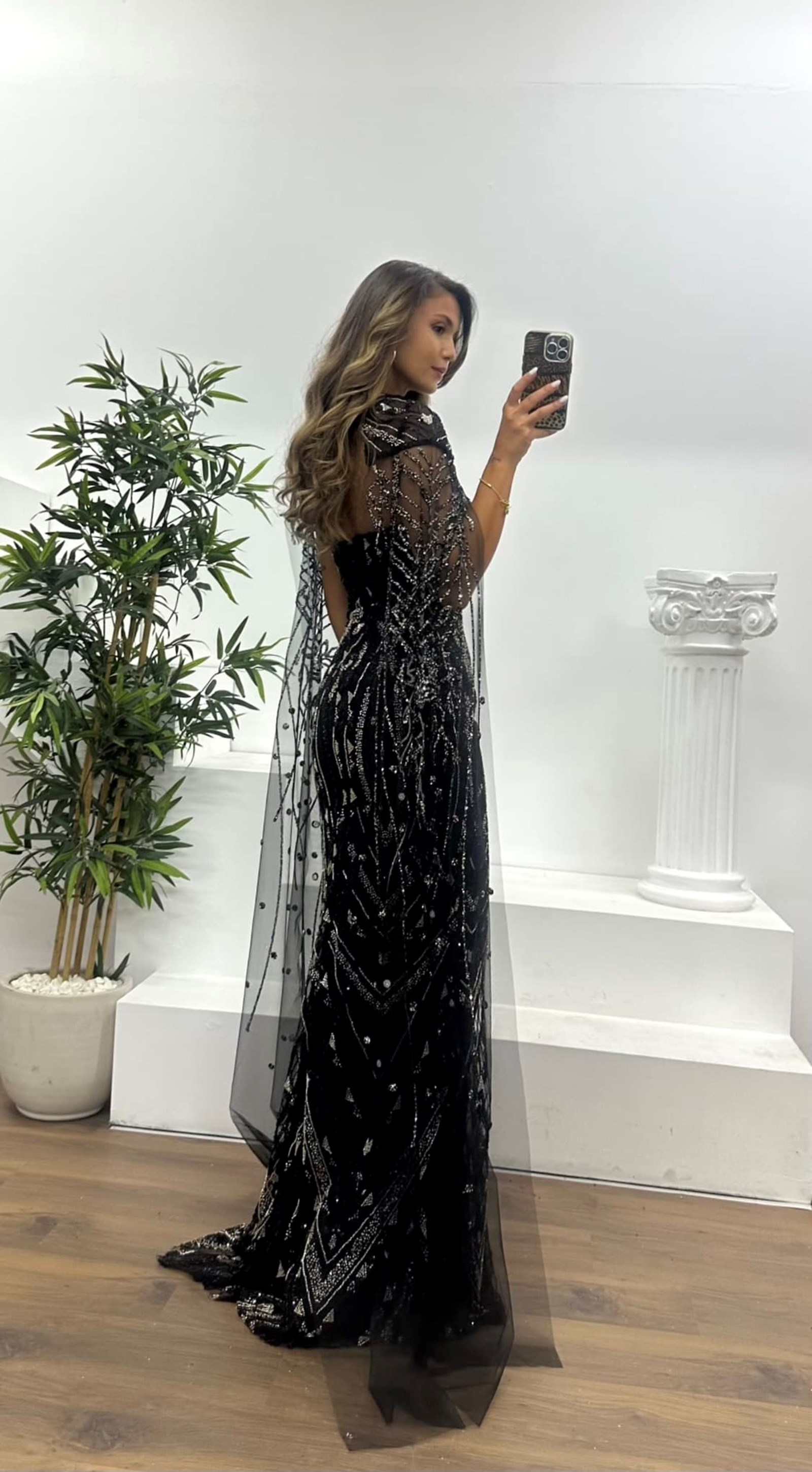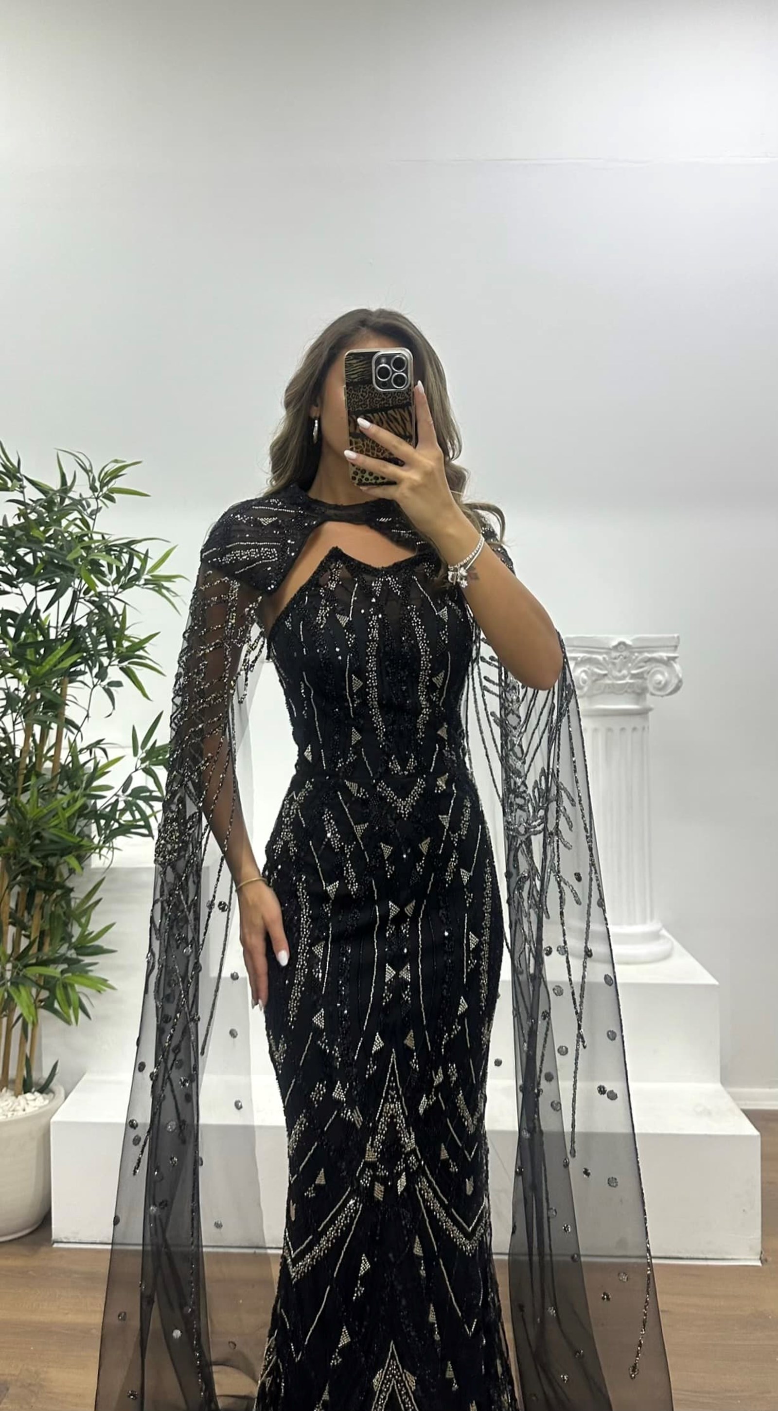 • Siyah Pelerinli İşlemeli Abiye Elbise