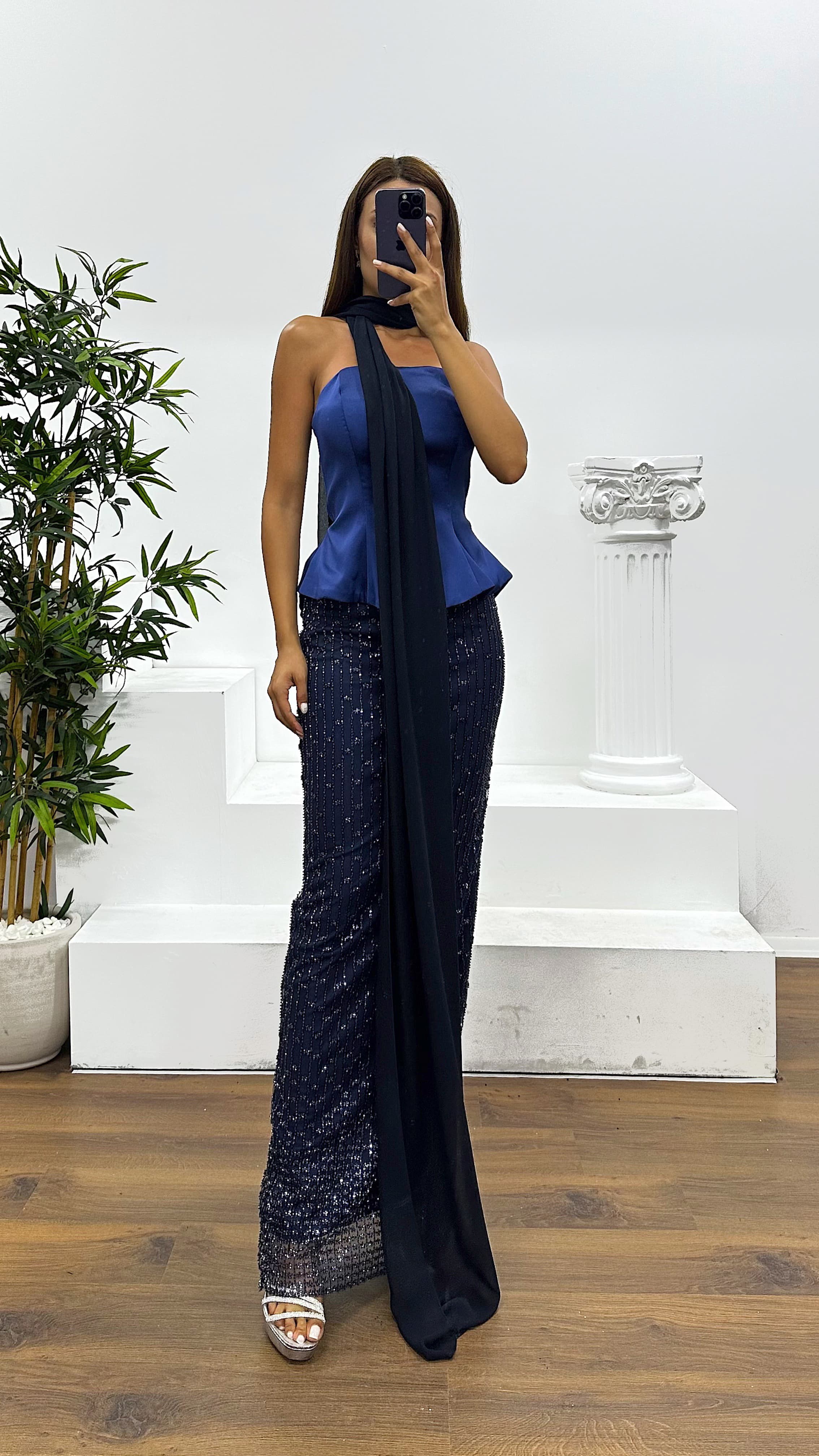 Strapless Evening Dress The product fits sizes 36–44, features padded bust, lining, back zipper closure, and is designed as an embroidered evening dress. Product length: May vary between 170–175 cm. Fabric type: Satin (100% polyester) – Embroidered tulle (3% elastane, 97% polyester)