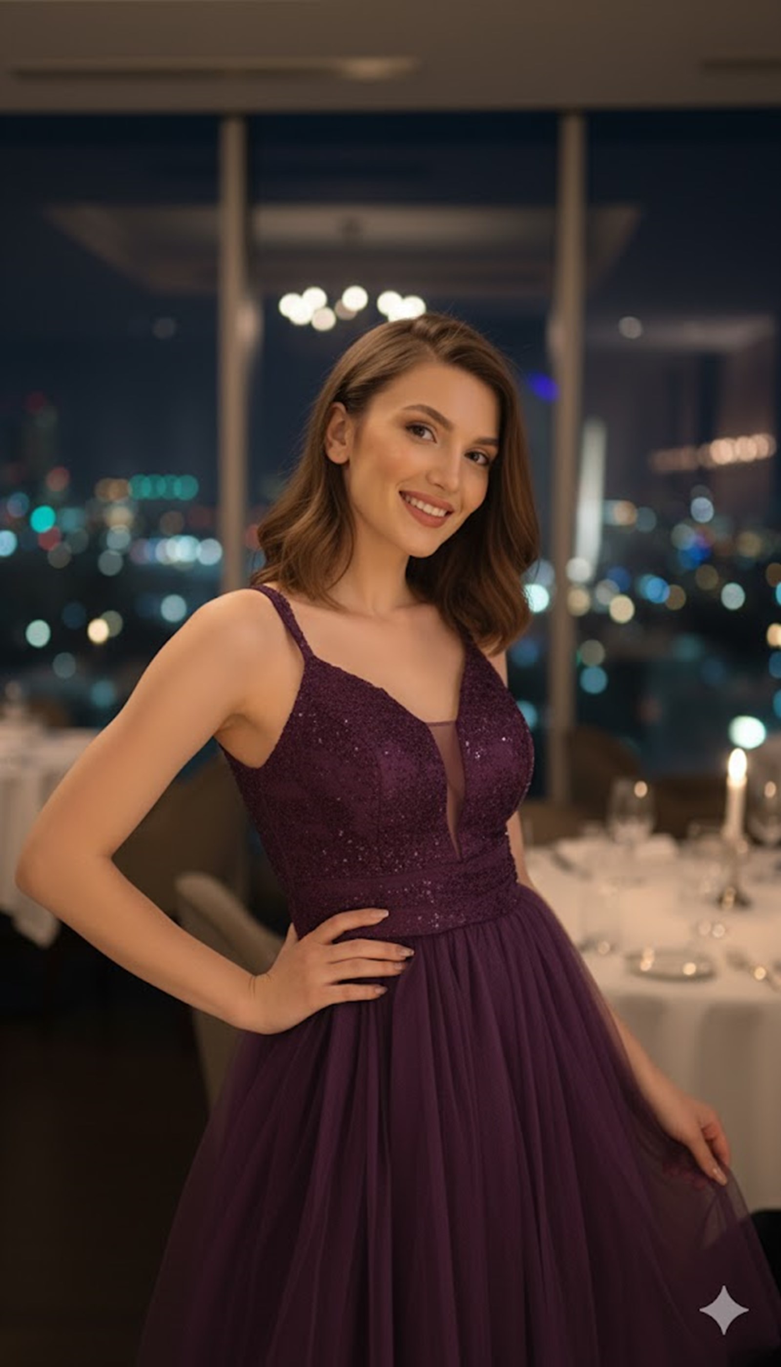 • Mor İp Askılı Mini Tül Abiye Elbise