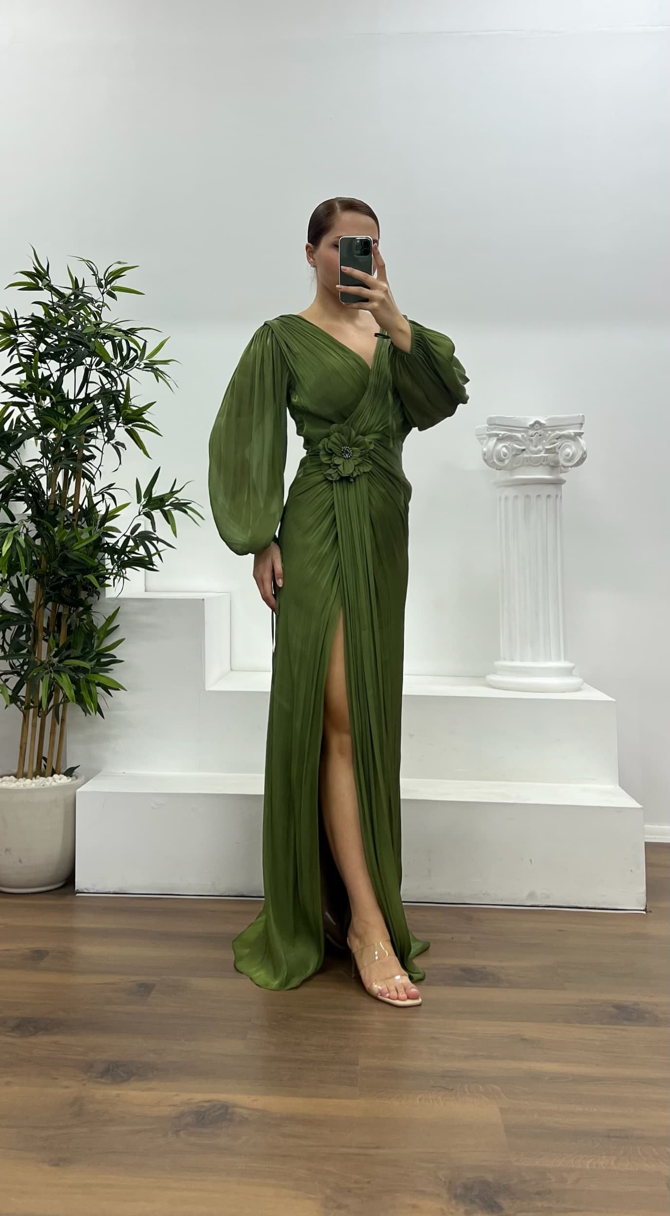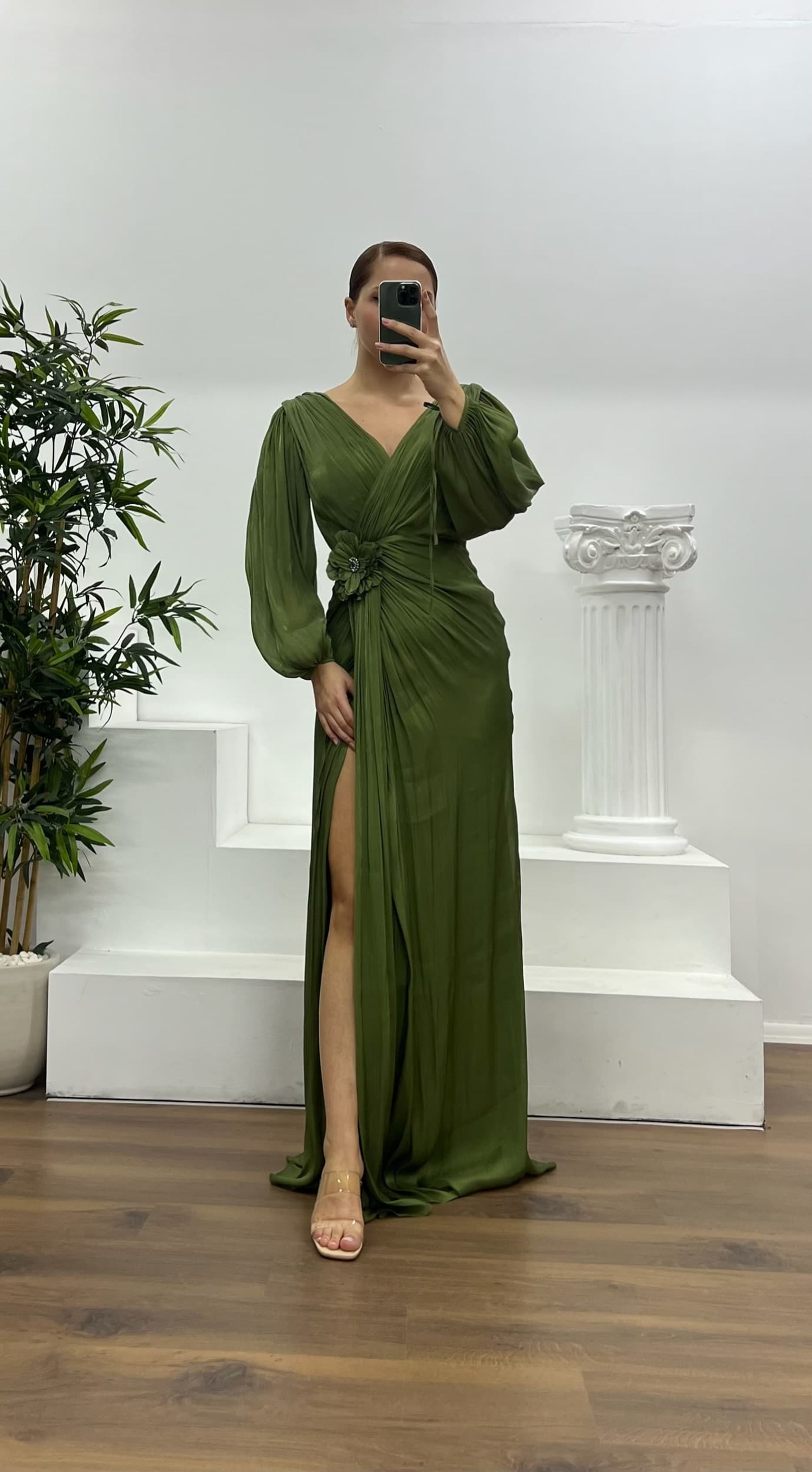 • Haki V Yaka Piliseli Büyük Beden Abiye Elbise