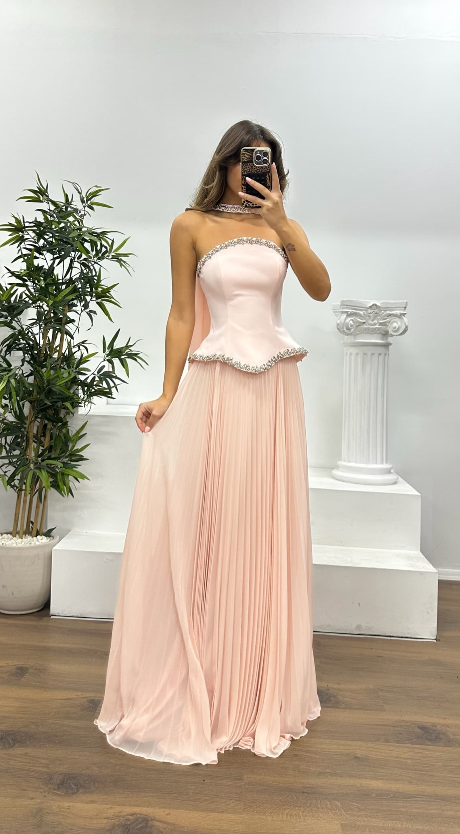 Pleated embroidered evening dress The product fits sizes 36–44, has padded cups, is fully lined, features a back zipper closure, and is designed as an embroidered gown. Length: May vary between 170–175 cm. Fabric type: Chiffon (66% viscose, 34% polyester) An ideal choice to stand out with elegance at weddings, engagements, graduations, or special events.
