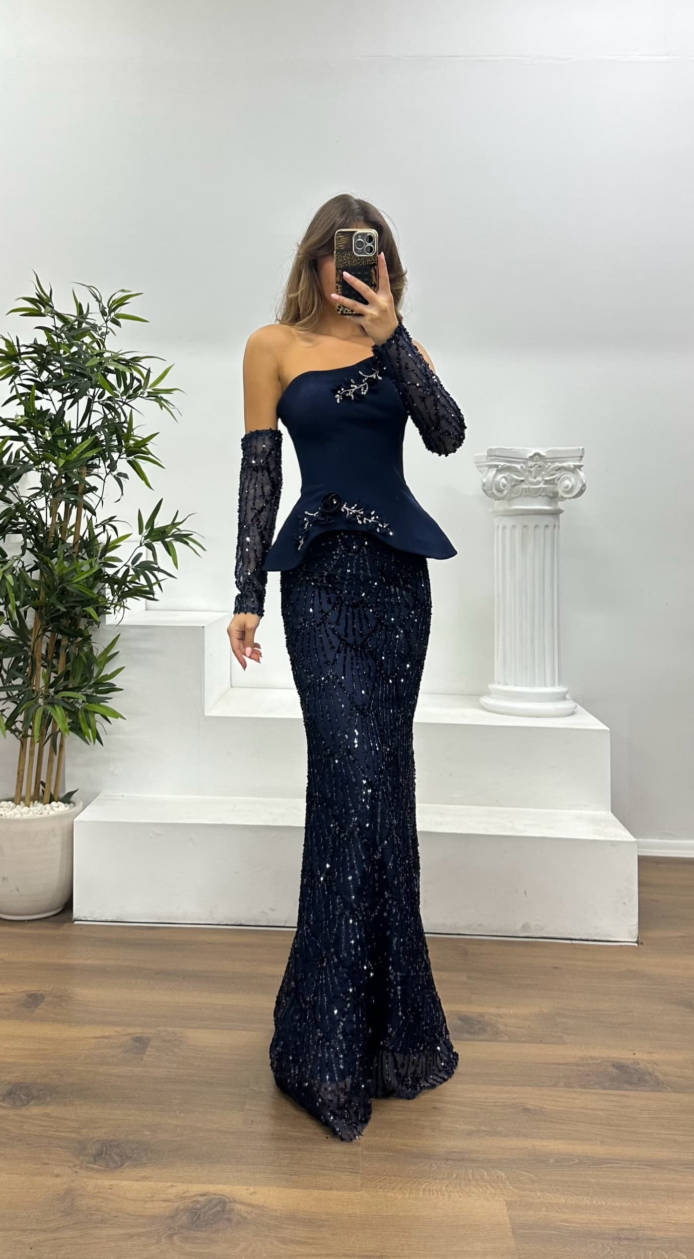 Embroidered Evening Dress The product fits sizes 36–44, features chest padding, lining, a back zipper, embroidery, and comes with gloves. Length: varies between 170–175 cm. Fabric type: sequin fabric, 100% polyester. Perfect choice to stand out with elegance at weddings, engagements, graduations, or special occasions.