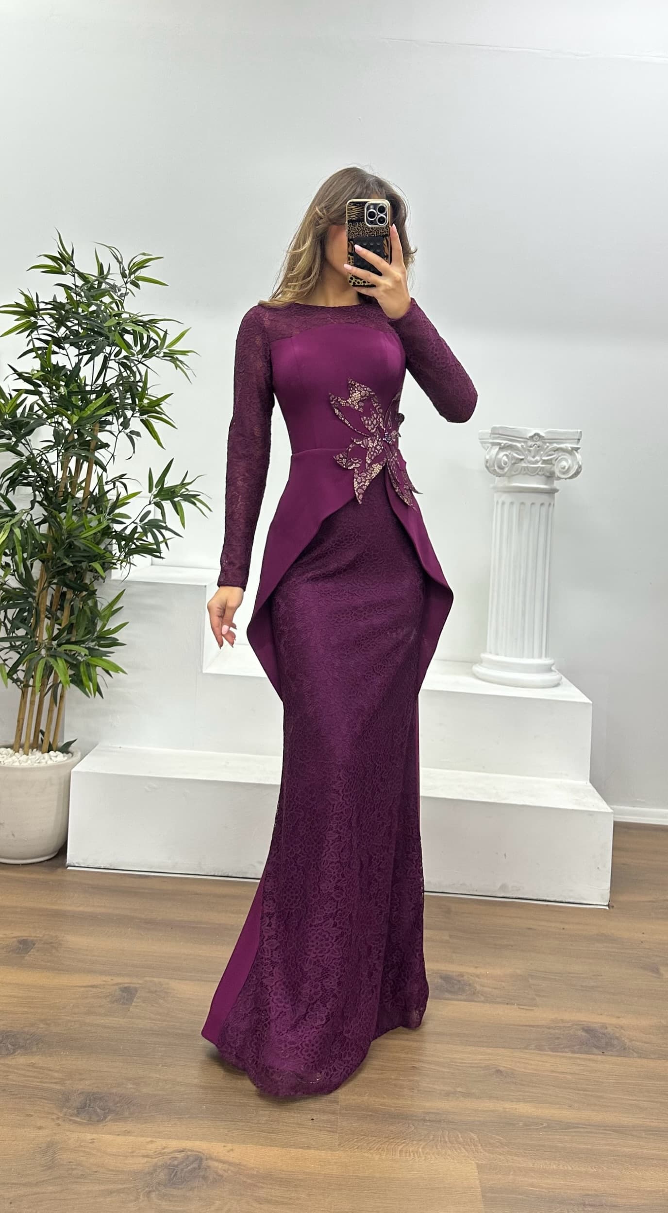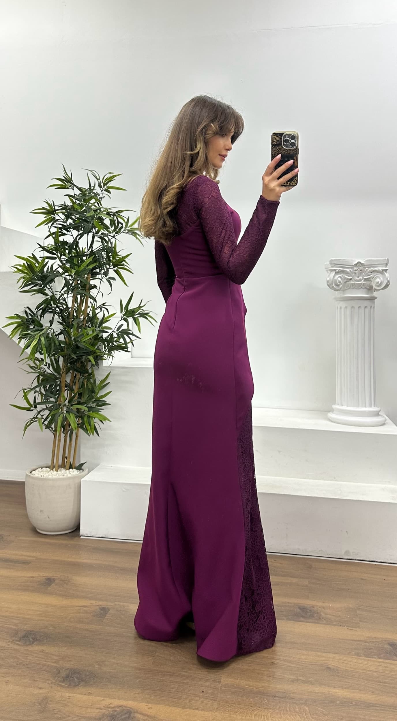 Lace long-sleeve evening dress The product fits sizes 36–44, features padded cups, lining, back zipper closure, and a waist detail design. Length: 170–175 cm Sleeve length: 60 cm Fabric type: lace fabric Perfect choice to stand out with elegance at weddings, engagements, graduations, or special events.