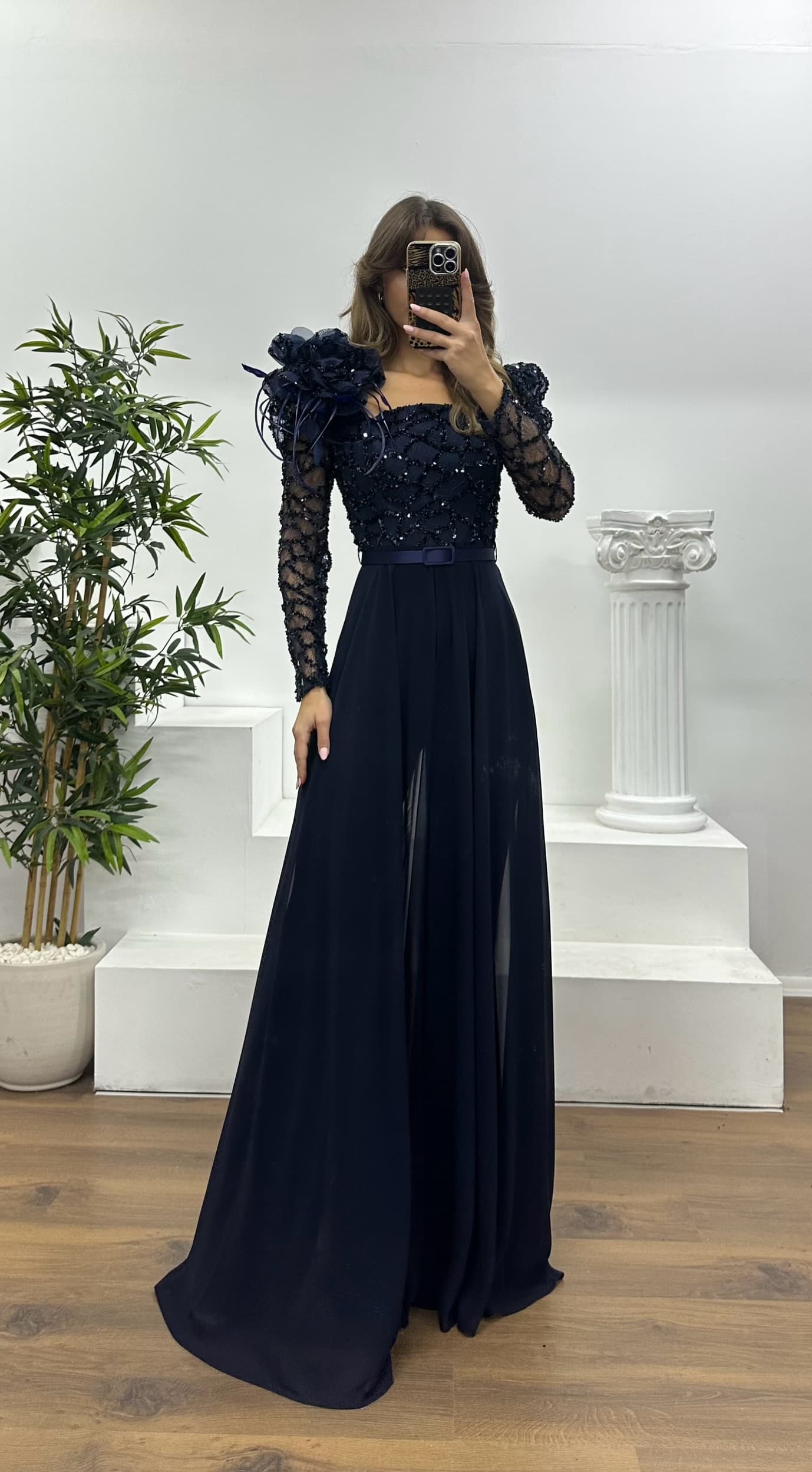 Embroidered Evening Dress The product fits sizes 36–42, features padded cups, full lining, a back zipper closure, a belt, floral details, and embroidery. Length: May vary between 170–175 cm. Fabric: chiffon (66% viscose, 34% polyester) – sequin embroidery (100% polyester). Ideal for standing out with elegance at weddings, engagements, graduations, or special events.