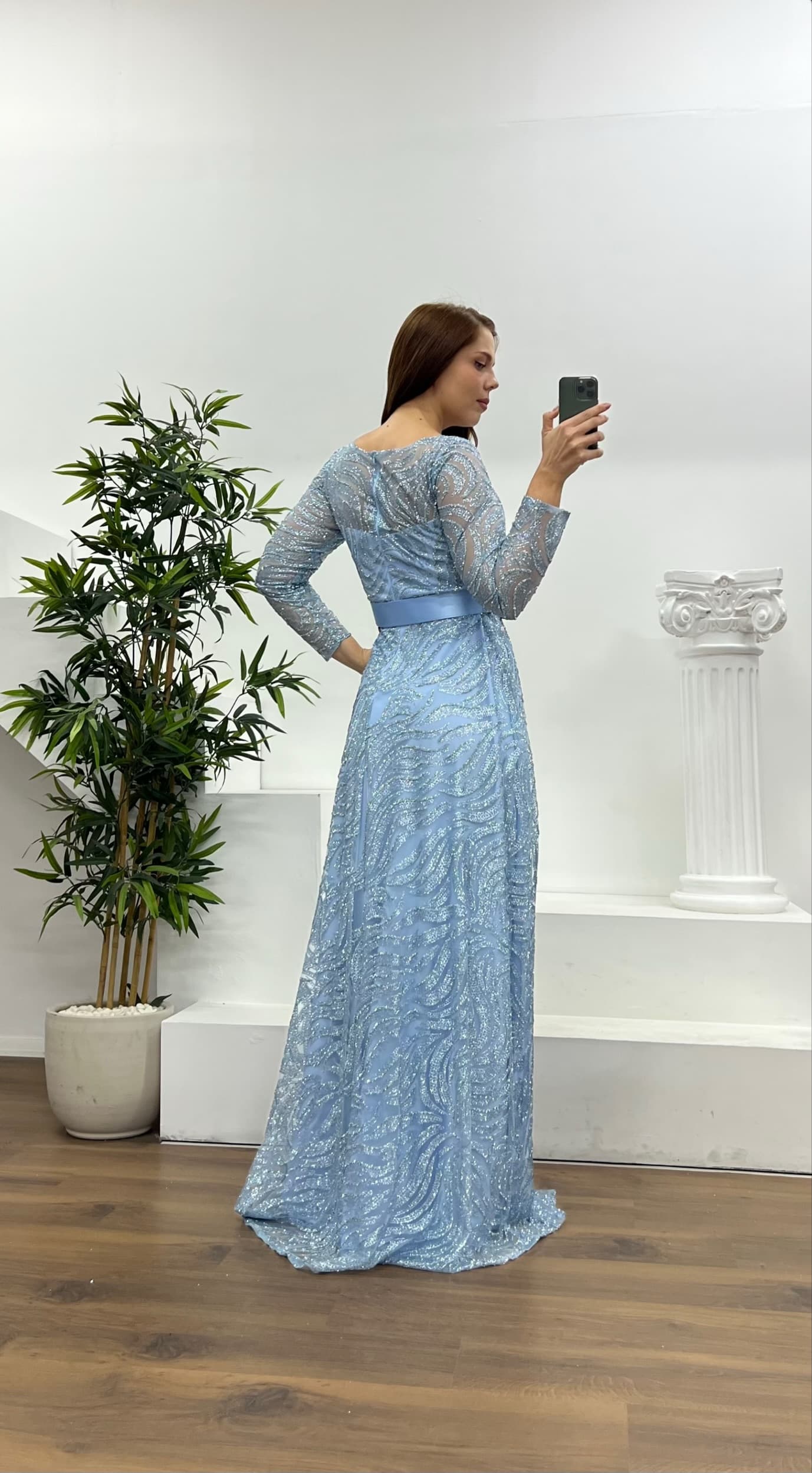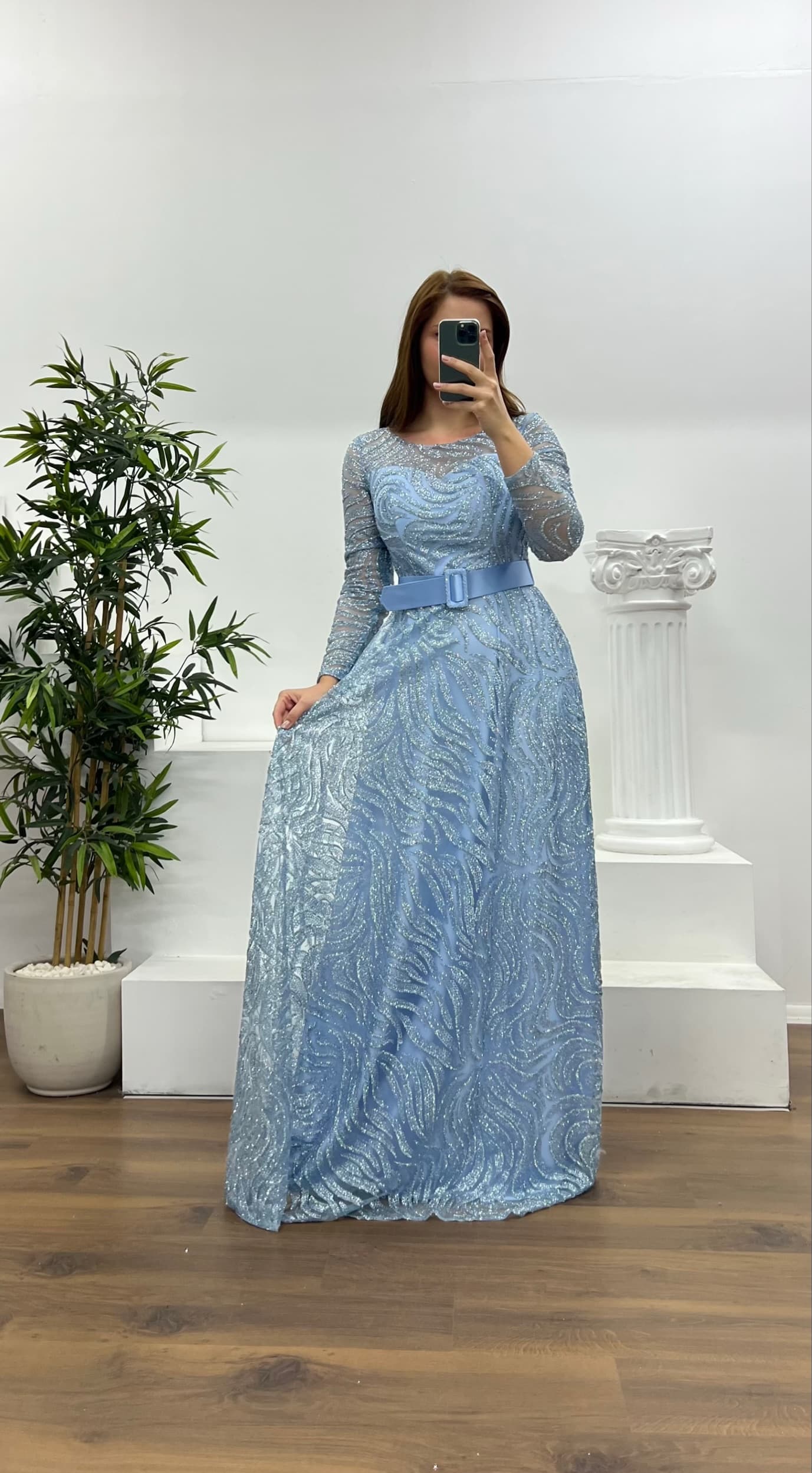 Belt Detail Evening Dress The product fits sizes 44–48, features padded cups, full lining, a back zipper closure, and a belt design. Length: 170–175 cm (may vary) Sleeve length: 60 cm Fabric: Glitter tulle (3% lycra, 97% polyester) Perfect choice to stand out with elegance at weddings, engagements, graduations, or special events.