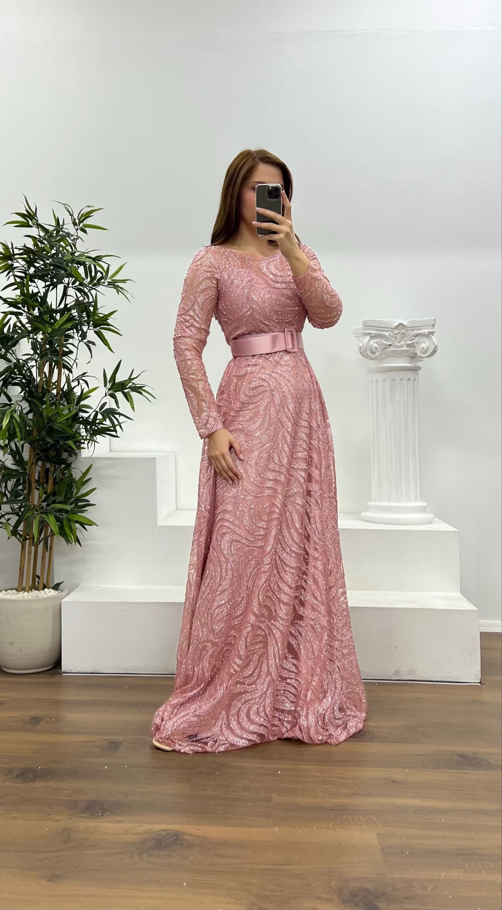 Belt Detail Evening Dress The product fits sizes 44–48, features padded cups, full lining, a back zipper closure, and a belt design. Length: 170–175 cm (may vary) Sleeve length: 60 cm Fabric: Glitter tulle (3% lycra, 97% polyester) Perfect choice to stand out with elegance at weddings, engagements, graduations, or special events.