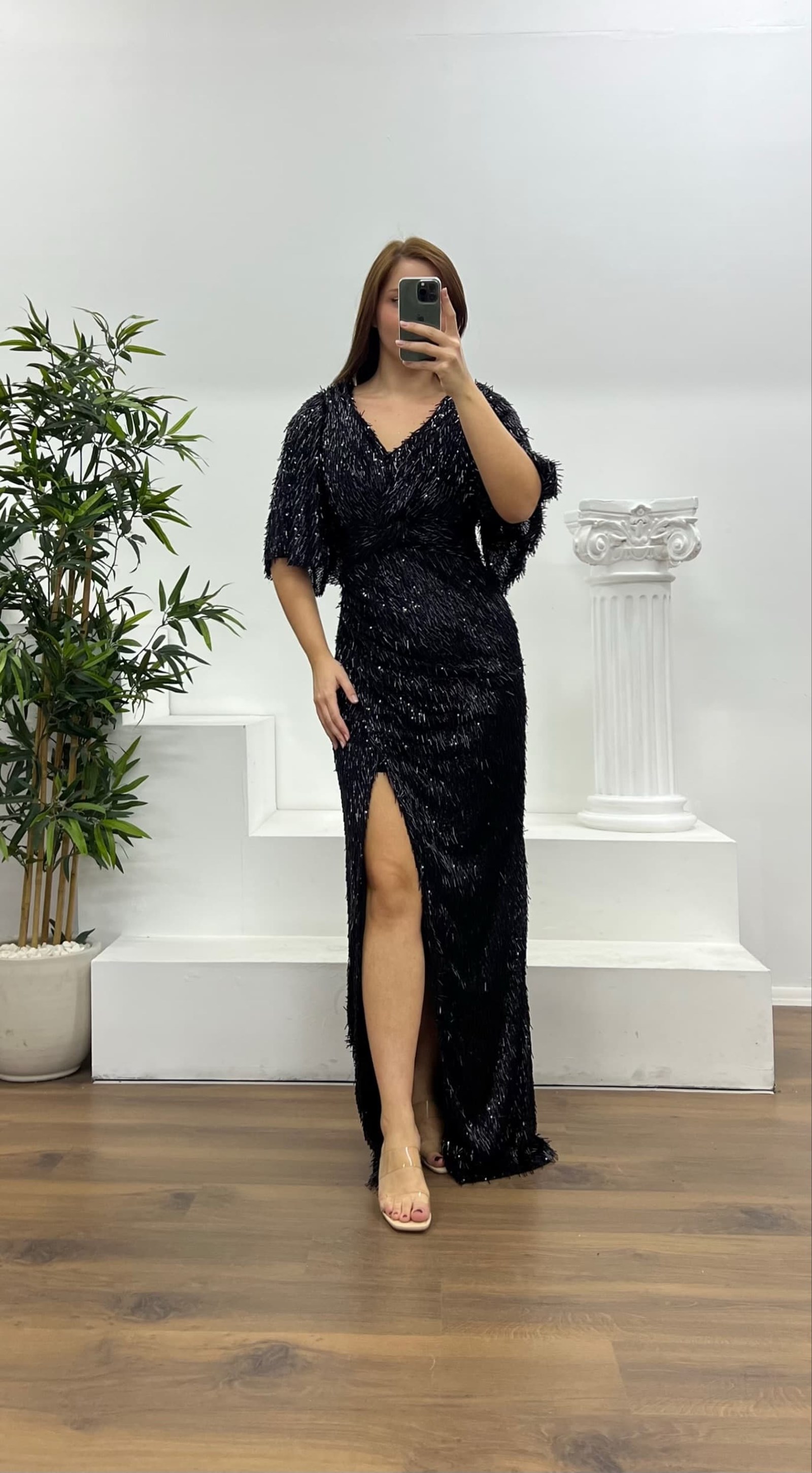 • Siyah Düğüm Detaylı Boru Boncuk Büyük Beden Abiye Elbise