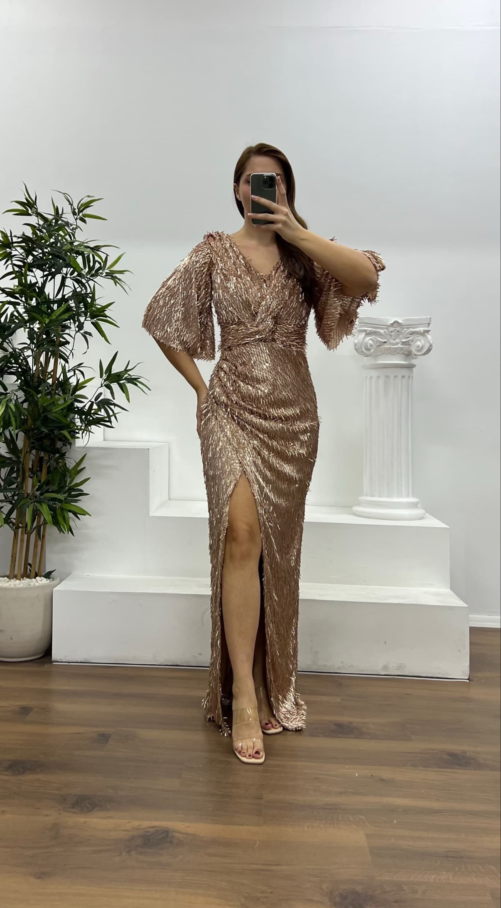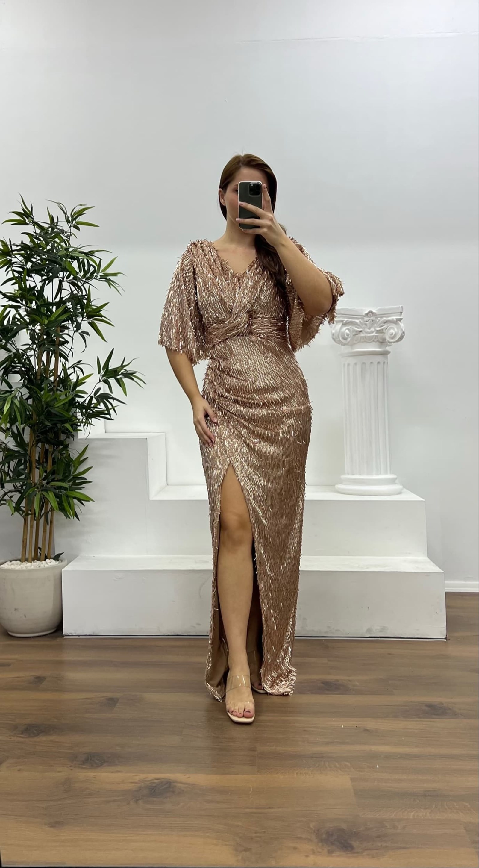 The knot-detailed tube bead evening dress is designed to fit sizes 44–48. It features padded cups, a lining, a back zipper closure, and a slit. Length: 170–175 cm (may vary slightly) Fabric: Sequin fabric, 100% polyester An ideal choice to stand out with elegance at weddings, engagements, graduations, or special events.