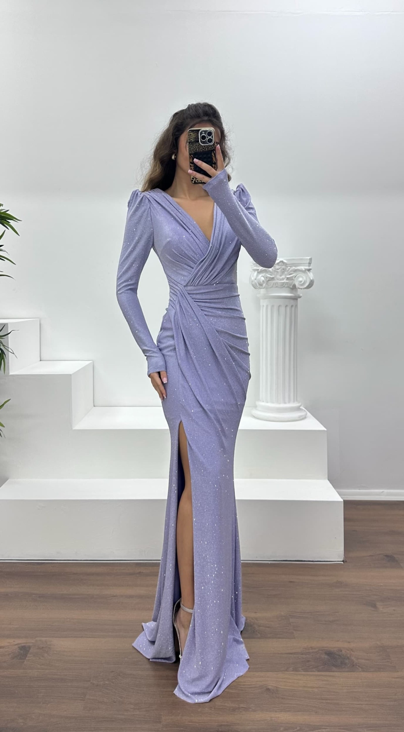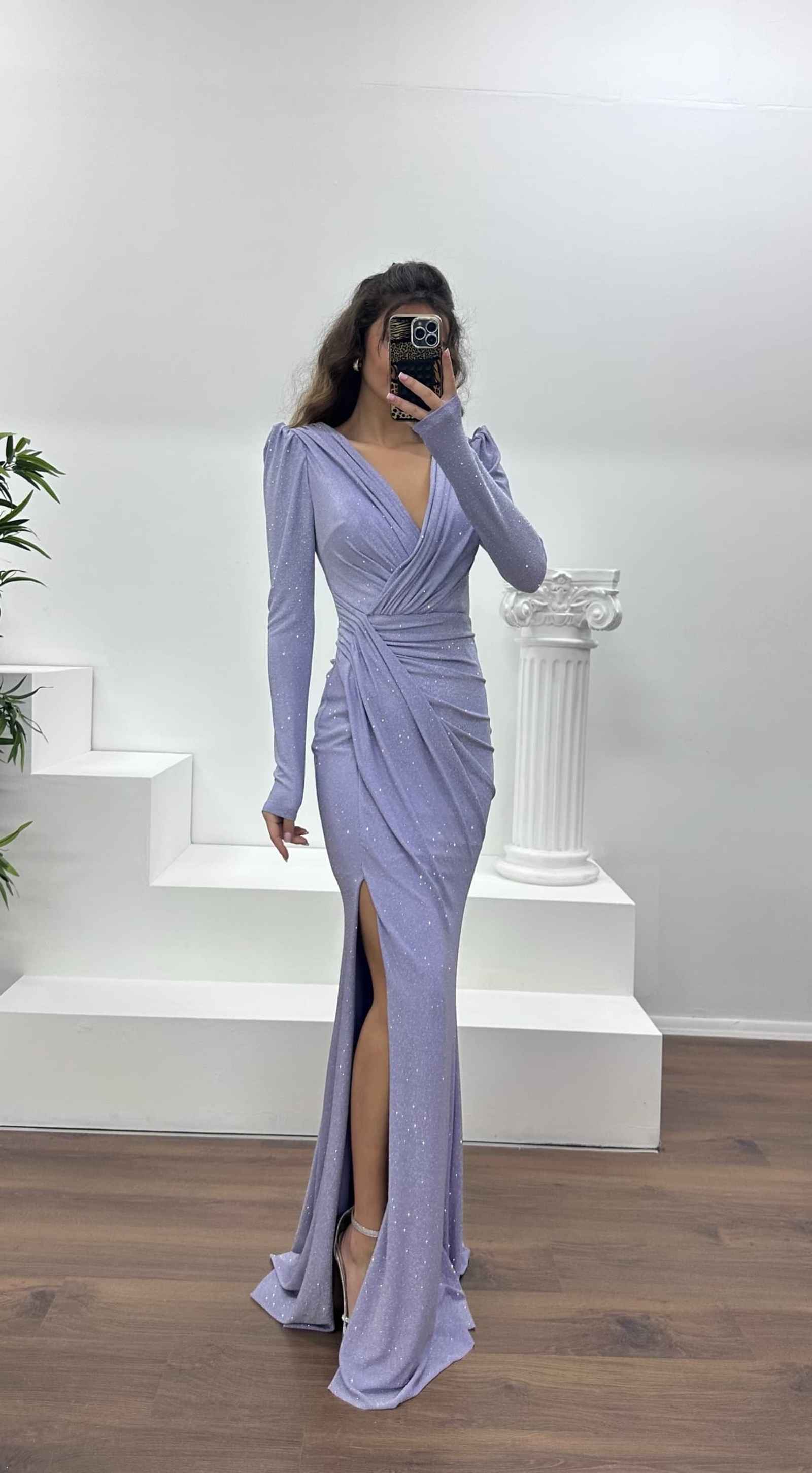 V-neck shimmering evening dress The product is suitable for sizes 36–44. Designed as an evening dress with padded bust, lining, back zipper closure, slit detail, and draped design. Dress length: May vary between 170–175 cm. Fabric type: Jersey, lycra, polyester An ideal choice to stand out with elegance at weddings, engagements, graduations, or special events.