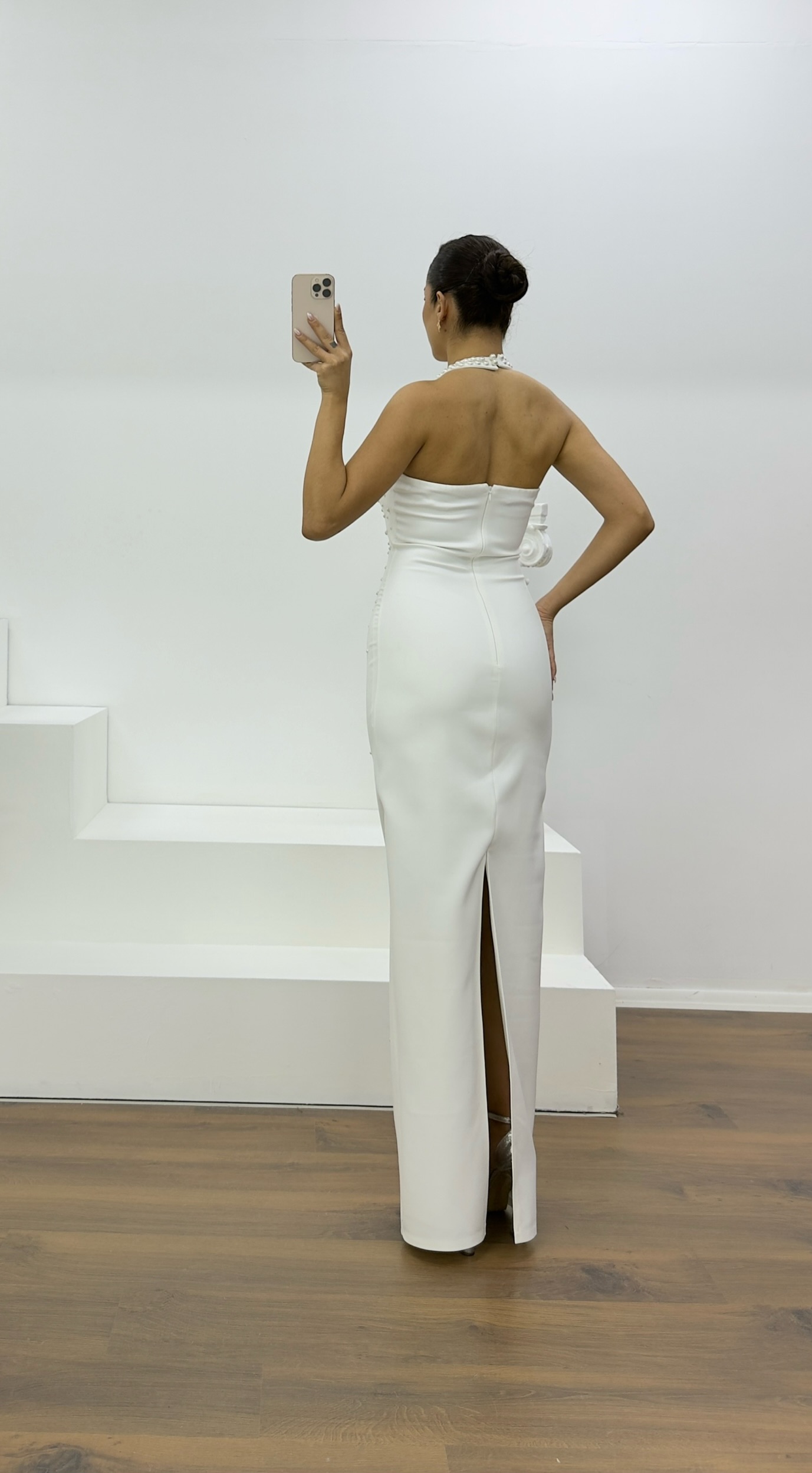 • Kemik Halter Yaka İnci Detay Abiye Elbise
