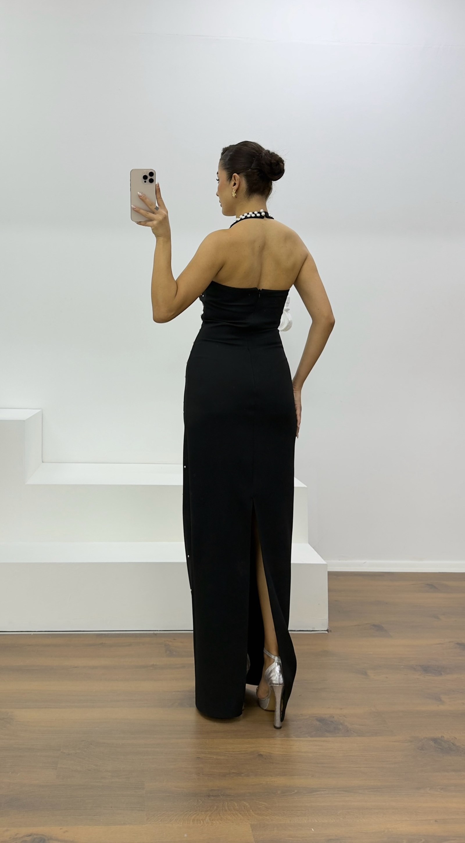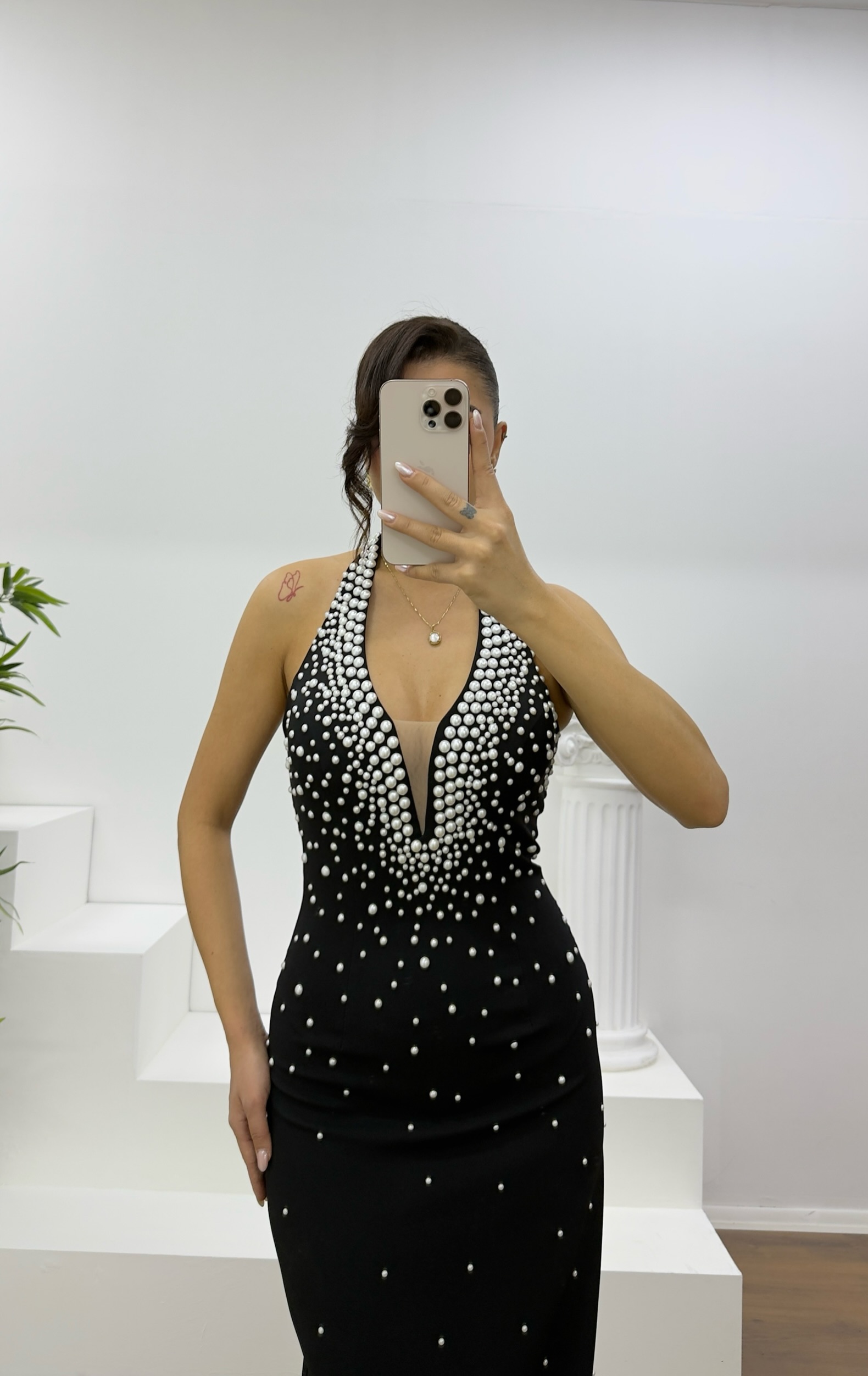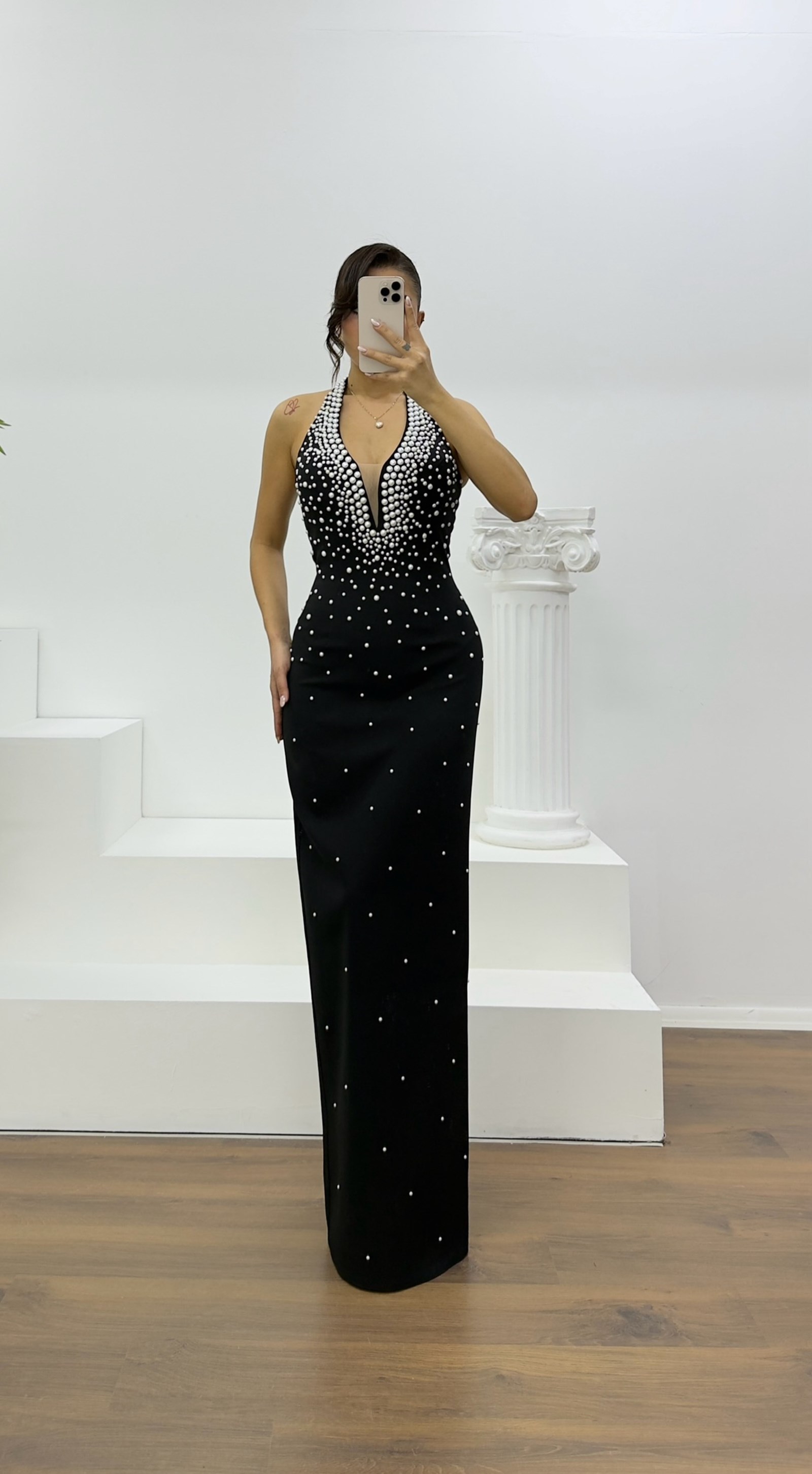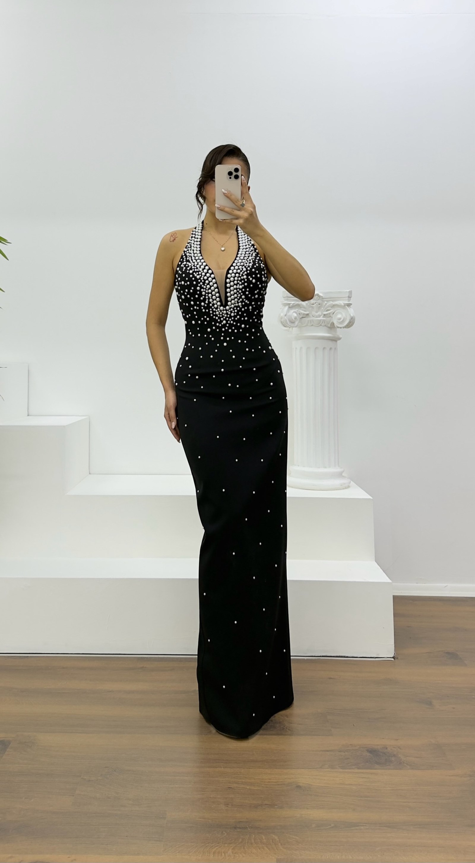 • Siyah Halter Yaka İnci Detay Abiye Elbise