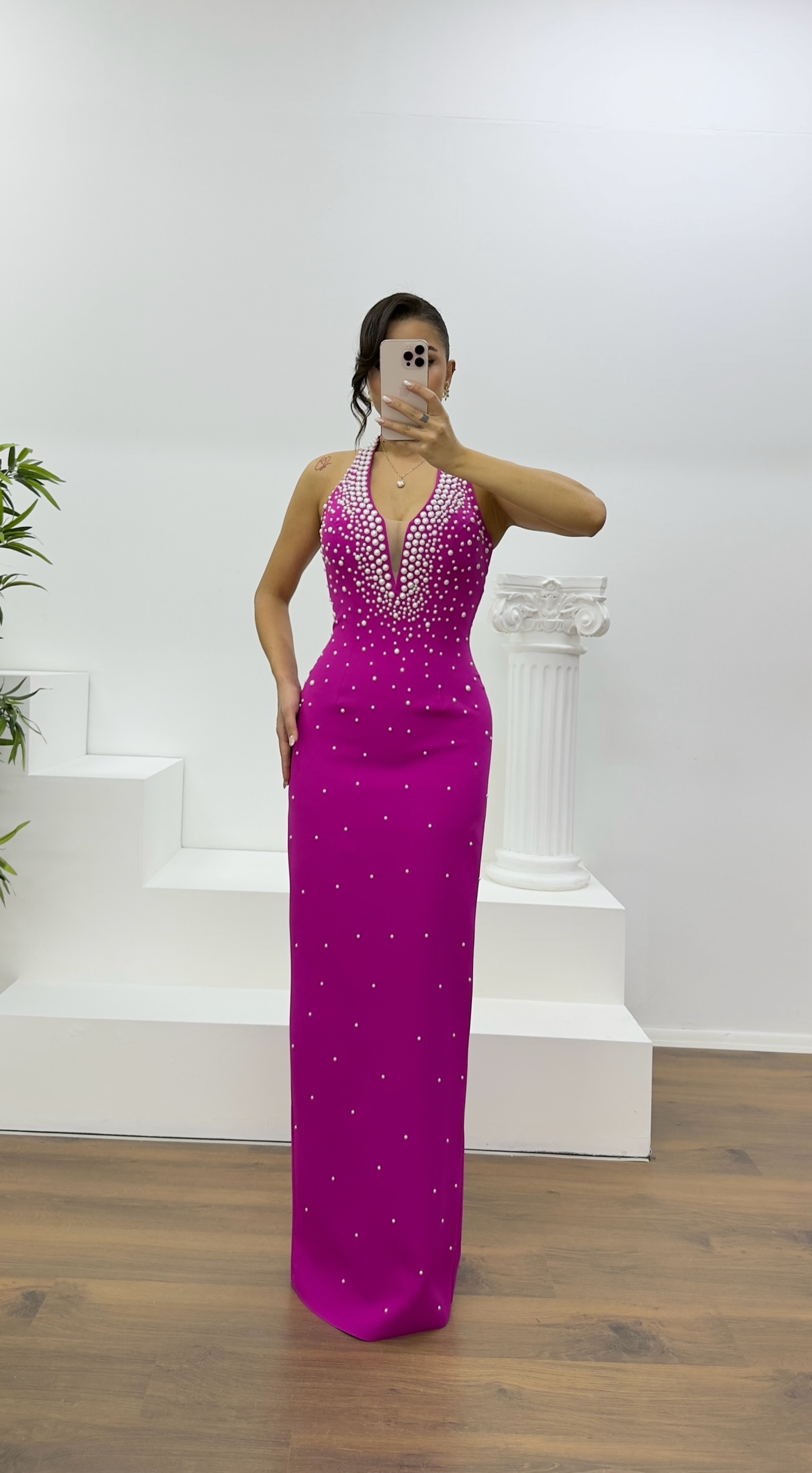 • Fuşya Halter Yaka İnci Detay Abiye Elbise