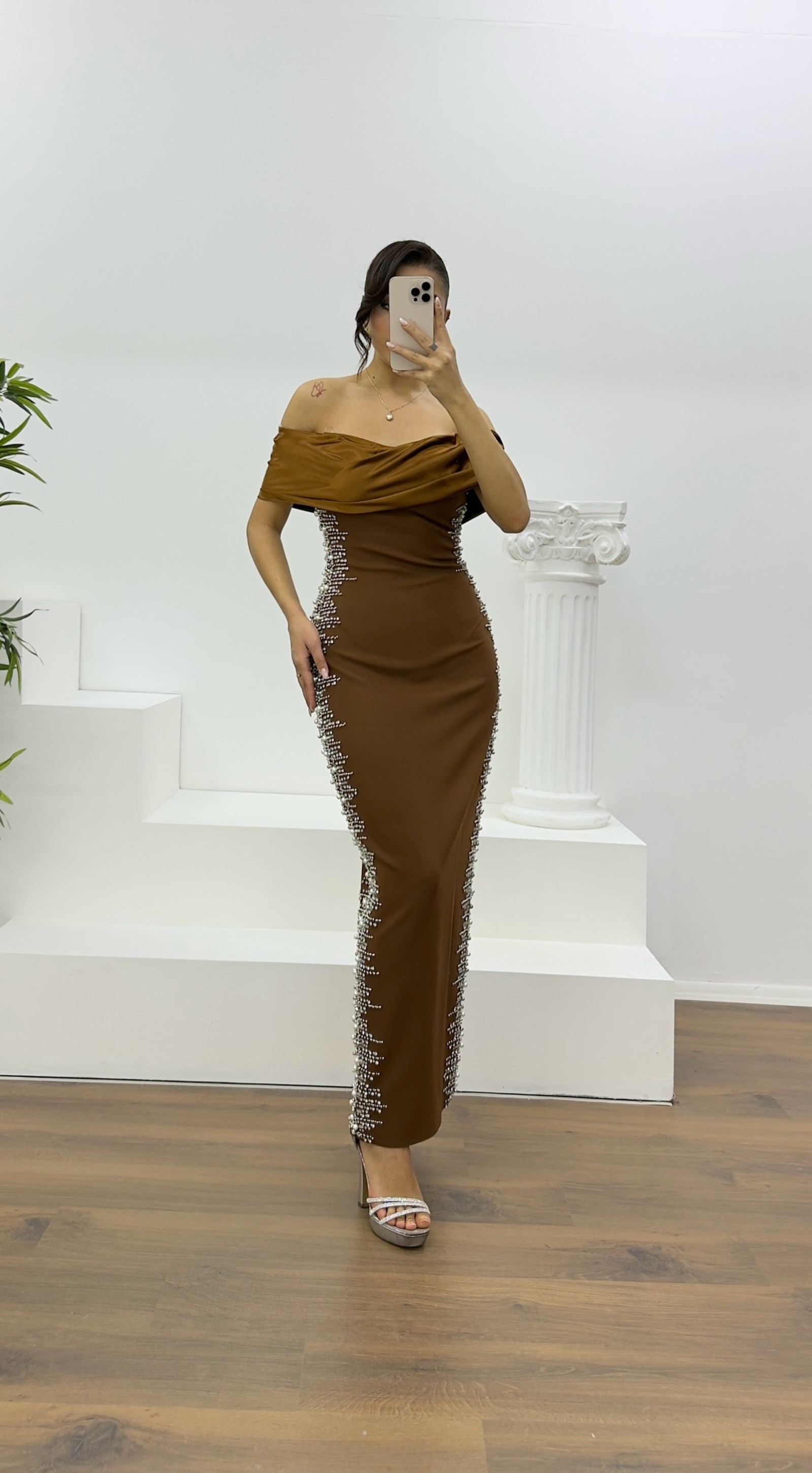 • Kahverengi Kayık Yaka Taş Detaylı Abiye Elbise