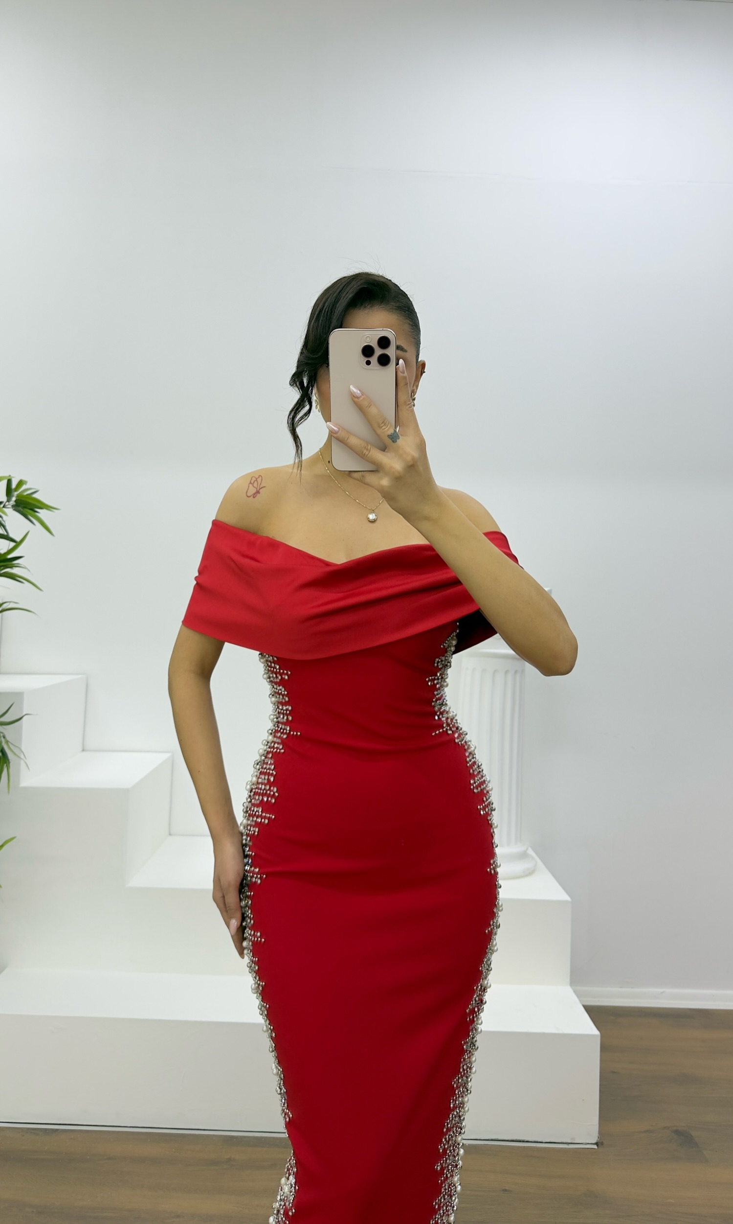 • Kırmızı Kayık Yaka Taş Detaylı Abiye Elbise