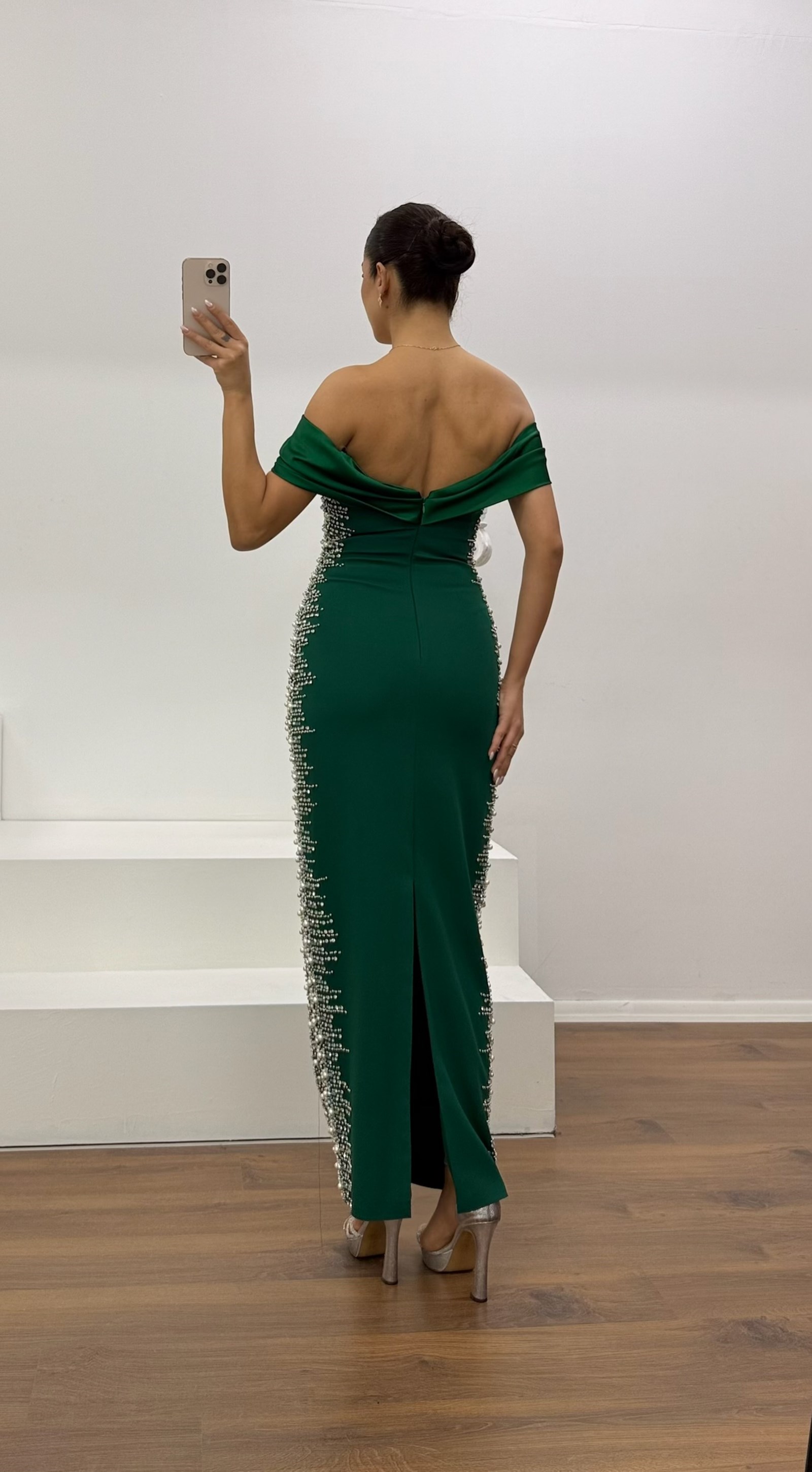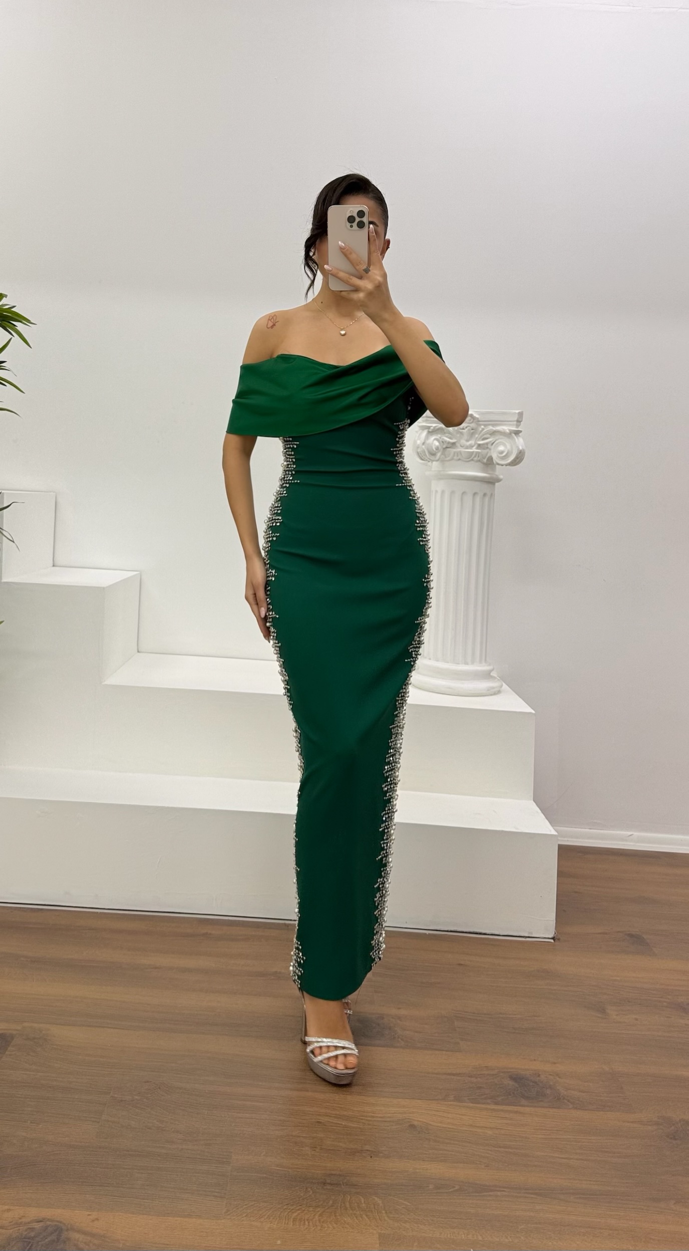 • Zümrüt Kayık Yaka Taş Detaylı Abiye Elbise