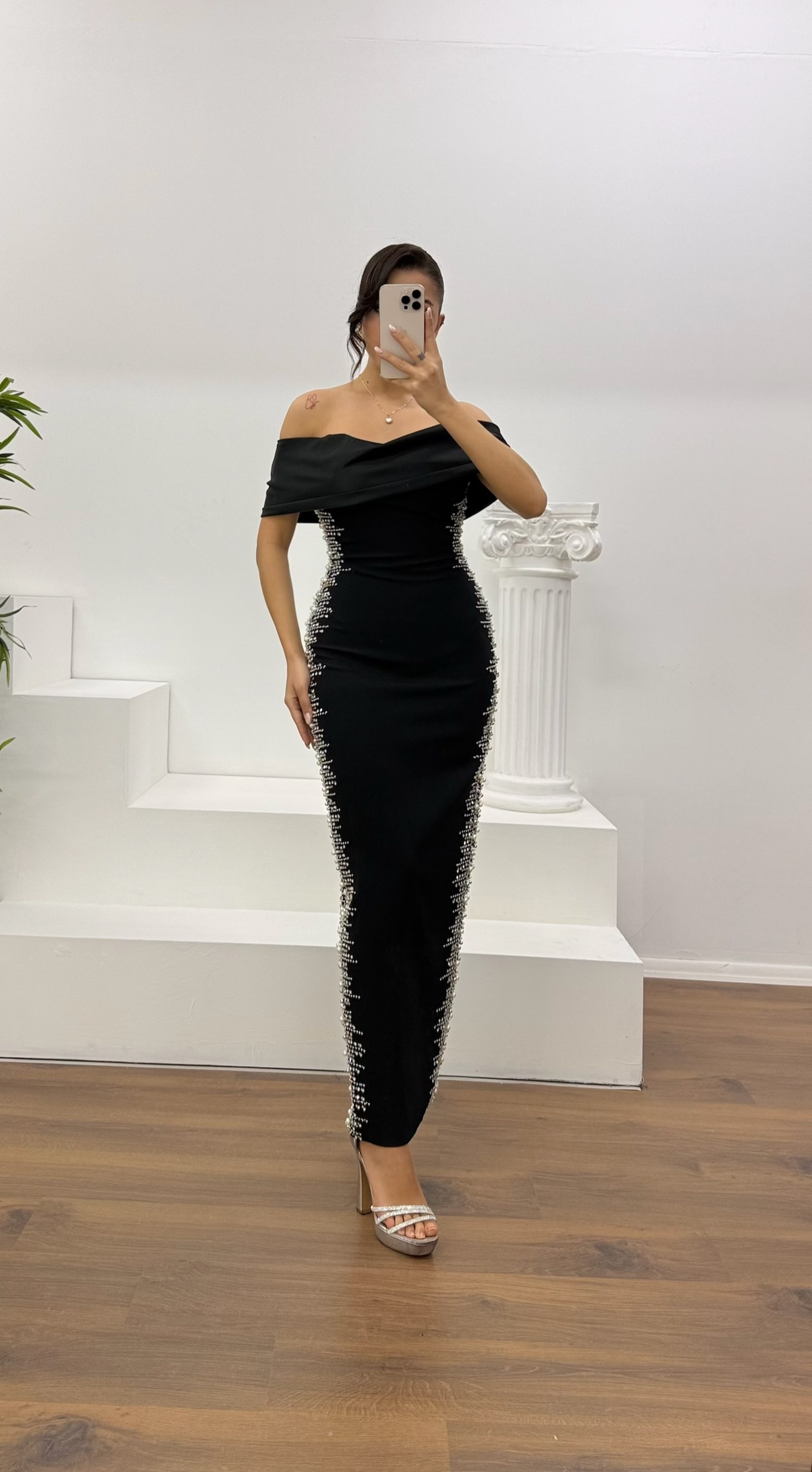 • Siyah Kayık Yaka Taş Detaylı Abiye Elbise