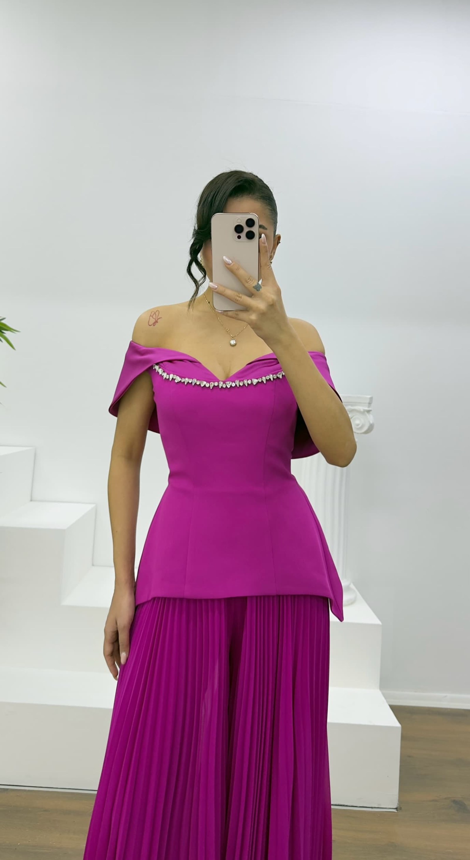 • Fuşya Kayık Yaka Piliseli Abiye Tulum